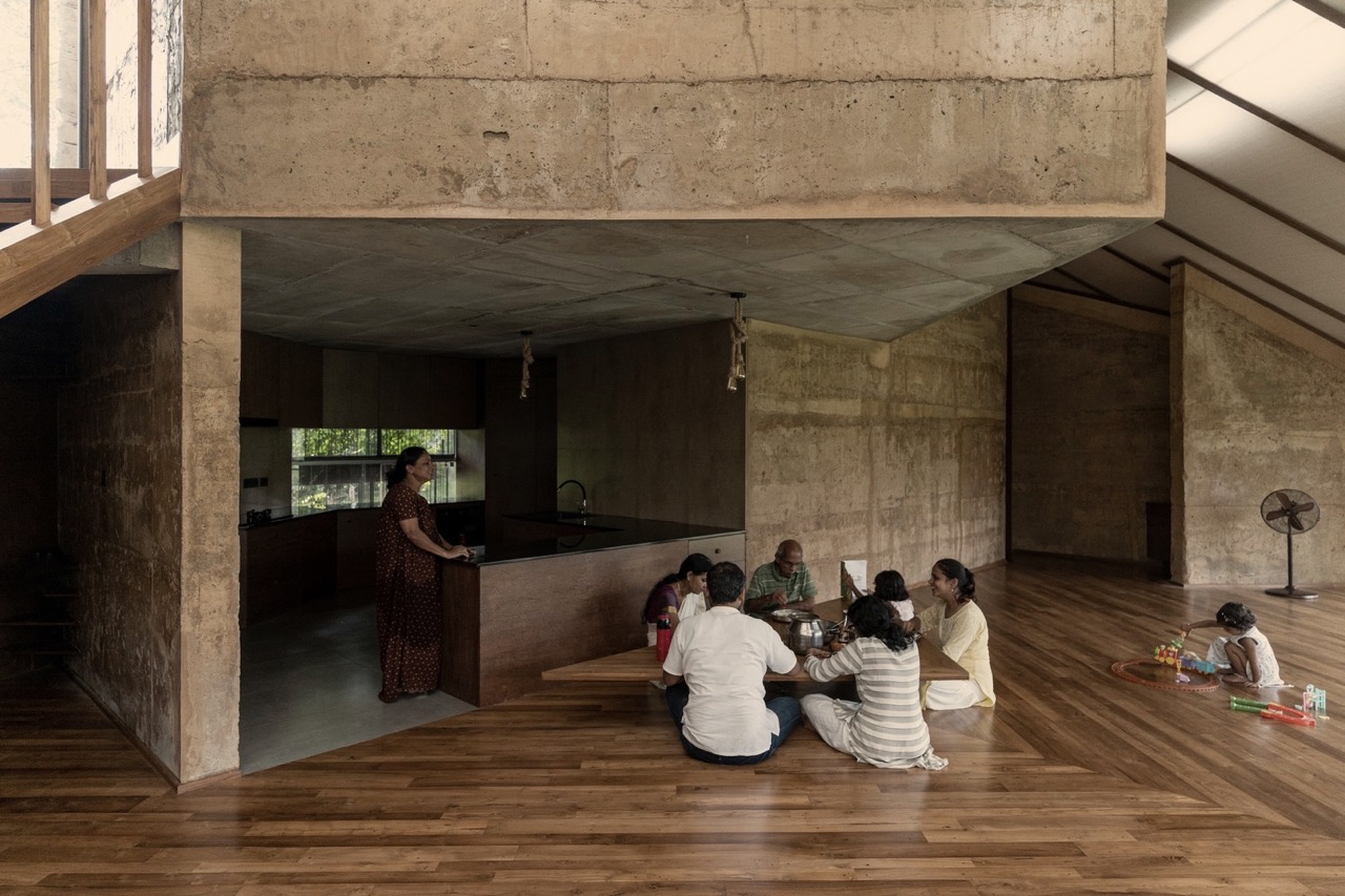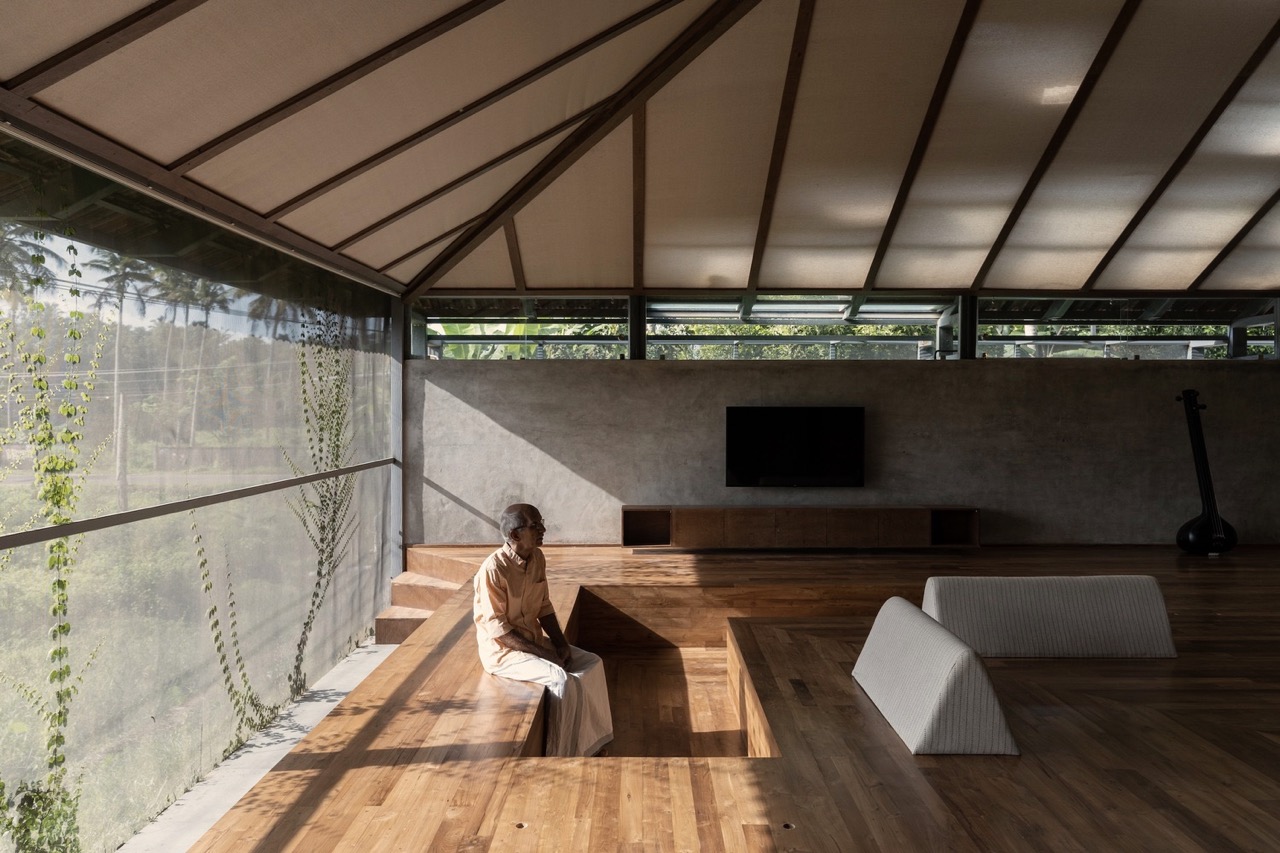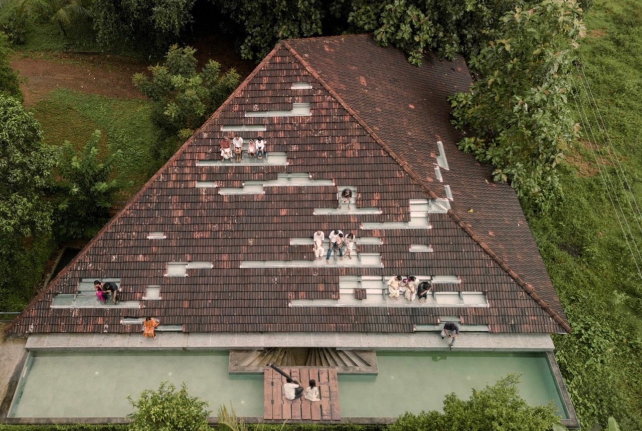 Looking at the historic homes in the area, the architects wanted to design a structure that would stylistically and functionally be familiar to the nearby community. Taking advantage of the landscape, a majestic sloping tile roof presents itself as an “outdoor” space, that doubles as a sheltered seating area. Its form and build is reminiscent of traditional Kerala architecture. This design choice pays homage to the regional context while also serving functional purposes of insulation and temperature regulation.