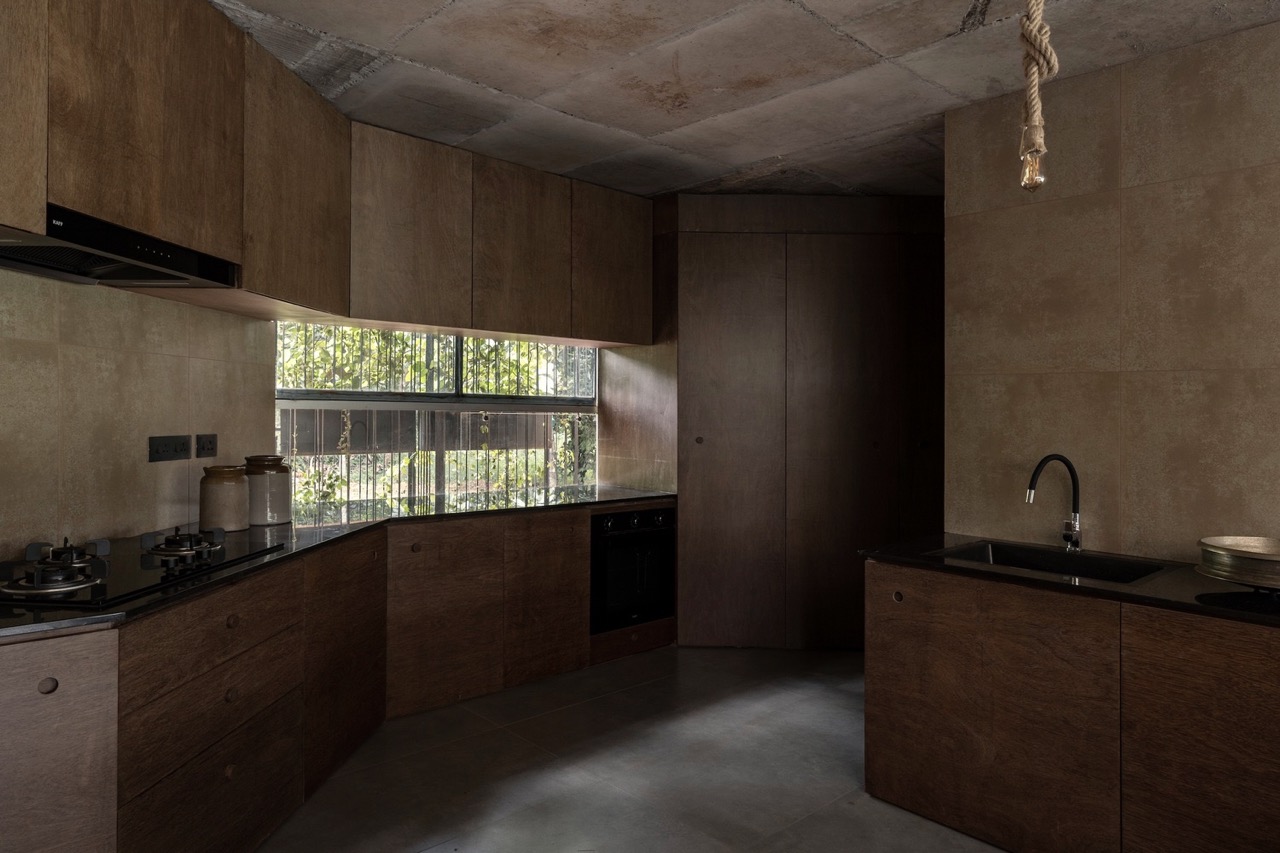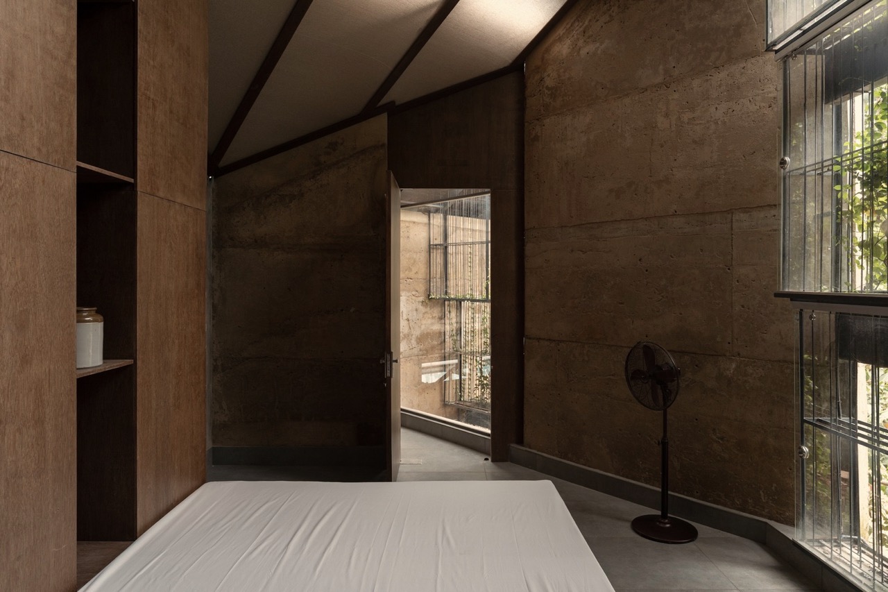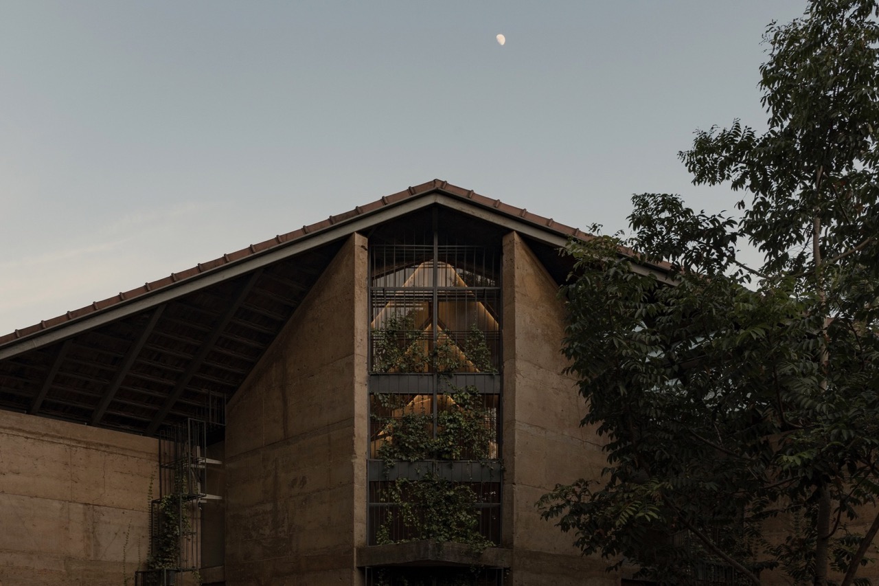 Along its elevation, the structure’s profile splits down the middle by a curtain of greenery that gracefully cascades down repurposed metal racks. This “green screen” adds a biophilic touch and filters the harsh afternoon sun. The walls are then angled around this focal point, centralizing it further while slimming the structure’s massing. The brutalist exterior walls are made with a Shuttered Debris Wall Technique, utilizing recycled waste and soil from the site that captures the appearance of a raw concrete finish.