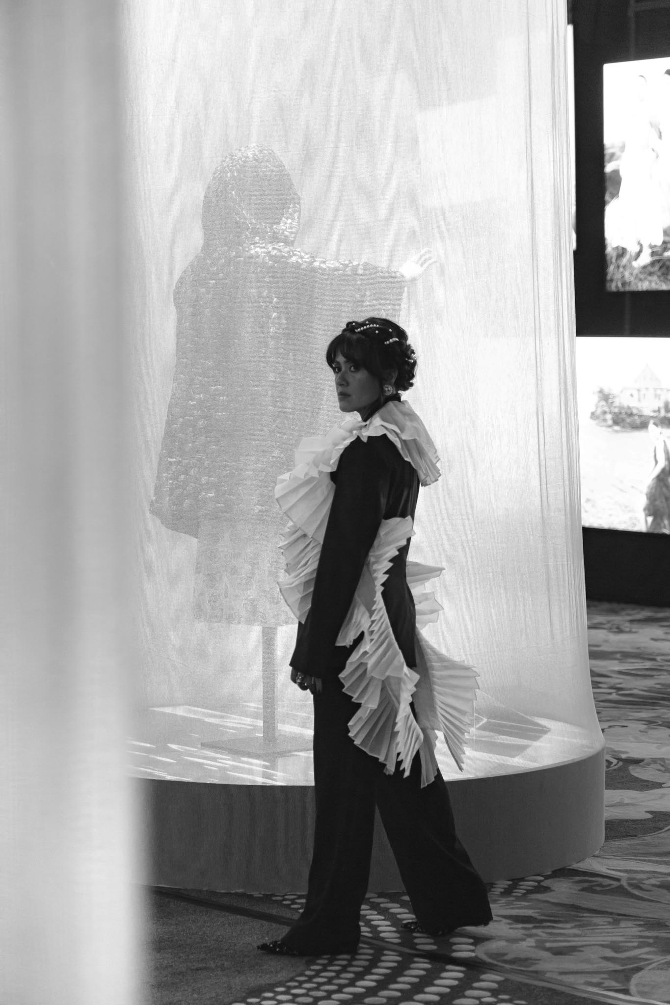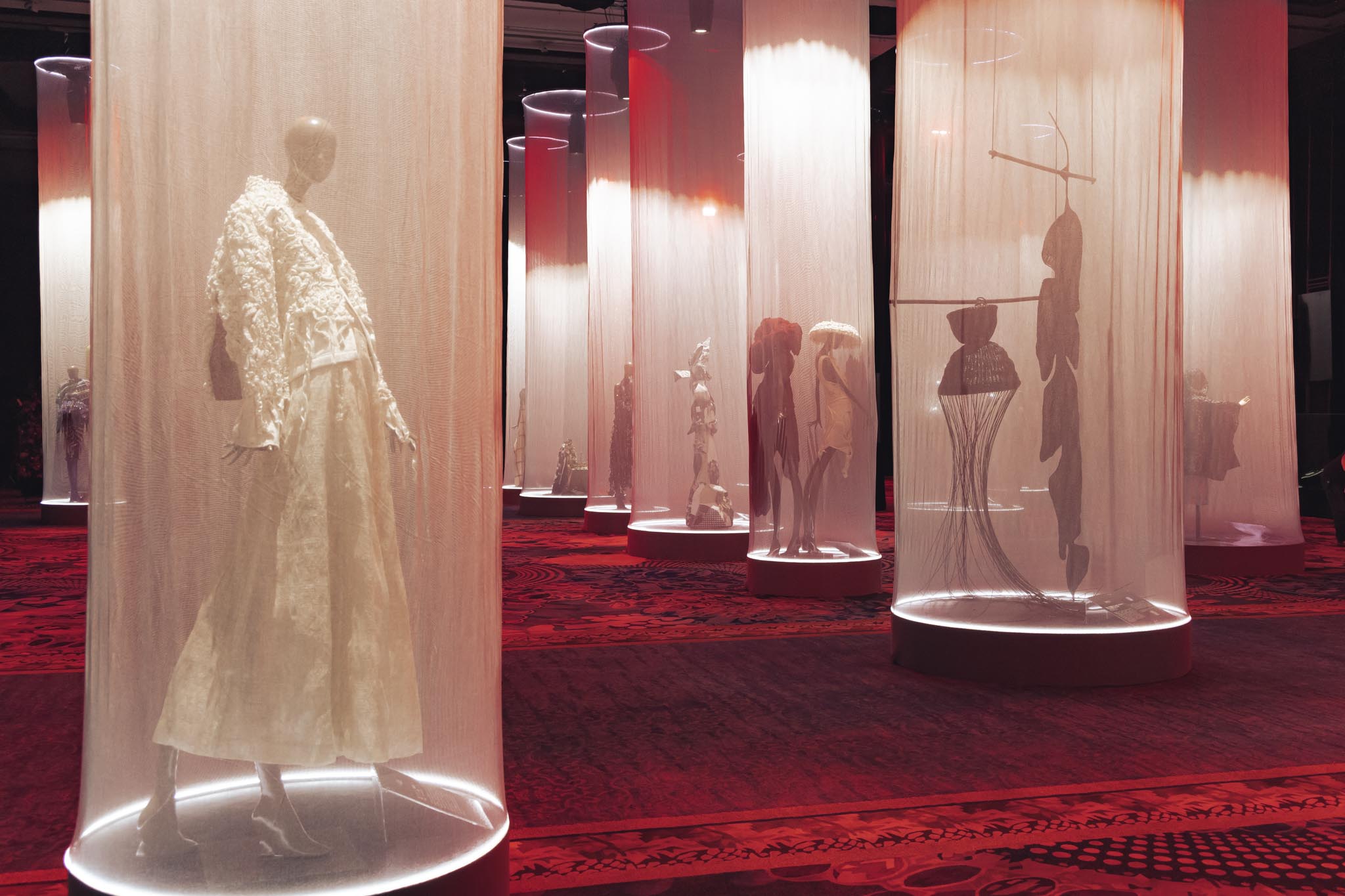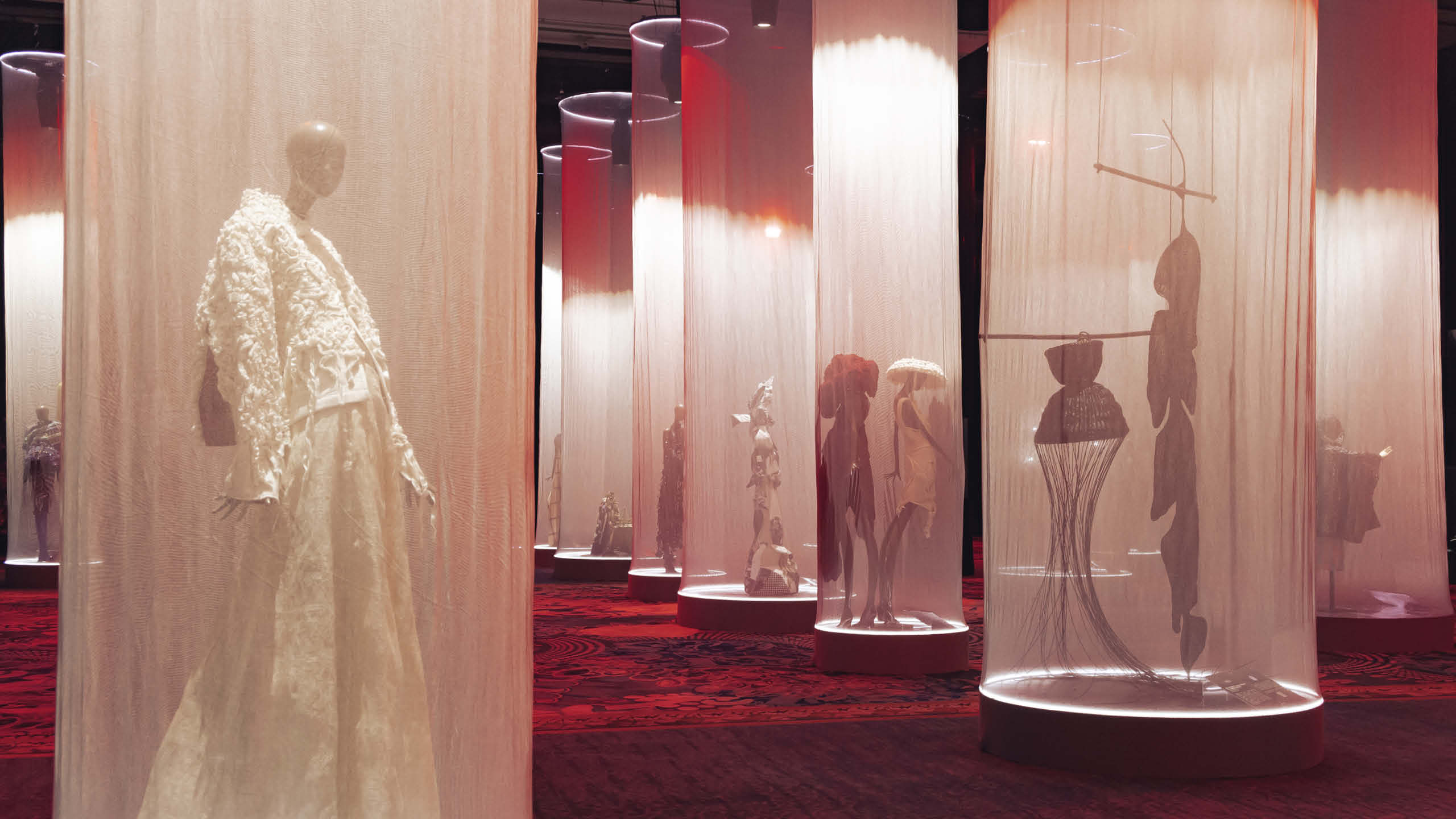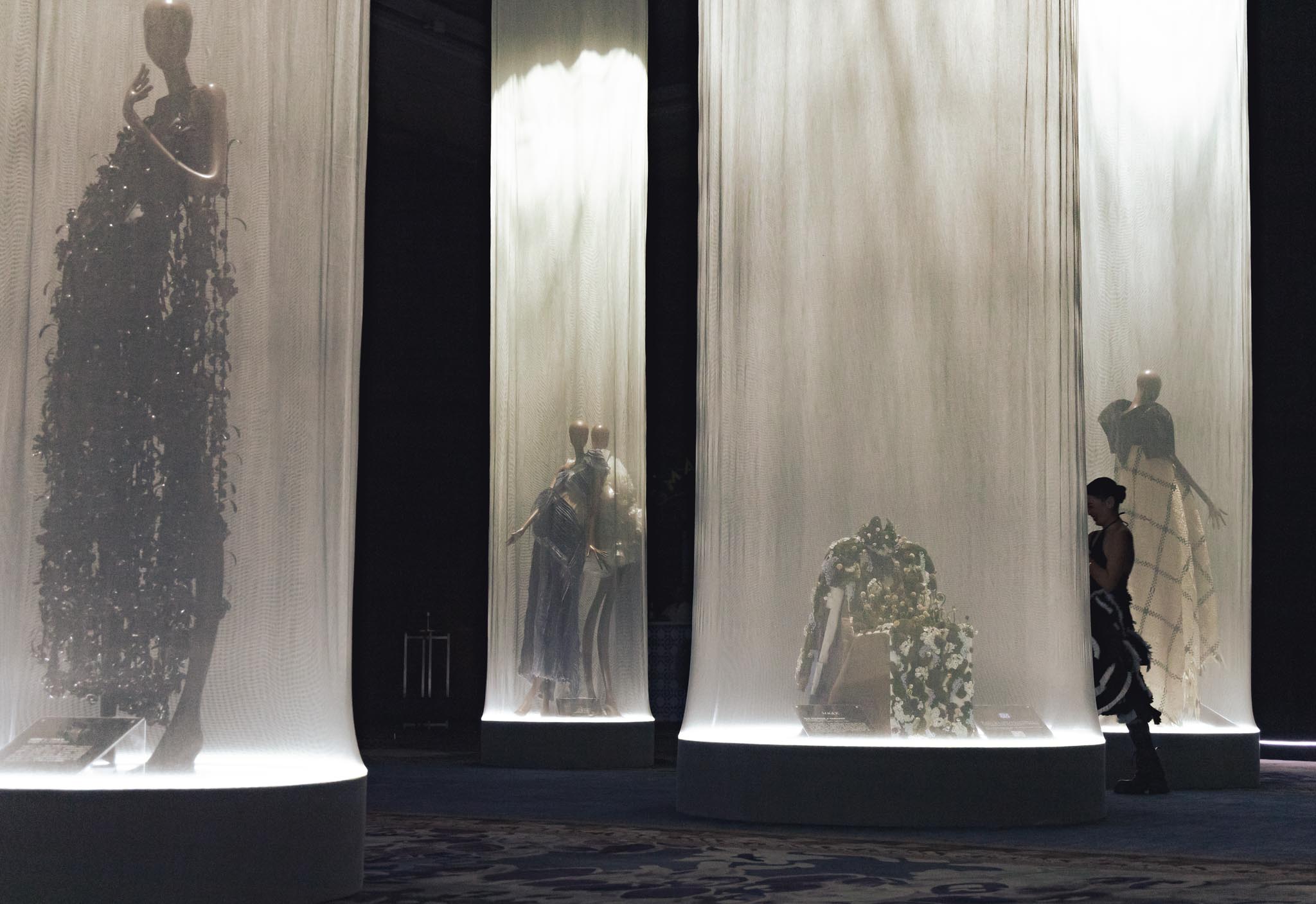 This enchanting exhibition was located in one of Shangri-La’s grand ballrooms. Upon entering, guests are greeted with hypnotic lights that highlight the artists’ work clad within thin cylinder screens. These are thin enough to protect and bring the focus to the different ways these artists reinterpreted fashion and art by recalling our roots and giving it modern flair.