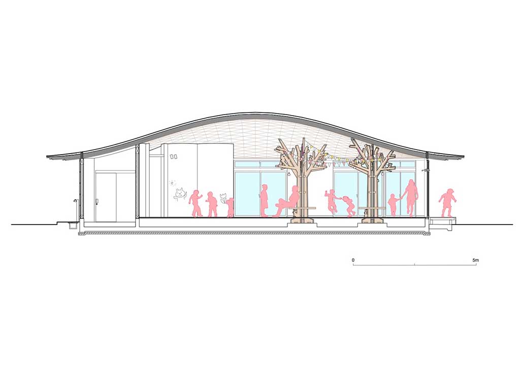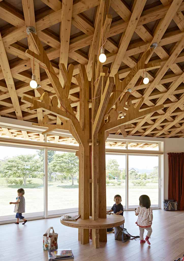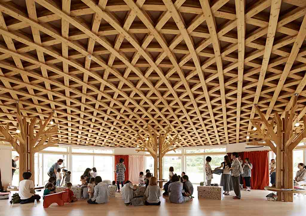 The main feature of the Soma Children’s House is its curving wooden lattice roof resembling a large straw sun hat. The roof is supported by a series of tree-shaped columns built from cross-laminated timber. This sustainable material is composed of planks of sawn, glued, and layered wood. As the layers of wood are joined together at perpendicular angles, the structural rigidity is obtained in both directions. On the branches of the tree columns are wooden animals like owls, birds, and squirrels to fascinate children even more.