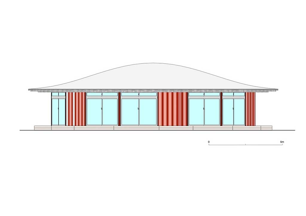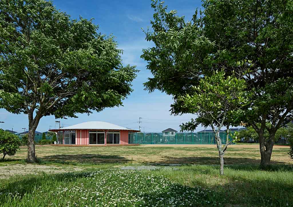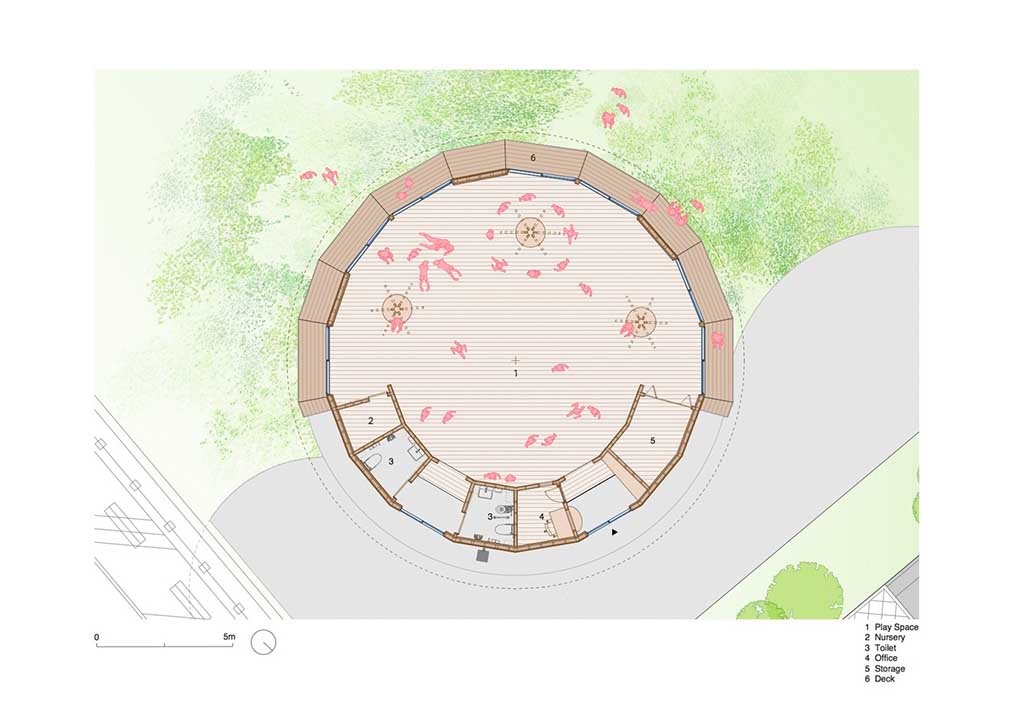 Having a circular plan, the community house exhibits a façade with a simple look having large glass walls matched with red, pink, and white strips timber panels. These striking timber panels simply catch the children’s attention, bringing excitement and joy. The house is also strategically placed near natural greens helping the children have refreshing sightlines even if they’re inside the said house. As one approaches the structure and starts to step inside, a whole new charm welcomes its visitors.