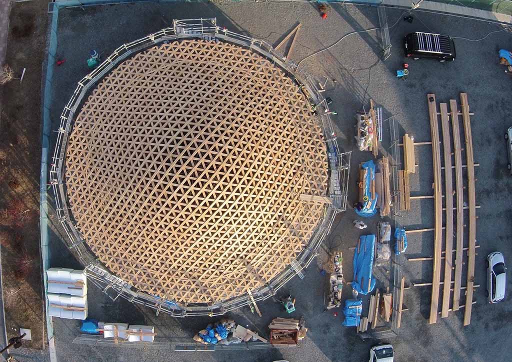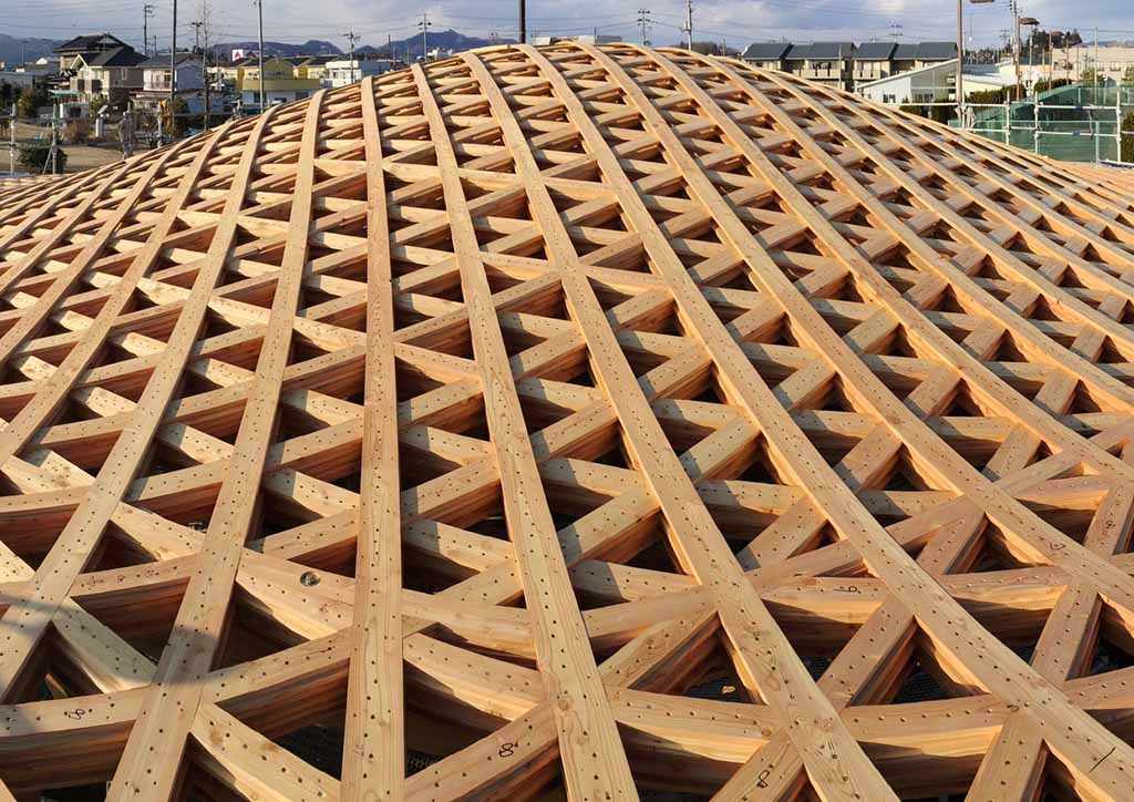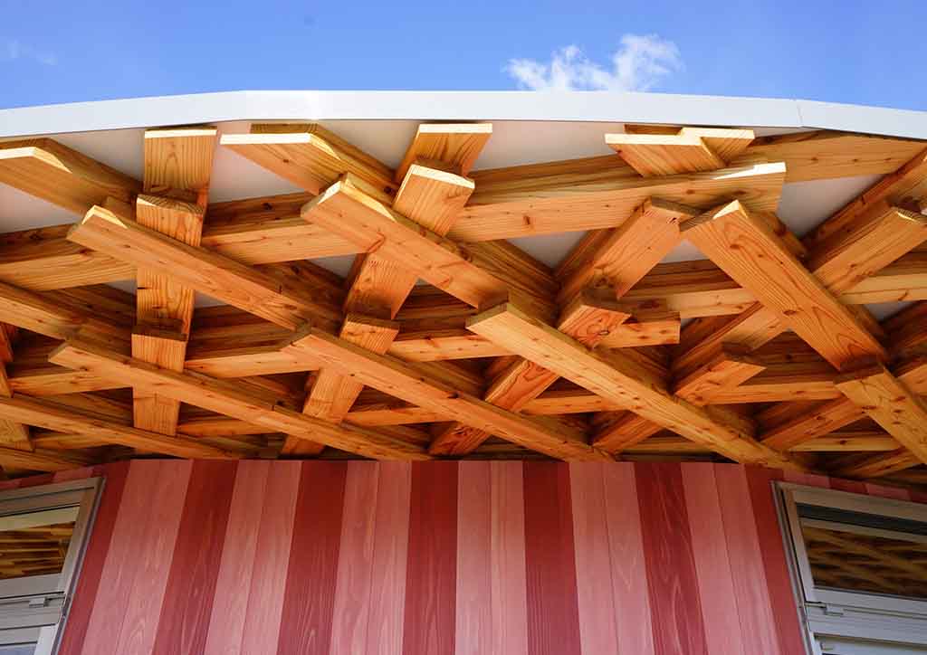 The roof was made of 9 layers of timber slats achieving the needed strength to hold the entire roof. Smaller pieces of wood and engineered joints were used to have each slat extend all the way across the structure, with the longest spanning to 20 meters. Also, each layer is rotated 120 degrees. Towards the eaves of the building, the lattice layers are slowly diminished, due to the reduced loads, resulting in a very elegant and lightweight cantilever.
