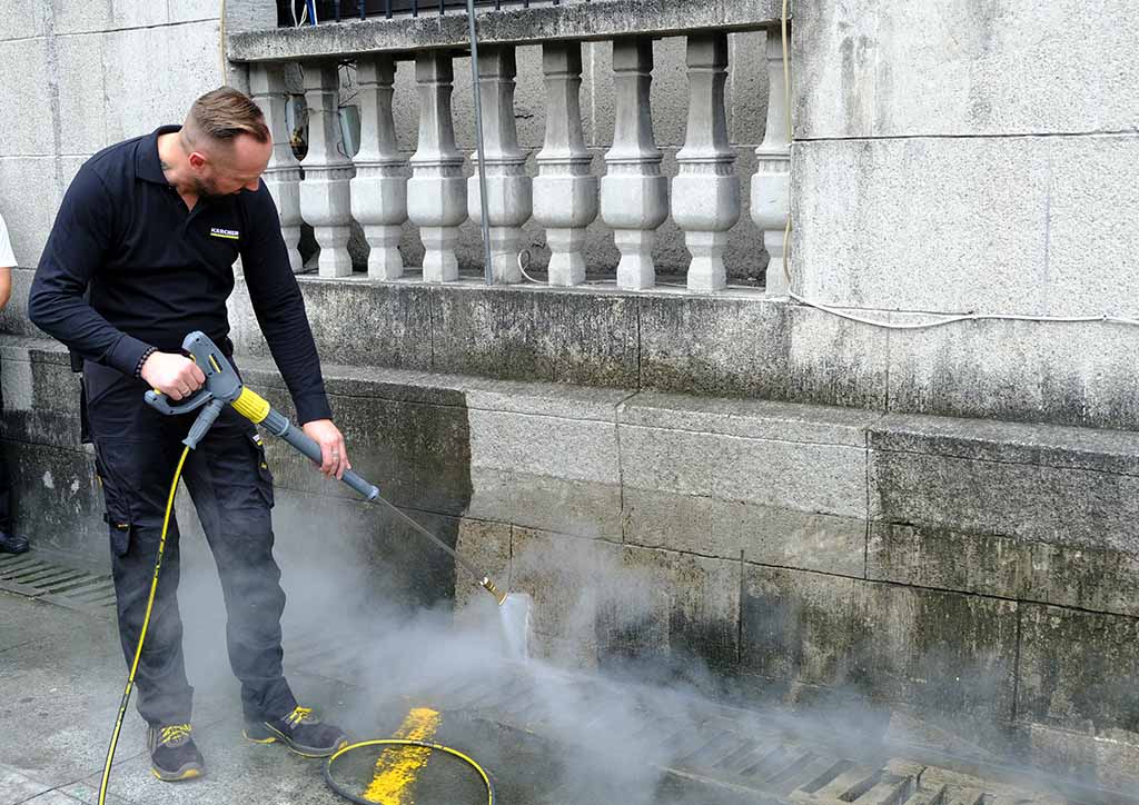 Kärcher uses a hot steam system, one that is known to be the most effective technique in preserving and restoring old structures made out of mineral materials. Its high temperature delays the reintroduction of organic vegetation. Moewes demonstrated their two main cleaning systems: hot steam and high-pressure. Hot steam is used for sensitive stones like adobe and limestone while high-pressure is used for strong stones such as granite.