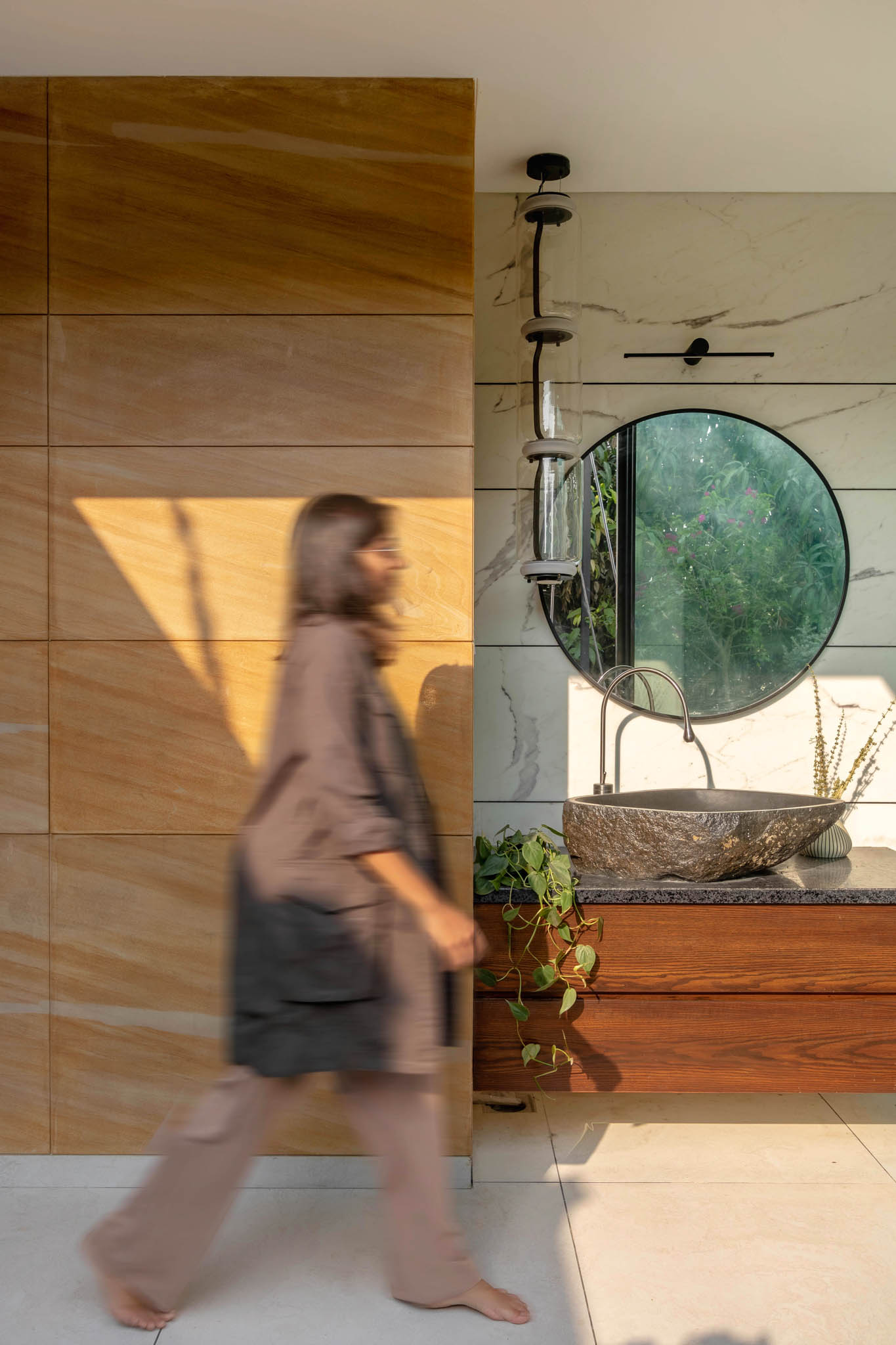 Living up to its name, the architects adorned the entire living room walls with yellow teak sandstone cladding. To blur the lines between the indoor and outdoor spaces, a corner window, free of obstructive elements, divides the living room and the terrace.
