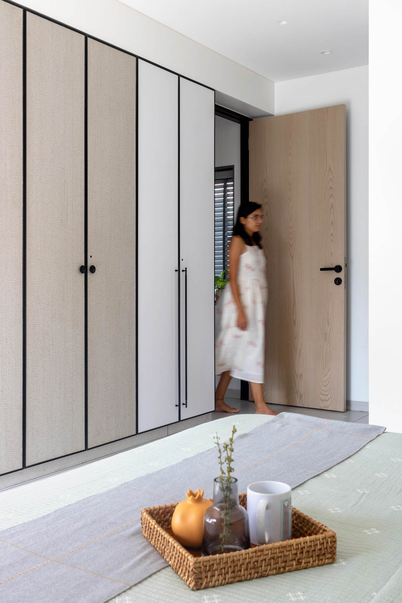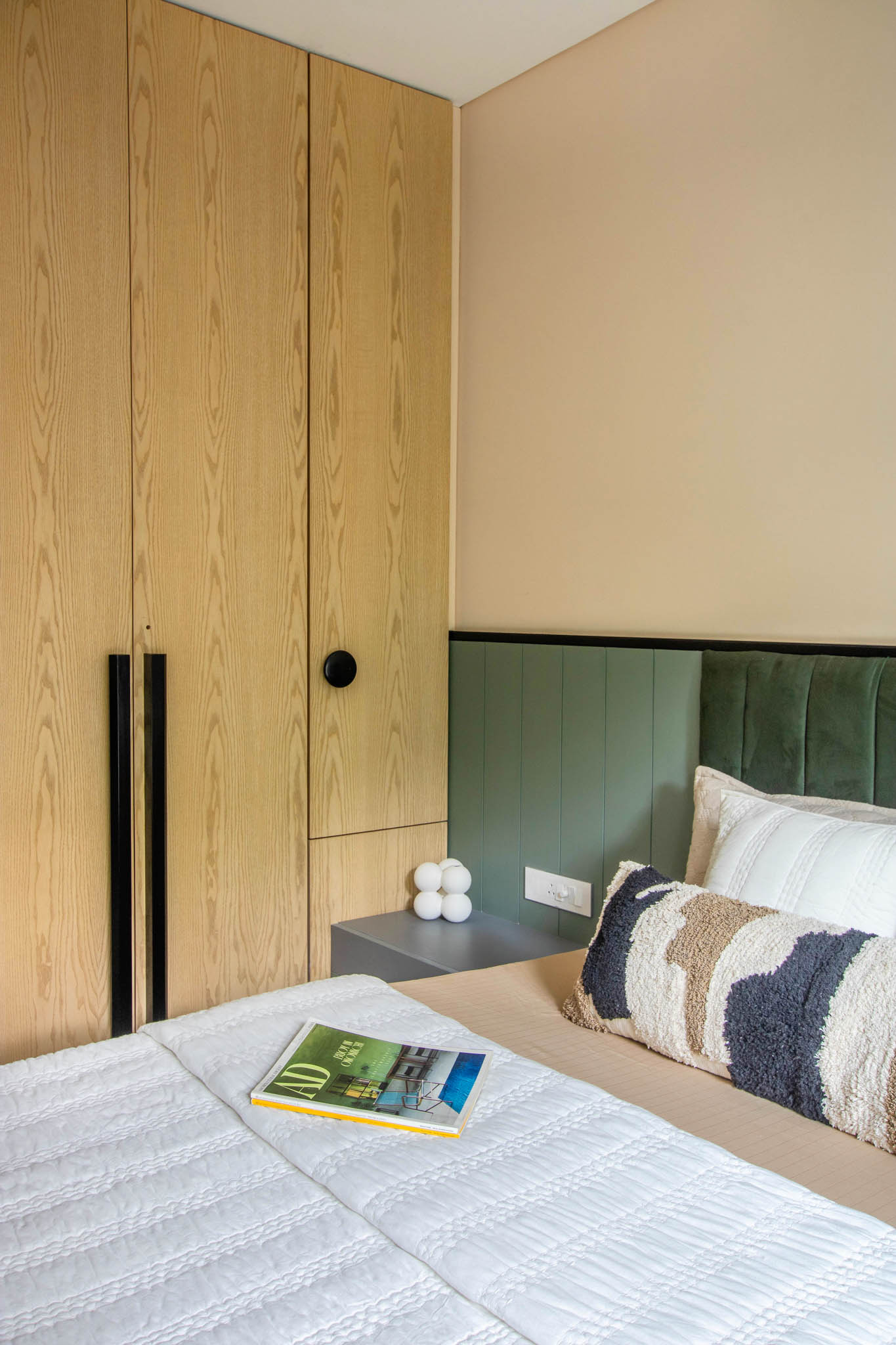 Beside the son’s bedroom is the guest room that doubles as the client’s parent’s room when they visit. It features an ombre green closet to match the apartment’s setting and color. While it’s the smallest bedroom, it exudes a warm and inviting ambiance with its nature-inspired design.
