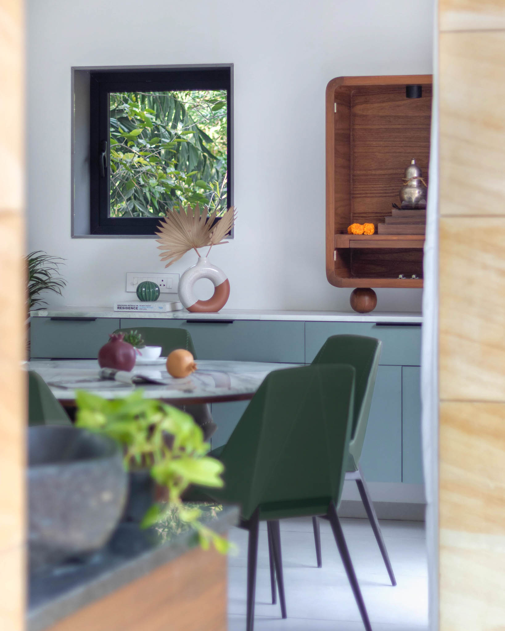 The dining area includes a customized table with a cylindrical wooden base and an Indian marble top. With its brown and sage green grains, the table complements the adjacent crockery and small Puja units.