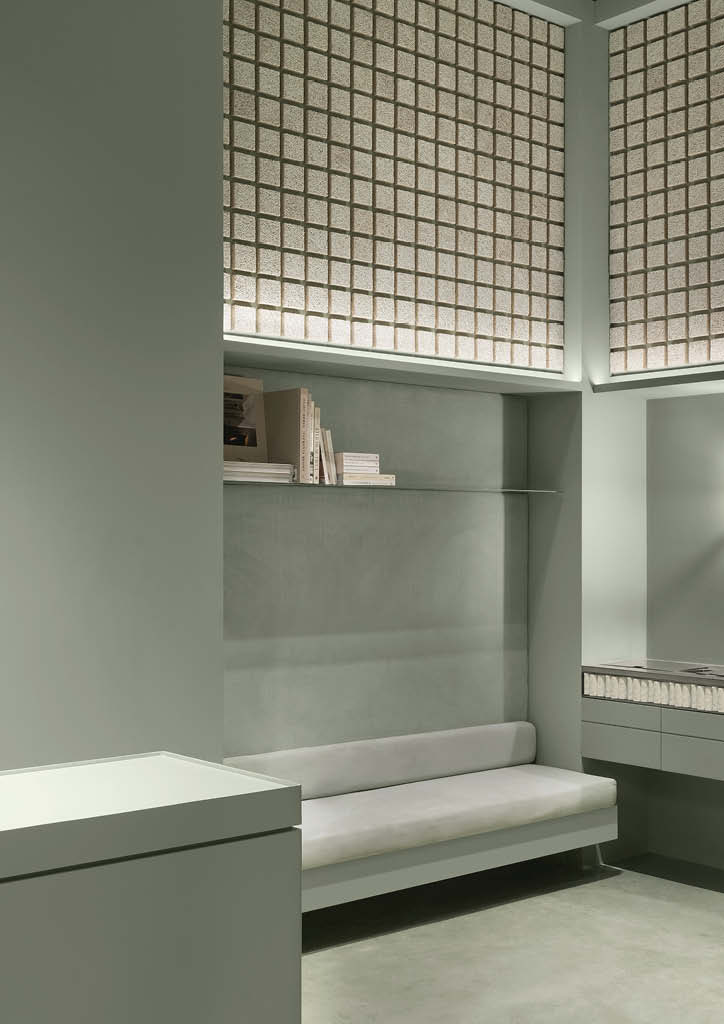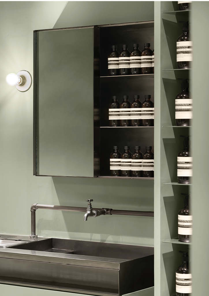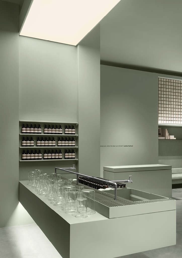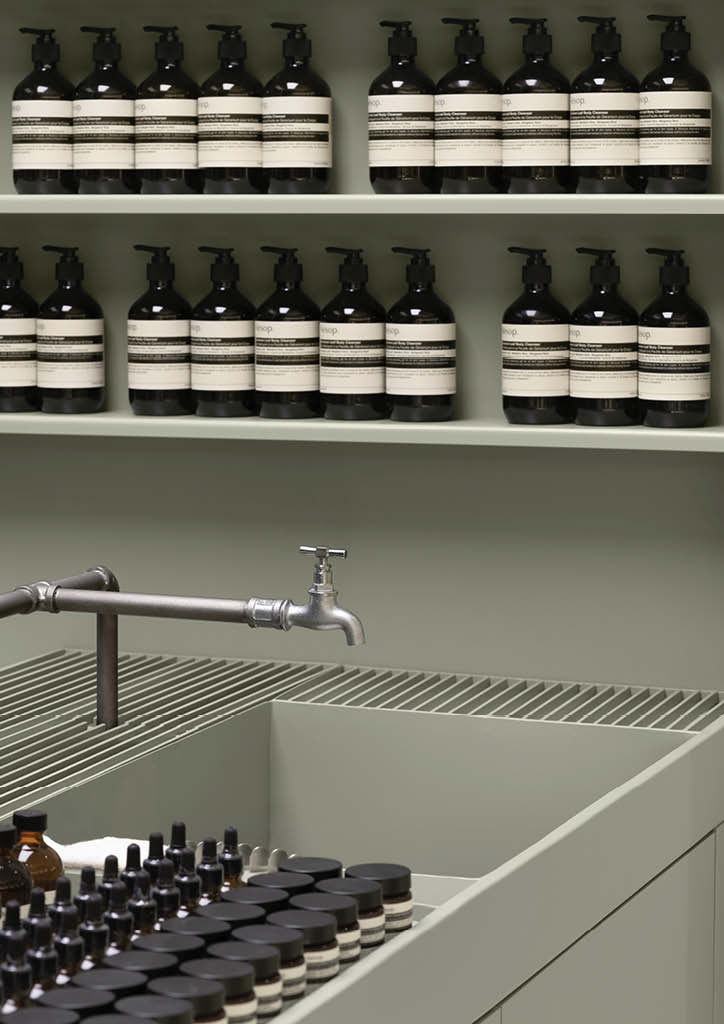 Aesop believes that the best way for customers to engage with the brand is through direct skin contact with their products. For the team, the most engaging way to do this is at one’s own pace in the uplifting environment of the brand’s stores. The generous central trough becomes a communal podium for encounters with Aesop’s skin, hair and body care formulations, while an individual basin at the rear of the store accommodates more intimate consultations.