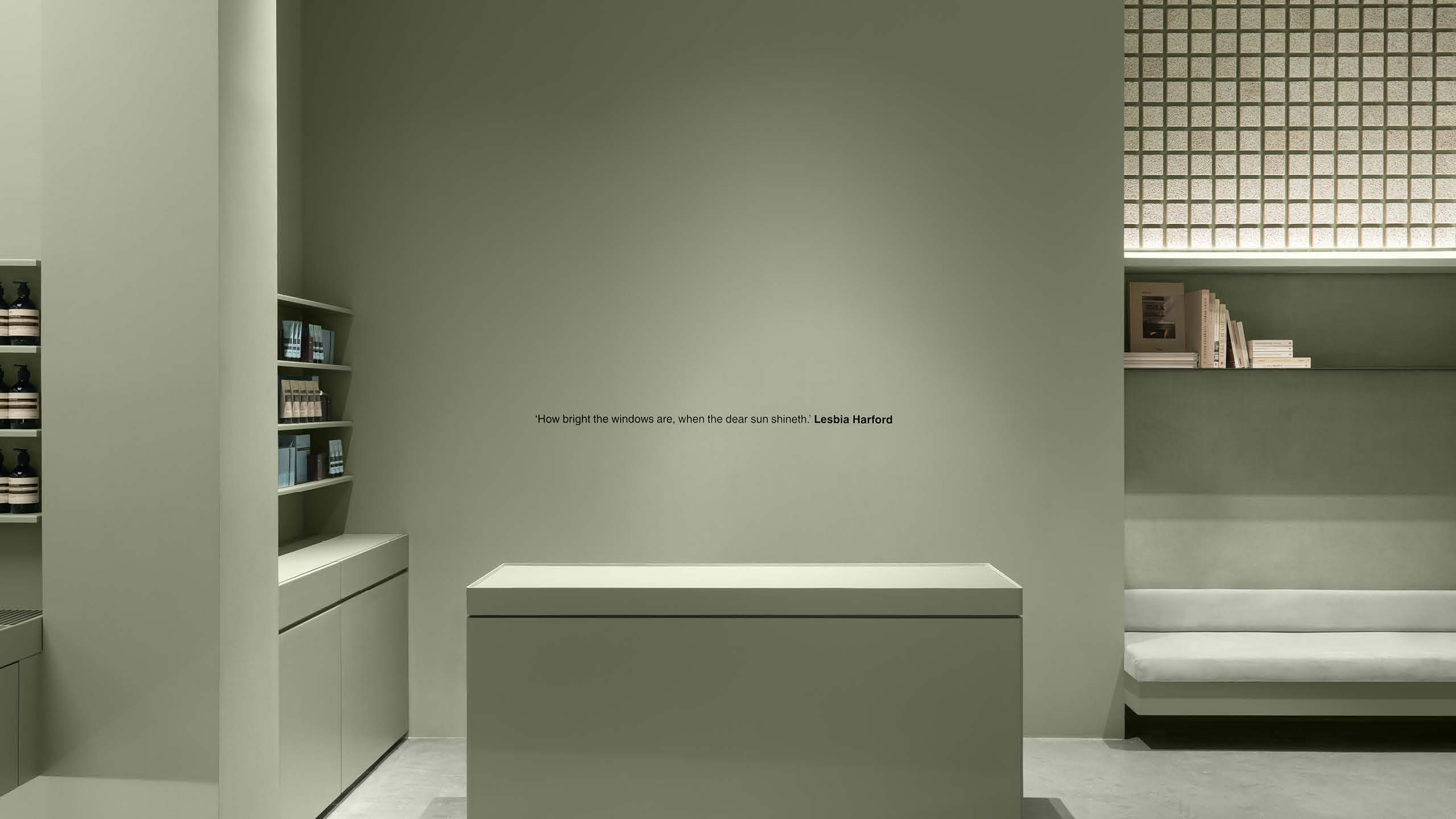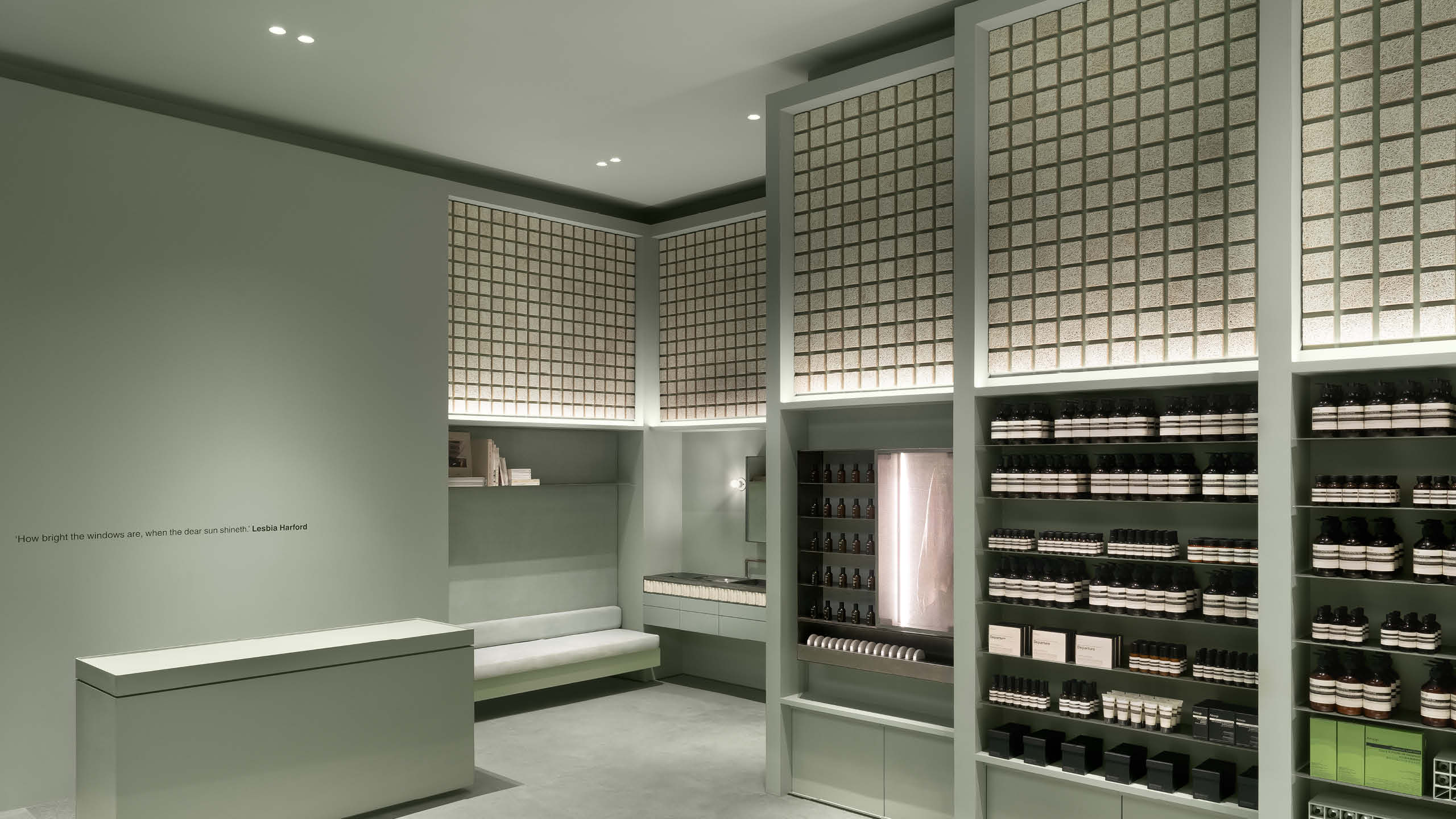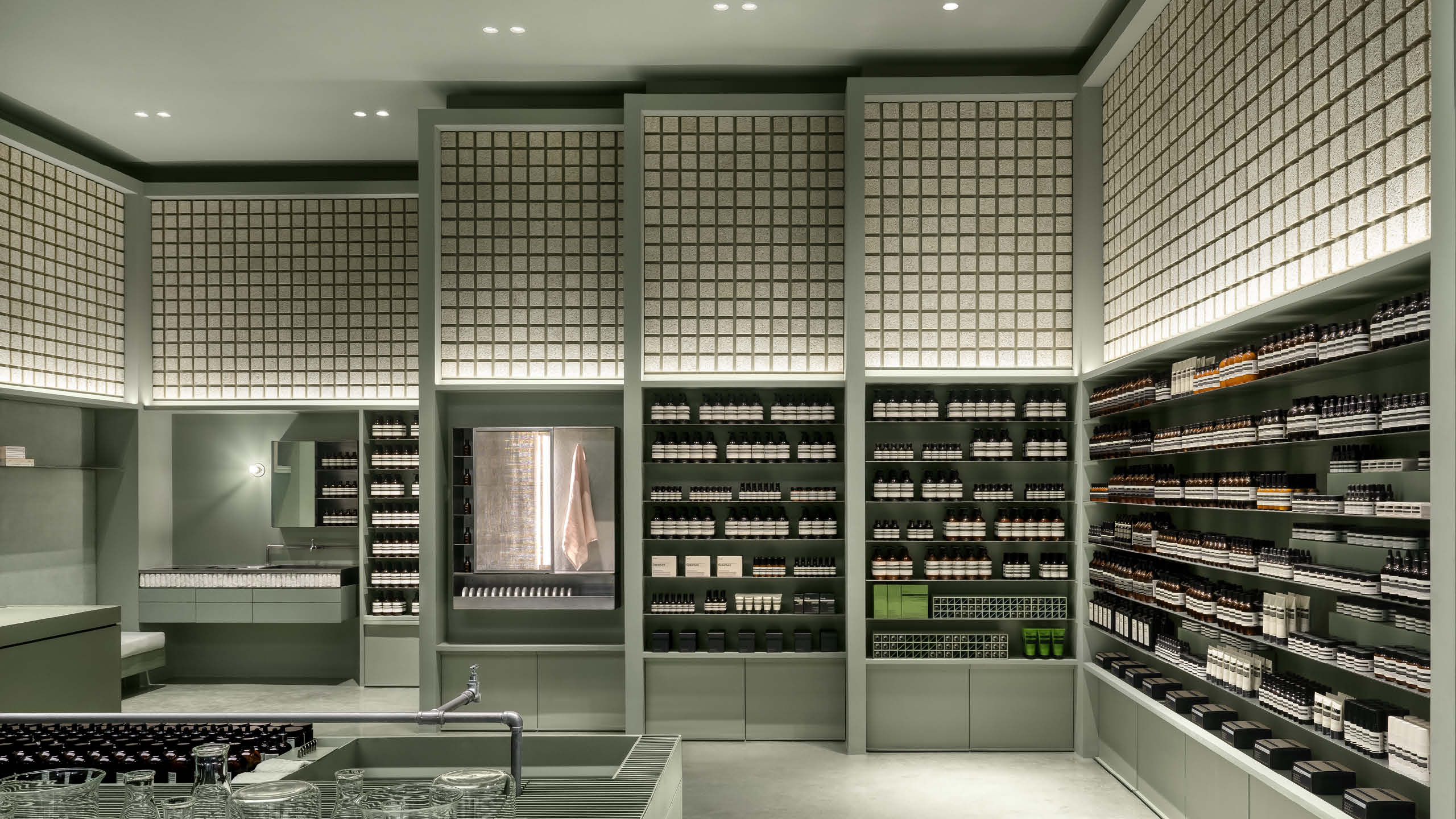 For its stores in shopping centers, Aesop aims to provide reprieve from sensorial bombardment. “With Aesop SM Aura, we created a space of subdued acoustics through the use of articulated matte wood wool paneling, and visual respite with a palette of calming moss green and thoughtful lighting. We hope customers feel a sense of serenity and curiosity upon entering the space. If they venture into the store’s depths, and so choose, they will have the pleasure of an individualized consultation at an intimate individual basin,” explains Lardilleux.