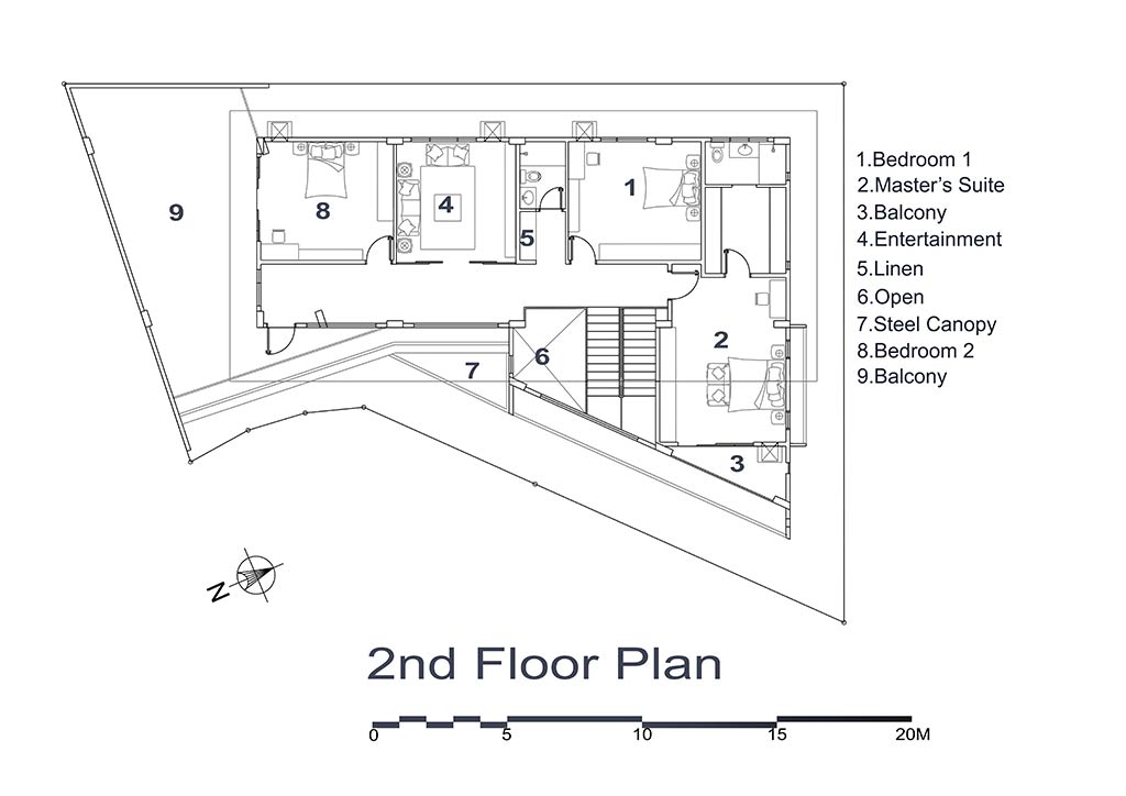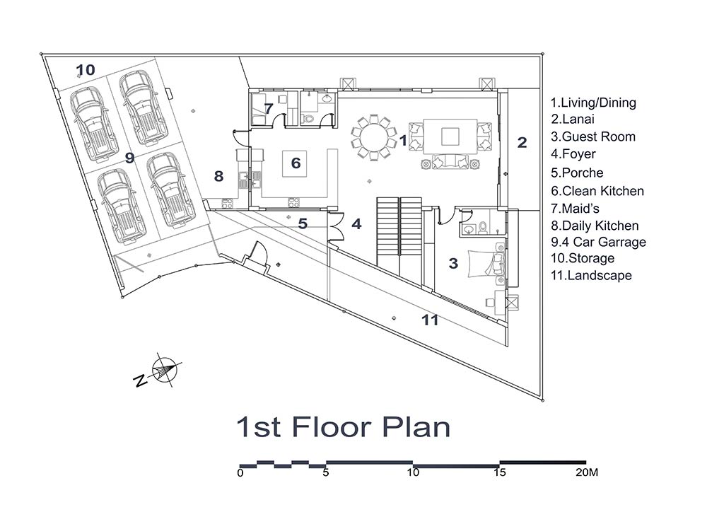 The House sits in a 400 sqm. irregular plot. The owner’s brief is pretty simple and direct. They wanted to have a modest 4 bedroom house, a four-car garage and an entertainment area. We were given freedom with regards to the planning and design of the house. First thing we did was to use the irregularity of the property to our advantage. The lot is very irregular and it is located in a cul-de-sac, but this creates an interesting form for us to play around. We made the house look sculptural and at the same time drawing influence from the many ancestral houses in the area, we decided to combine “Bahay na Bato” elements to our composition.