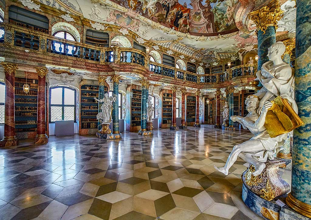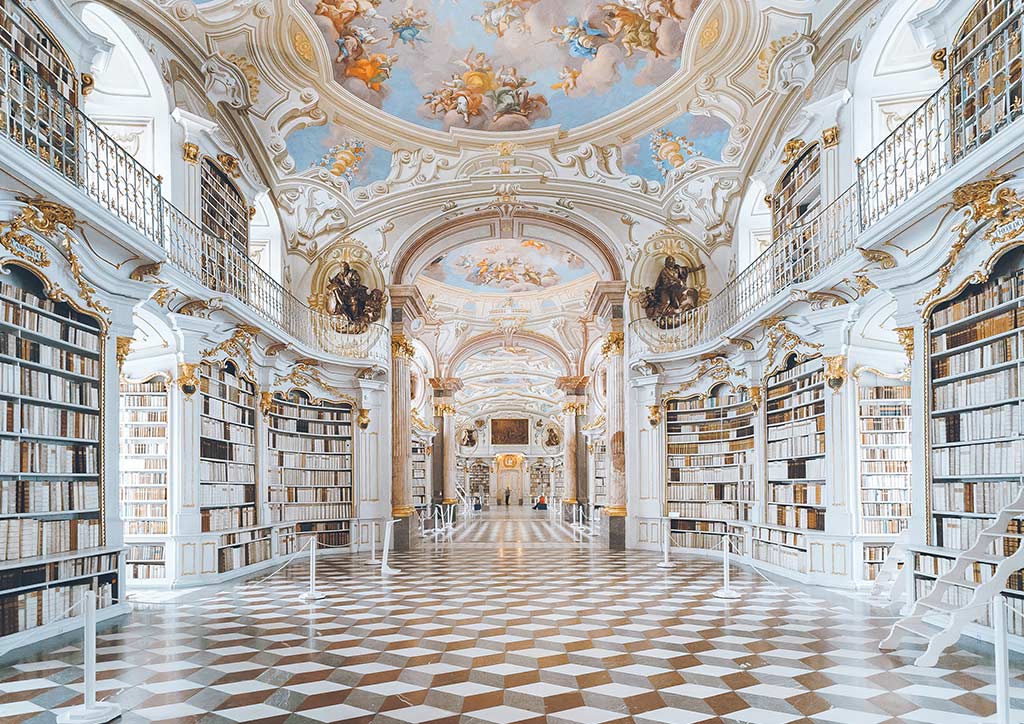 Both of these side chambers have three bays underneath an elongated vault ceiling. At the central cupola is a spectacular fresco carrying the theme of Divine Revelation. This ceiling is then supported by 12 pillars made of reddish marble that accentuate the vertical dimension. This two-story library has bookcases to highlight the wide space and 48 windows to allow the flow of natural light. Unlike other libraries that painted their bookshelves a subtle brown, the Admont Abbey Library bookcases are painted in an immaculate white toned with gold decor which reflects the 17th century’s era of enlightenment. This picturesque library can be explored through a 3D virtual tour (payment is still needed, of course!)