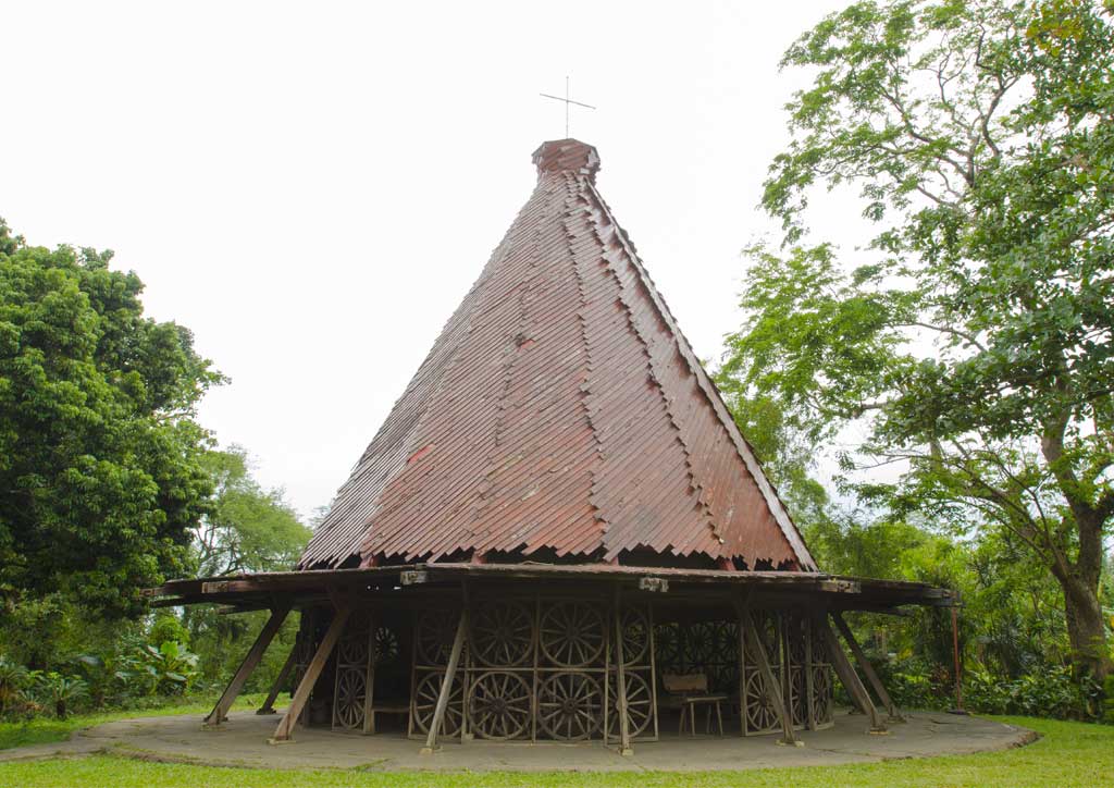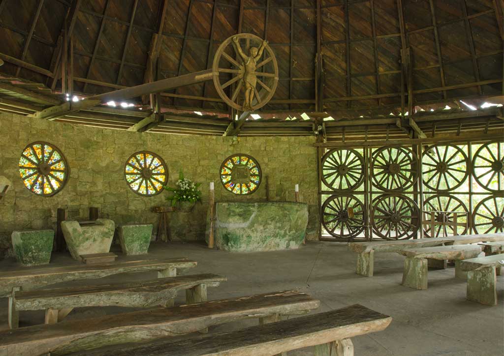 “I made the cartwheel a symbol of the Holy Trinity,” Msgr. Gaston says. “The center of the wheel is God the Father, from whom all things come; the spokes are Jesus Christ, spreading God’s word; and the wheel is the Holy Spirit, responsible for our actions and guiding our way.” The round chapel is supported by 16 pillars, which represent the 16 documents of the Second Vatican Council. The roof was inspired by the Filipino salakot, a farmer’s best friend in the fields. Every element inside the chapel has meaning—a traditional way of building religious structures, but graciously made more relatable and accessible by the good monsignor.