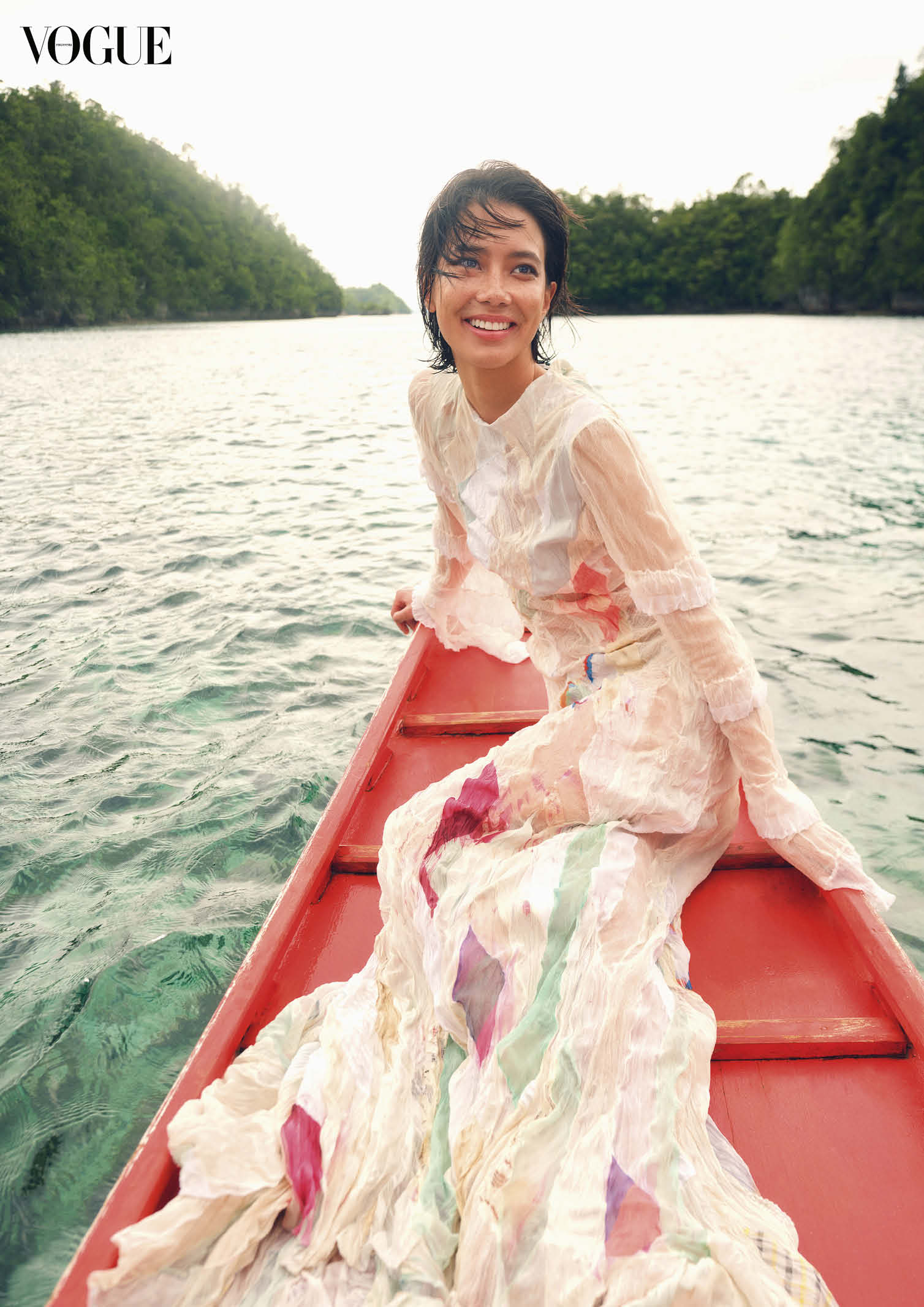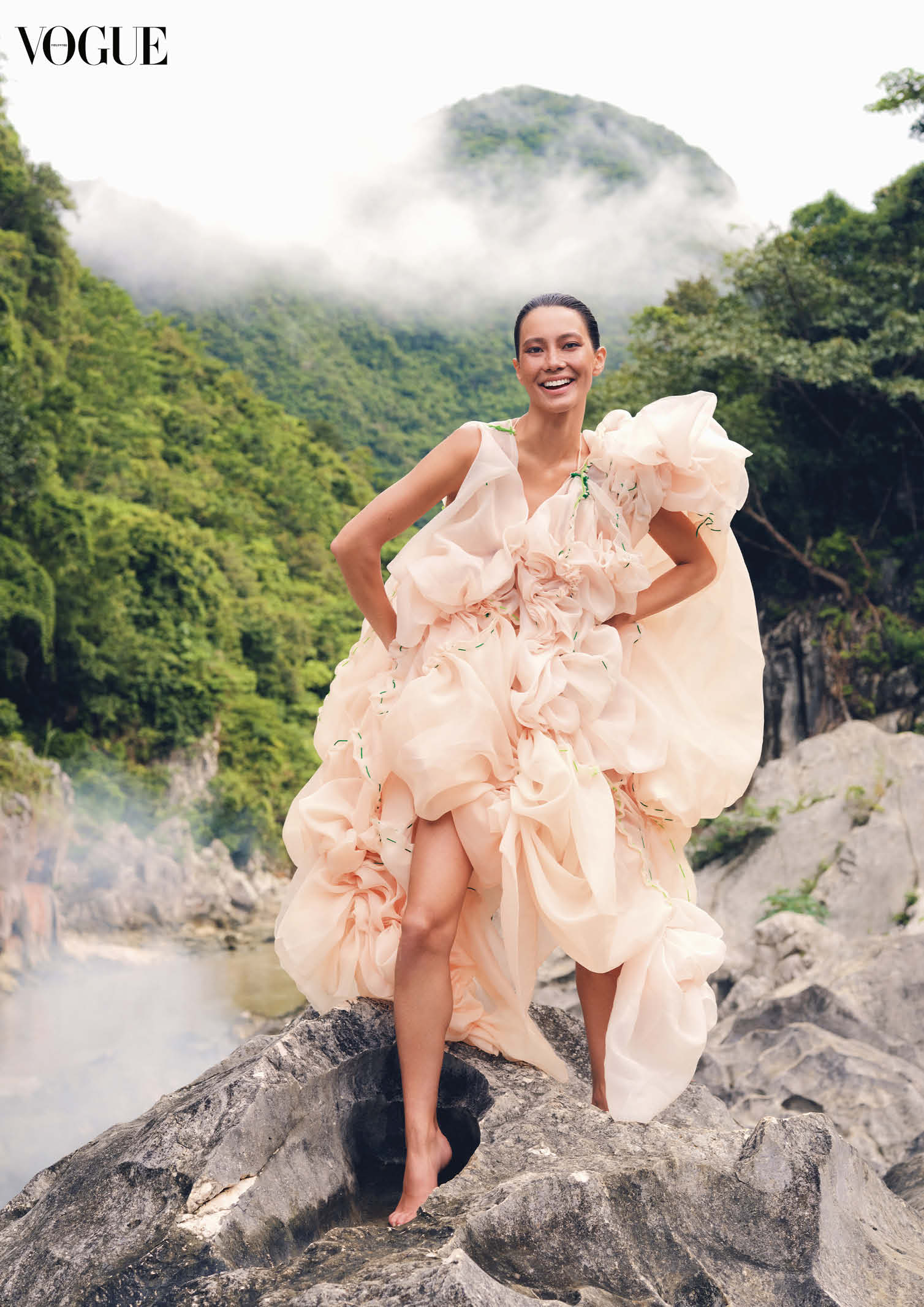 The 36-page cover story showcases the beauty of the Philippines, with Magno floating on the lagoons of Bucas Grande, Surigao del Norte, exploring the otherworldly rock formations of Biri Island, Northern Samar, and conquering the marble boulders at Tinipak River, Rizal. She wore international couture labels to local indie darlings, showing a range of designers and brands that have a mind for both luxury and sustainability.