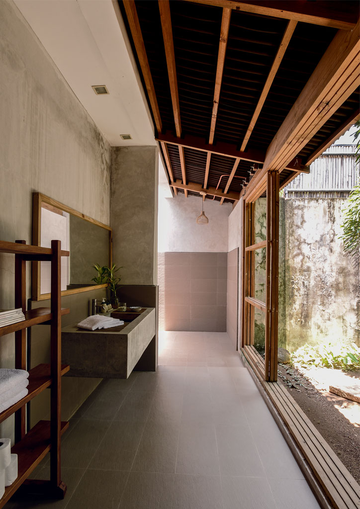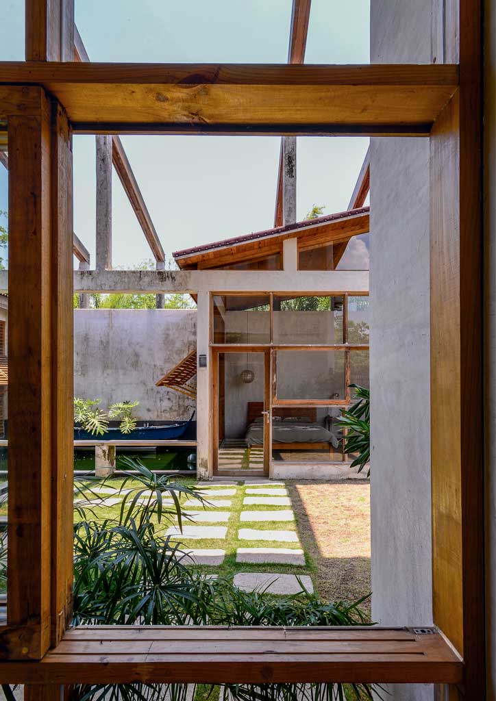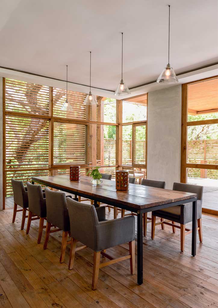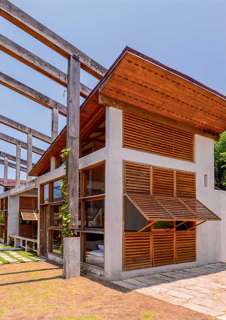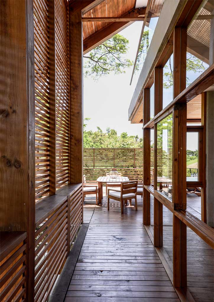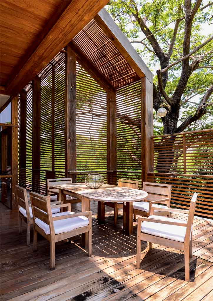 The angular roof design conveniently connects the main house to two separate casitas, which were especially built for visiting family and friends to experience the same level of privacy and relaxation. Wooden slats and louvered windows provide proper ventilation, as well as protection against sunlight. Locally produced wooden furniture completes the warm ambiance of the seaside home, along with the unpainted concrete walls that represent the couple’s carefree personality.