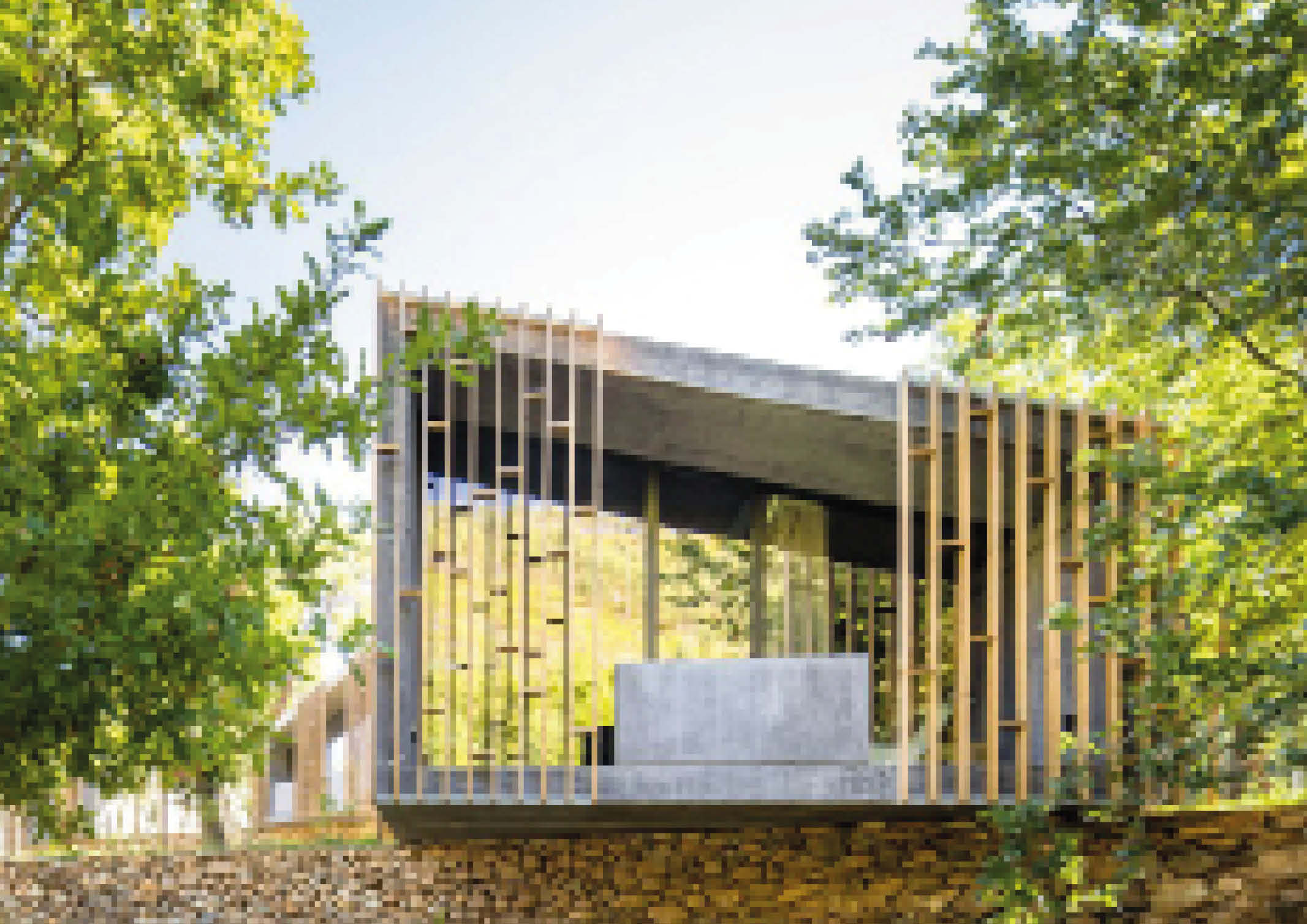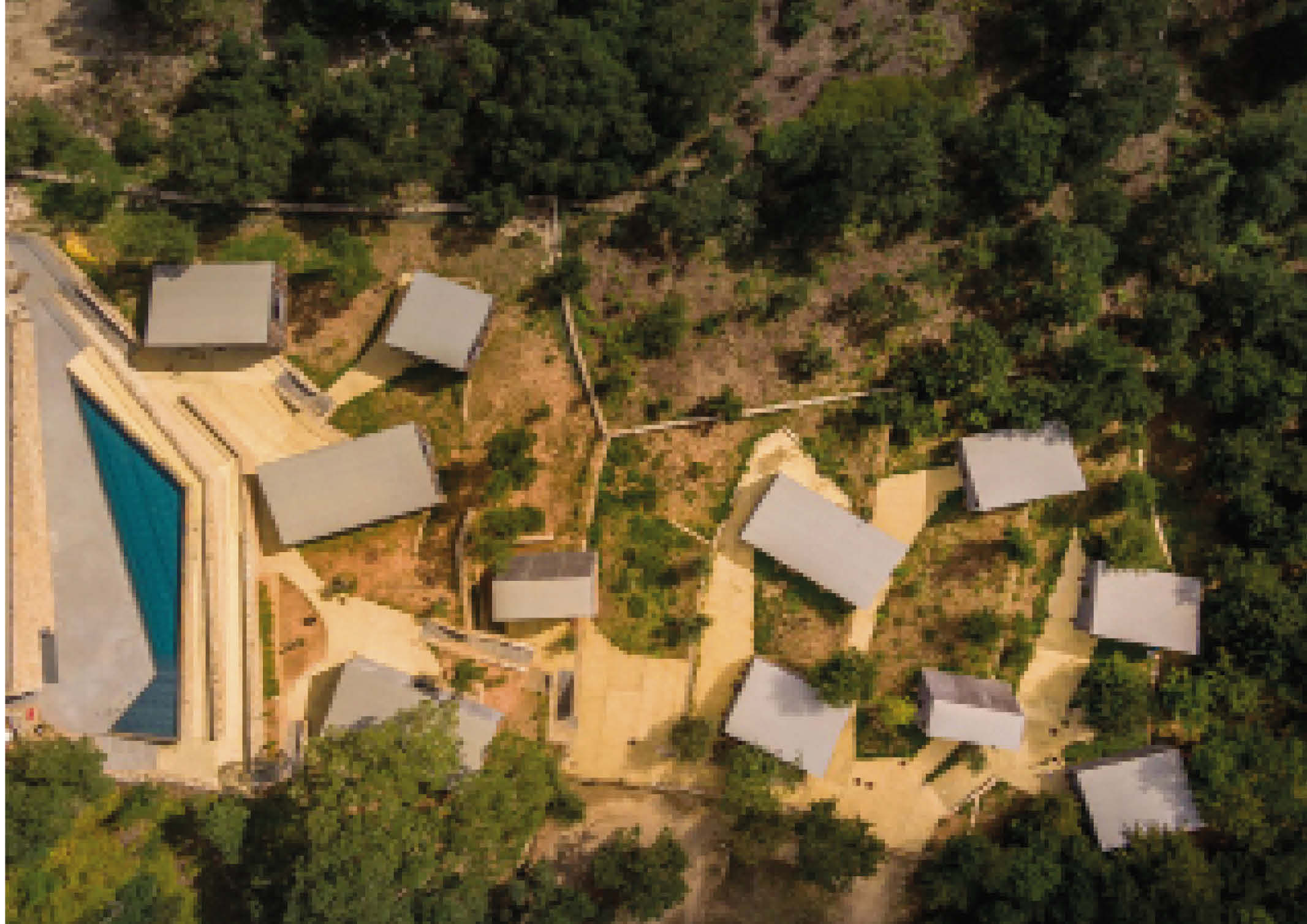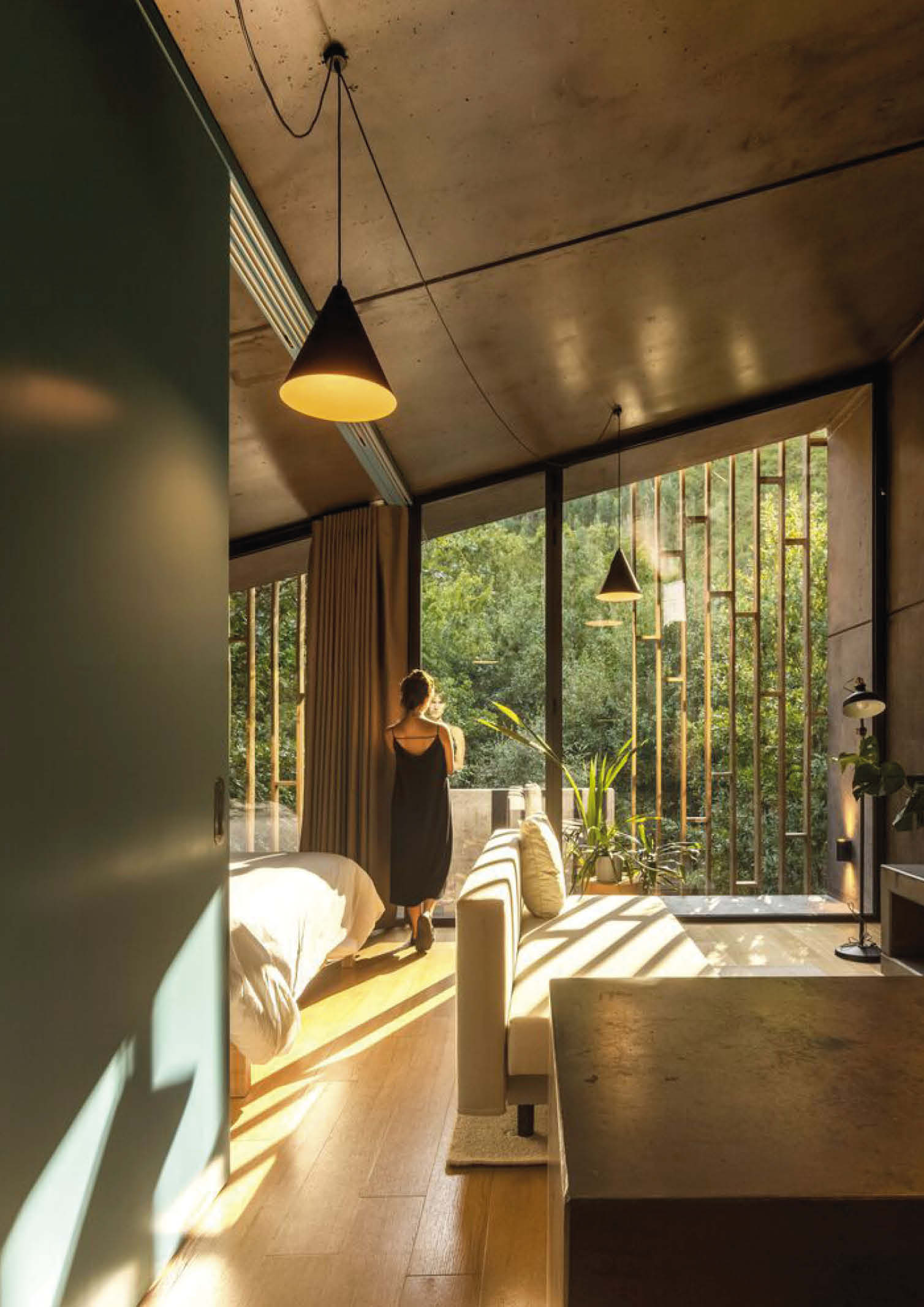 The ergonomic cabin units contain a living area, a bedroom, a kitchen, and a bathroom in a very compact space. Consistent with the modular nature of the project, all the units share a similar composition. The predominance of concrete in the building’s composition is highlighted. It adds weather resistance to the exterior of the structure, and the same material is also present inside, creating an industrial aesthetic. The lack of finishing, which was a purely aesthetic move, is also cost-effective. In addition, oak hardwood paving enhances physical and visual comfort. Vertical wood slats on the exterior of the recessed balcony provide privacy, cast shade, and filter views of the forest and river. Ultimately, the property features a swimming pool that overlooks the cabins, adding a water element that elevates the 512-square-meter property.
