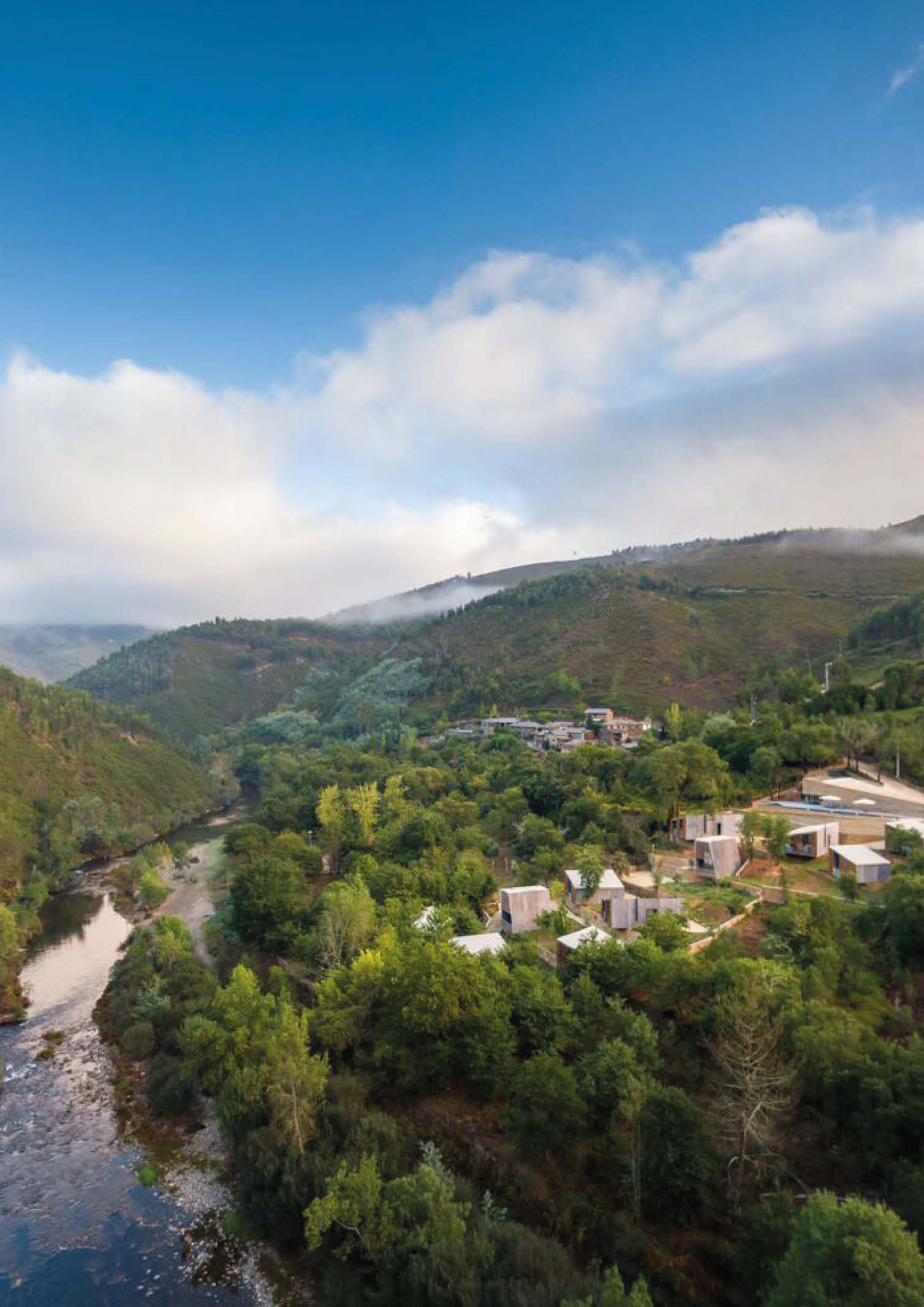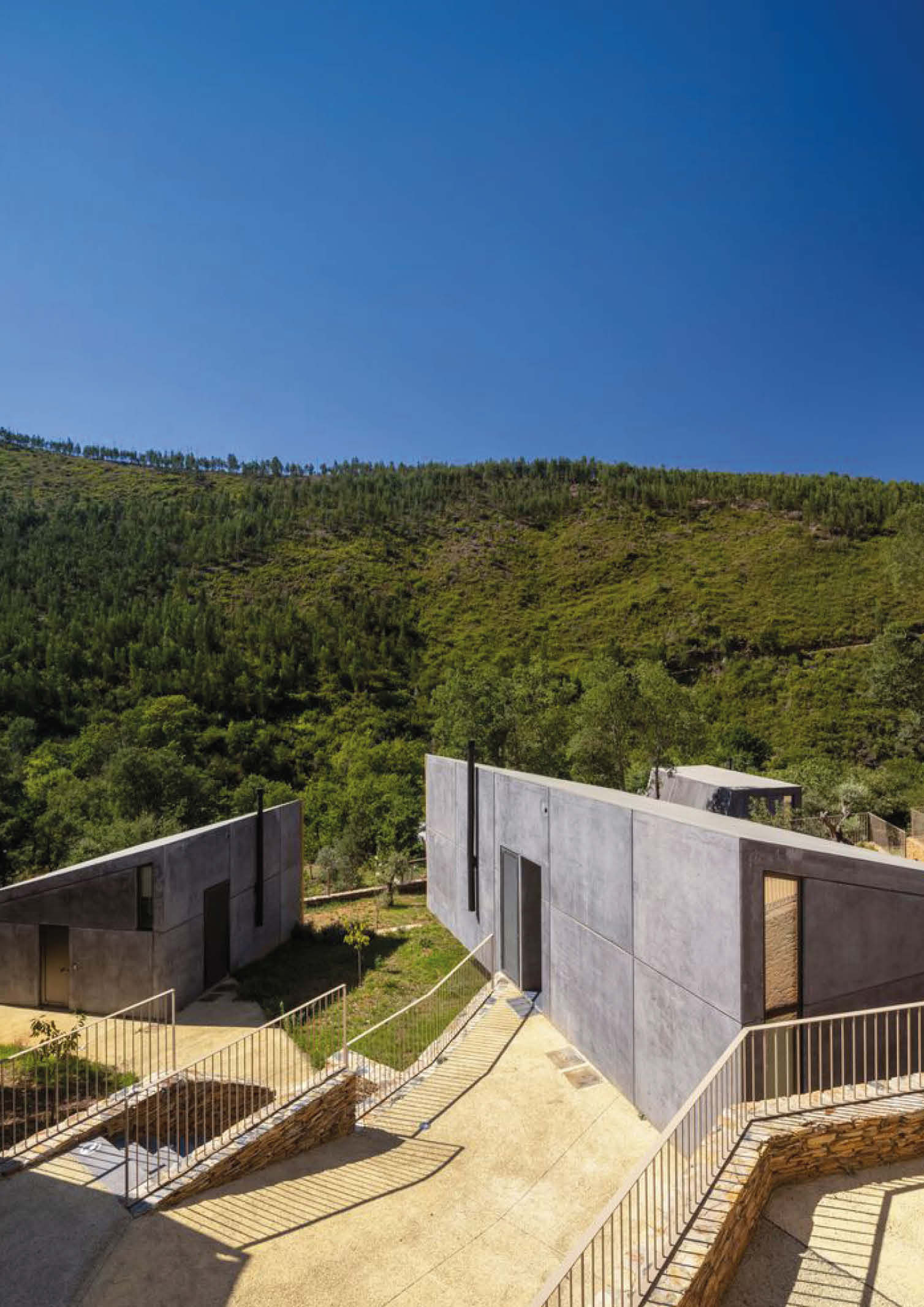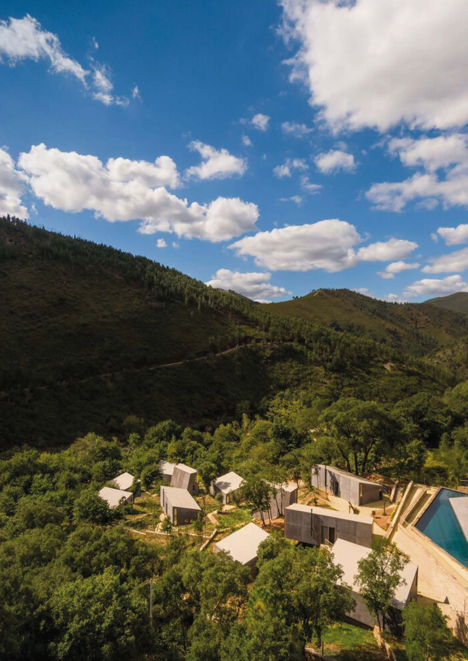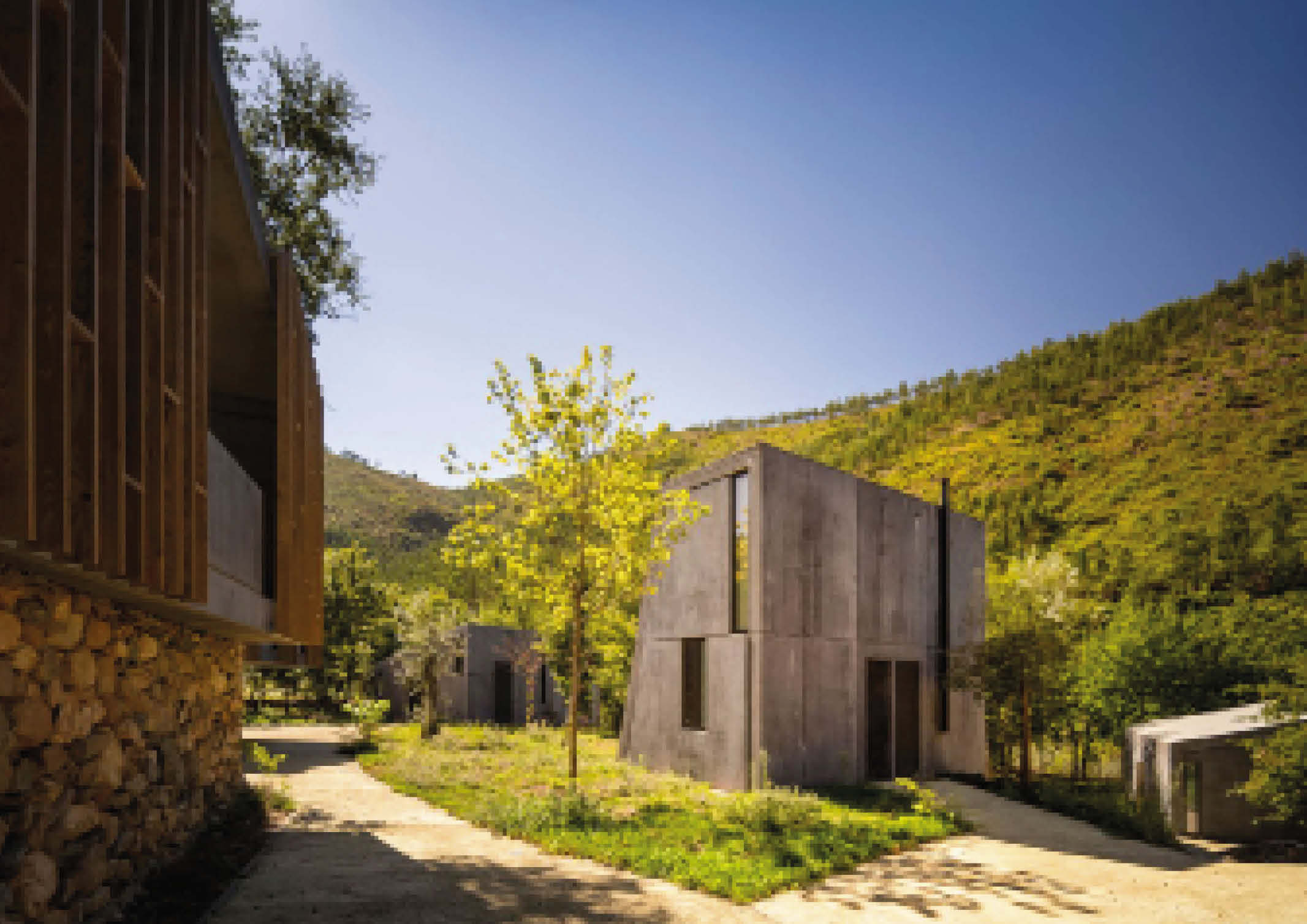 Summary architectural studio has completed the construction of cabins made of concrete and wood in the rugged terrain of Paradinha, Portugal. The architectural team carefully distributed 11 cabins throughout the property. The project’s site near the Paiva river with existing lush vegetation was considered, resulting in minimal site alteration. Each unit is between 28 and 58 square meters in size and is oriented differently to provide a unique view of the forest and river. All are positioned with nominal disruption to the site’s old stone walls and flora.