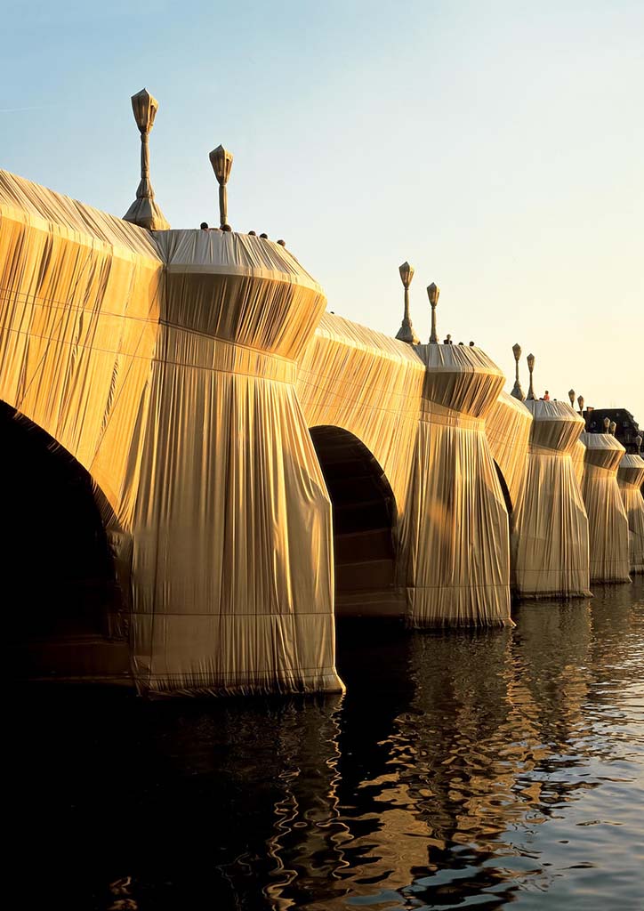 The Pont Neuf is the oldest standing bridge across the river Seine in Paris, France. It was constructed in 1578 and was believed to be designed by French architect Baptiste Androuet du Cerceau. After years of negotiation with then Mayor of Paris Jacques Chirac, Christo and Jeanne-Claude wrapped the Pont Neuf with woven polyamide fabric. The silky and golden sandstone colored fabric covered the entire bridge, including the sides and vaults of the twelve arches, sidewalks, street lamps, and the parapets down to the ground.