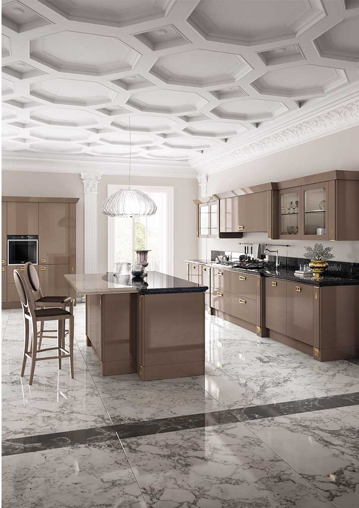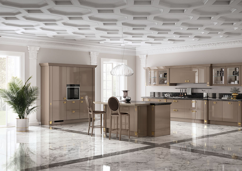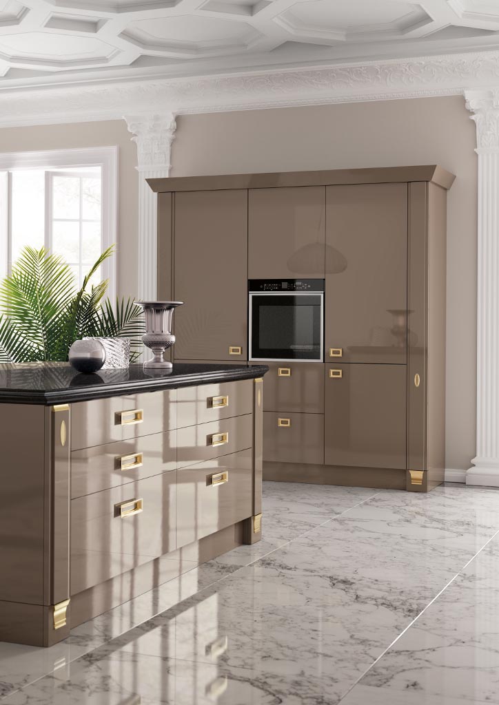 Exclusiva’s most recognizable characteristic are its golden or chrome-finish capitals inserted in 15 cm decorative elements, which together with the special oval door handle, represent the strong points of the model. Other distinct features in the collection include the small frieze located in the plinth of the 15 cm decorative elements for base and tall units, the strip positioned in the upper part of the 15 cm base units and H.127 cm tall units, and in the lower part of the wall units.