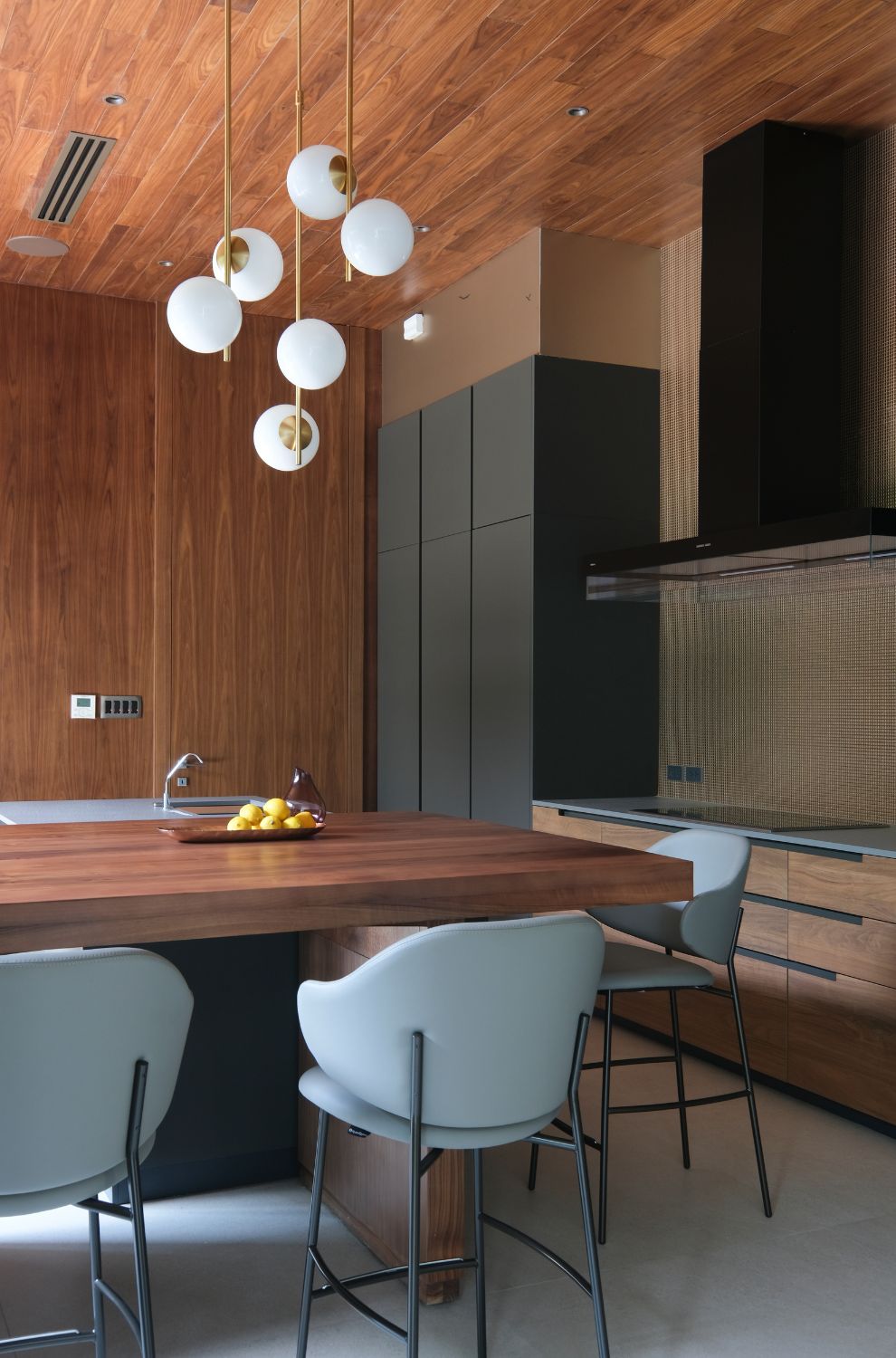 The architect took it a step further by mixing and matching various textures, clean lines, and geometric motifs, creating a visually dynamic and cohesive environment. This careful interplay of elements is evident throughout the interiors. In the living room, plush fabrics invite comfort and relaxation, while the minimalist aesthetics of the kitchen and dining room provide a sleek, modern contrast.