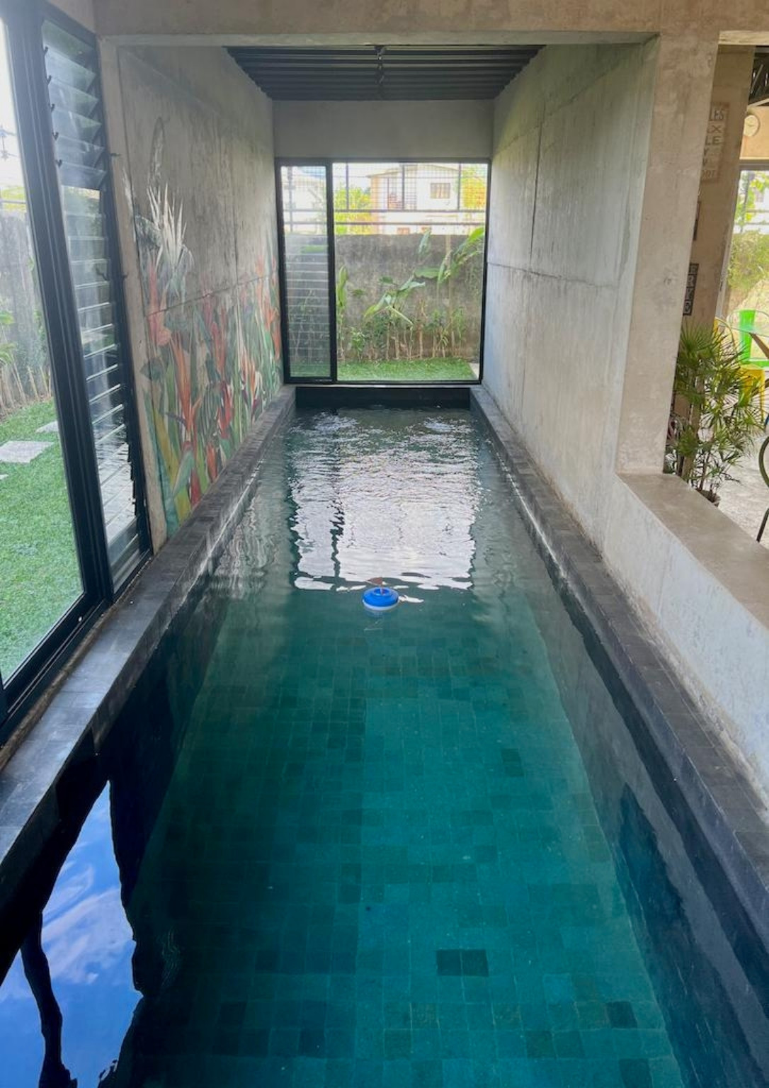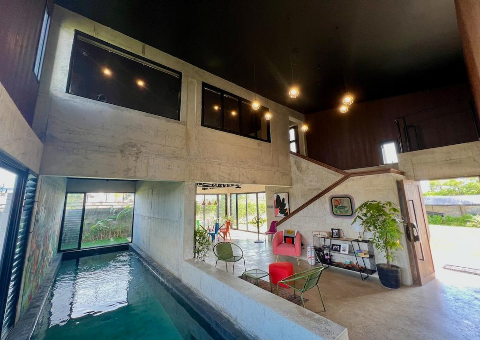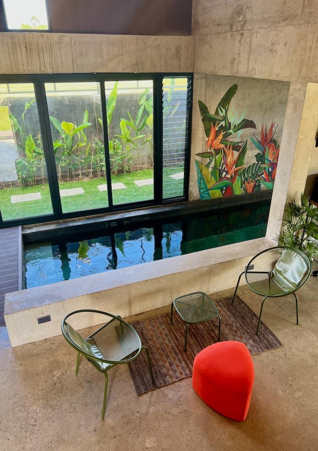 One of the highlights of the space is the mural on the side wall of the lap pool. Not only does it add color to the gray wall but it also gives the space a tropical ambiance. The addition of the chairs gives the room a pop of color and contrast to the hard and monotone walls.