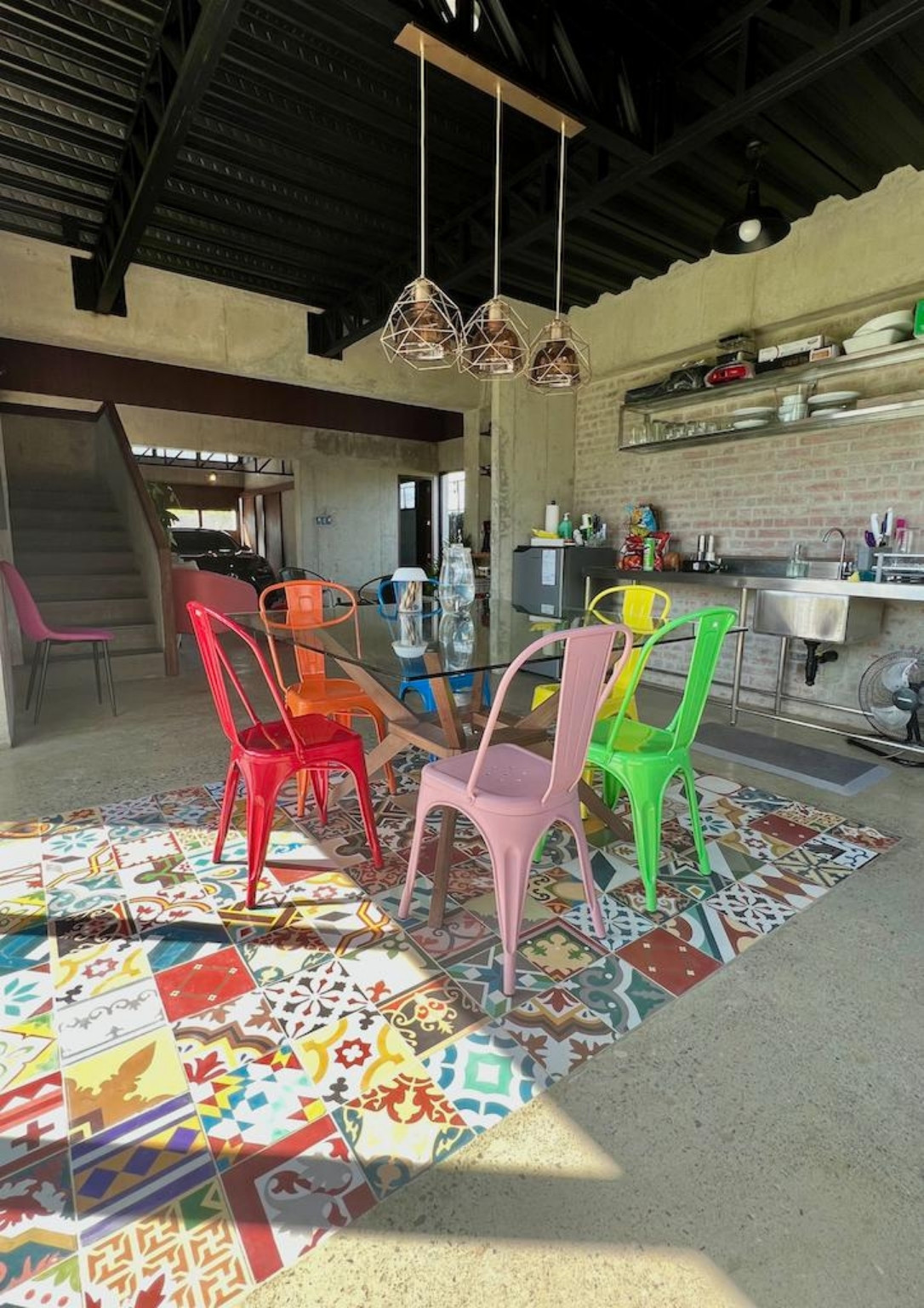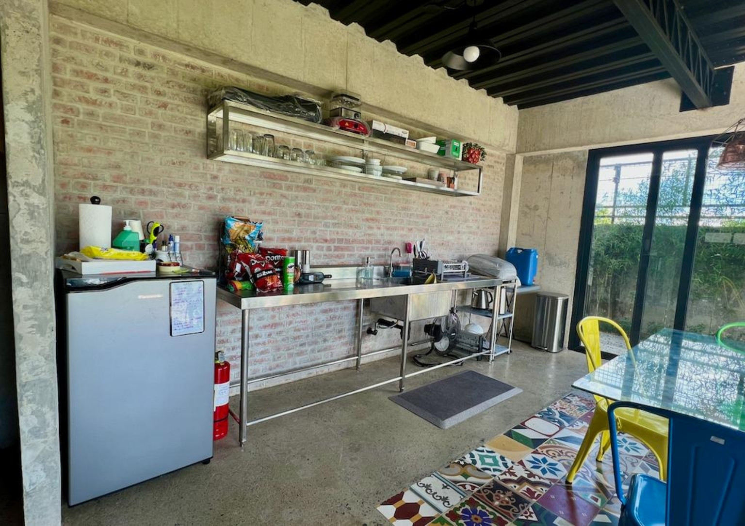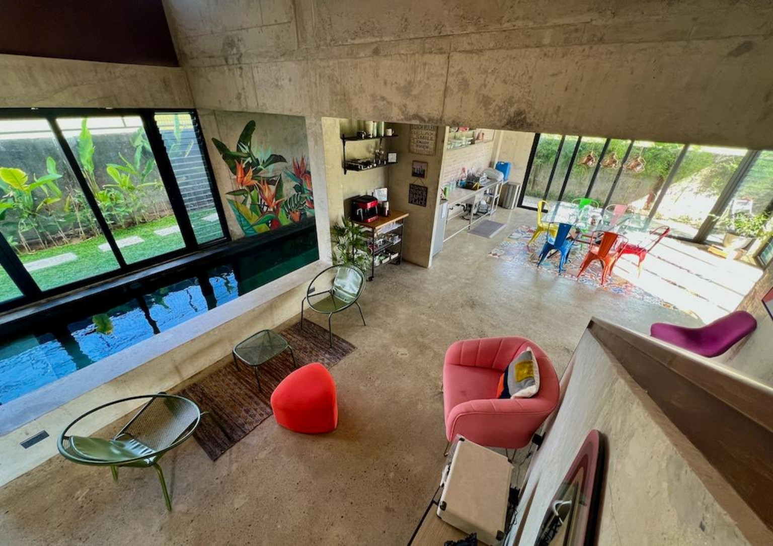 As a whole, the design of the space combines industrial and brutalist features. The ground floor has an open plan layout which creates a wide sense of space. It also has a high ceiling, featuring painted exposed steel decking. The concept is very straightforward and modern. Concrete is heavily used in the overall design. The floor has polished concrete in harmony with the plain cement wall treatment. For the dining area, the polished concrete floor is accented with Machuca tiles.