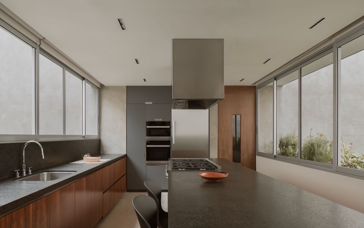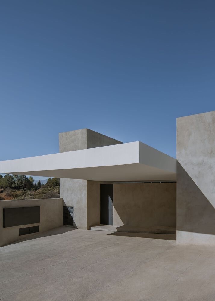 The uncluttered floor plan and double-height volumes enhance the sense of spaciousness and lightness within. Carved from the bottom of the structure is a central patio with an open-air kitchen and a semi-covered pool.The ground floor contains the public hosting areas and kitchen. Meanwhile, the second floor houses the bedrooms and a more private set of shared areas.
