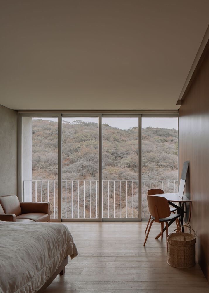 Cañada House seamlessly cascades down a steep slope with cantilevered volumes arranged in a staggered manner. The ravine’s character remains undisturbed as the structure floats above it. The home intertwines with and makes space for the area’s natural landscape while offering views of the surroundings.
