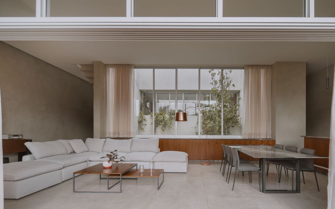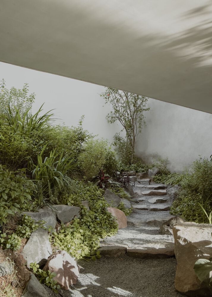 The uncluttered floor plan and double-height volumes enhance the sense of spaciousness and lightness within. Carved from the bottom of the structure is a central patio with an open-air kitchen and a semi-covered pool.The ground floor contains the public hosting areas and kitchen. Meanwhile, the second floor houses the bedrooms and a more private set of shared areas.