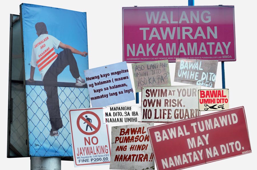 The other permutation of this sign is Bawal Tumawid, May Namatay na Dito. Whoever thought this up might as well have completed his disrespect for the unfortunate victim by setting up an altar complete with candles and flowers on the road, showing photos of the victim and the incident. Or he could have paid tribute by tracing a permanent chalk outline of the body on the road.