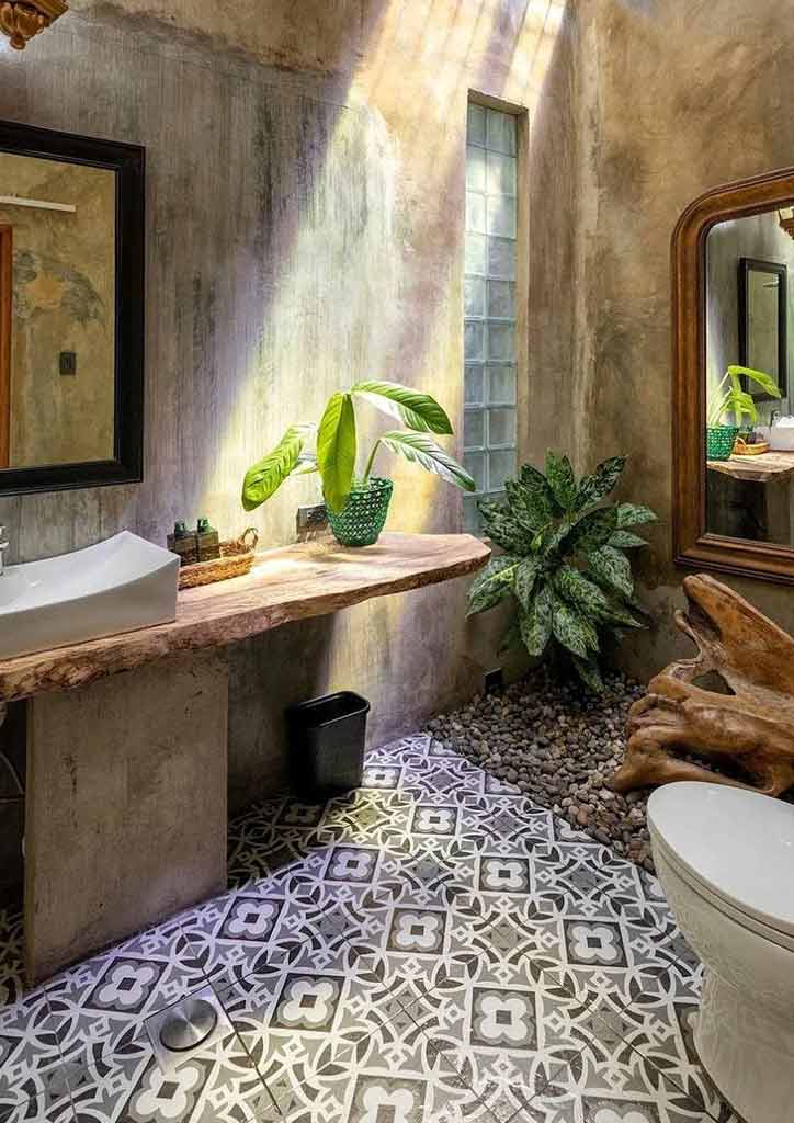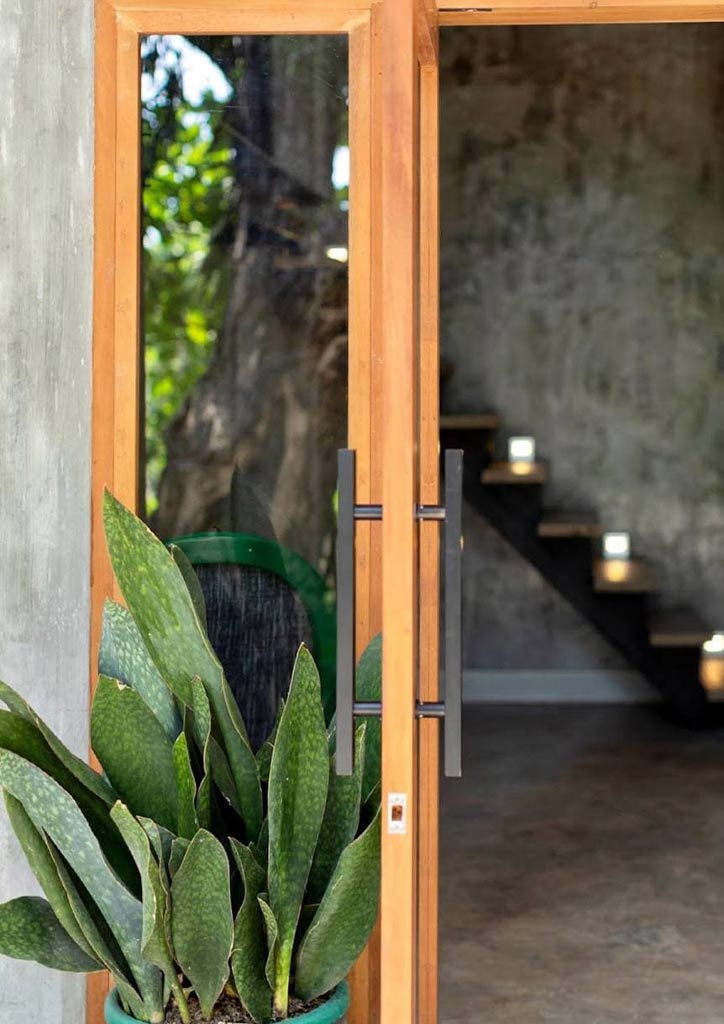 The villa’s minimal concrete architecture embraces indoor-outdoor living, with large glass doors that can be left open to enjoy the garden and pool view. The villa’s lower level features a lounge and entertainment area and the mezzanine as the sleeping area. The materials used for the staircase, railings, and flooring were all from their old office. The bathroom has a sunroof and receives copious Morning light everyday. Despite the coldness of the concrete, the villa still manages to feel cozy and warm due to the genius choice of malachite green accents on the villa’s decor and chairs. The beautiful light fixtures Leslie and her daughter chose for this project retains an industrial feel softened by the wood elements providing guests a sample of the owner’s taste and aesthetic.