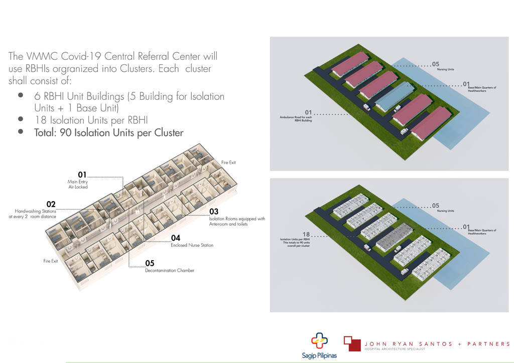 Government sectors are currently handling the situation by repurposing government buildings and other public spaces into quarantine facilities. However, the Inter-Agency Task Force (IATF) says that confirmed cases will still be brought to the hospitals. In the event that the number of COVID-19 patients continues to rise, what will be needed are more isolation and treatment facilities, not quarantine facilities. This is where the idea of a COVID-19 central referral complex becomes necessary. Like their Sagip Kanlungan project, the VMMC COVID-19 Central Referral Complex under the Sagip Pilipinas initiative introduces the idea of a centralized location, which allows for better establishment of protocols and dialogue between the public and private sectors. Moreover, units of the entire complex may be used as regular nursing stations or isolation units after the COVID-19 outbreak.