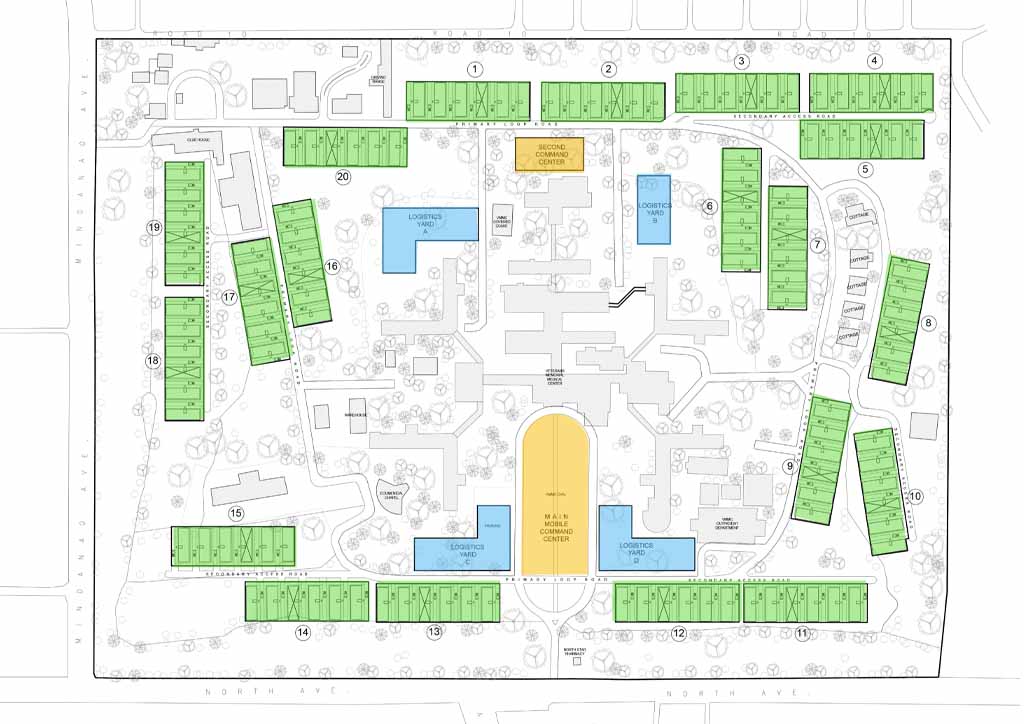Assuming the worst-case scenario, hospital architecture firm John Ryan Santos + Partners crafted a plan to make use of Veterans Memorial Medical Center’s 55 hectares of land. The design includes their proposed RBHI units that will be constructed within the site, including the golf course. JRS+Partners says that this site is the most viable for a number of reasons: it is highly accessible from multiple points; it is government-owned; it has existing utilities and road networks; it’s in proximity to certain government hospitals; and its entire perimeter is easily defensible and can be surrounded by military security.