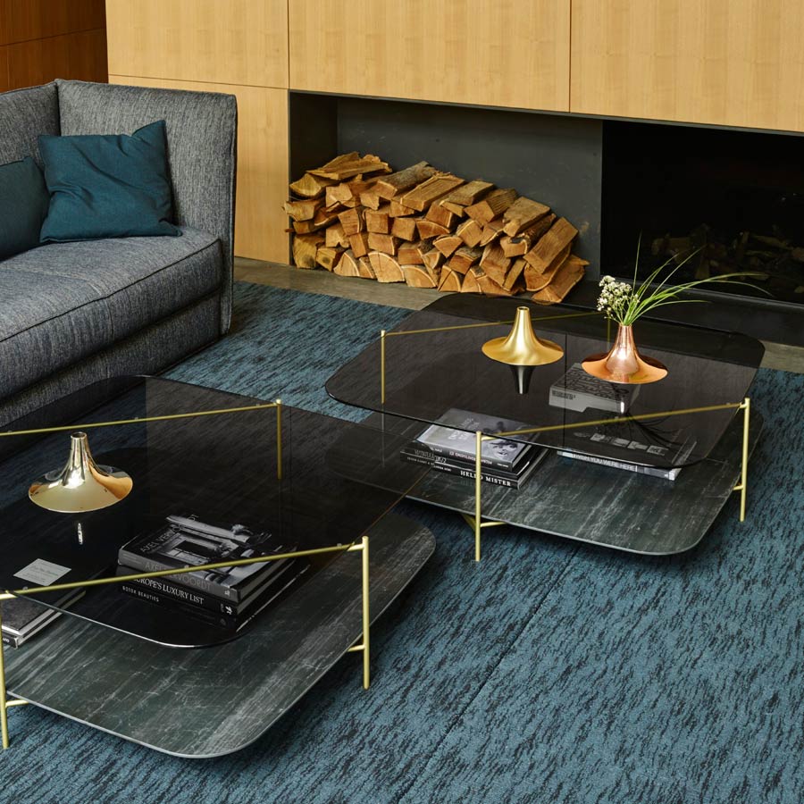 The Clyde coffee table. his double-topped low table combines 3 different materials in an entirely contemporary fashion. With the brass-plated structure, the smoked glass top, and the marble-effect bottom, the piece speaks of a softness and elegance that can easily be mixed with any interior style.