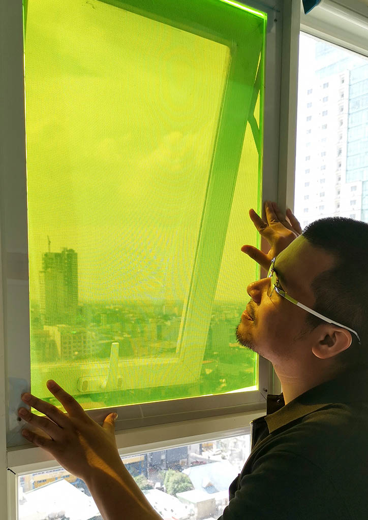 Filipino industrial designer Carvey Ehren Maigue has developed a UV power-generating material from juice-extracted bioluminescent particles of crops wasted in droughts. The result is a material that transmutes sunlight even on especially cloudy days into energy, similar in function to solar panels yet taking the form of a pliable fluorescent panel easily cladded onto building facades.