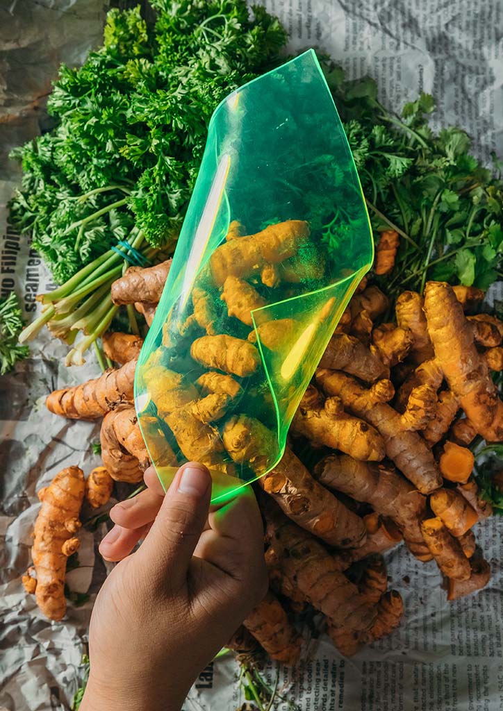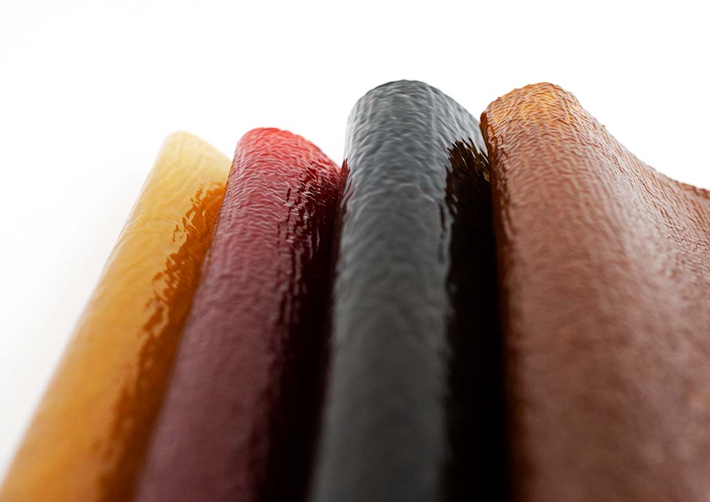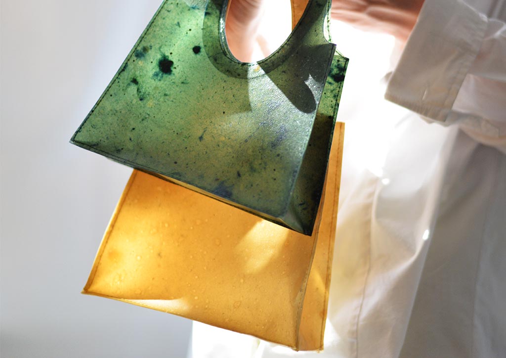 Also taking from juice waste, SONNET155designed by Lobke Beckfeld and Johanna Hehemeyer-Cürten combines industrial by-products from both juice and fabric production to create desirable items, that represent sustainability as a treat rather than a burden and can be fully integrated in a biological life cycle going back to the earth after wear and tear. More on textiles, Uyen Tran has developed biodegradable leather that can take on various textures, Tômtex is made of upcycled seafood shells dyed with coffee grounds among other natural dyes.