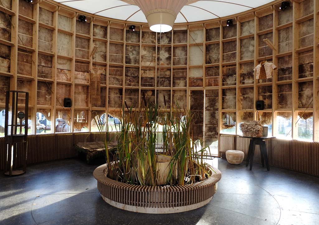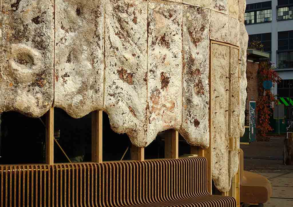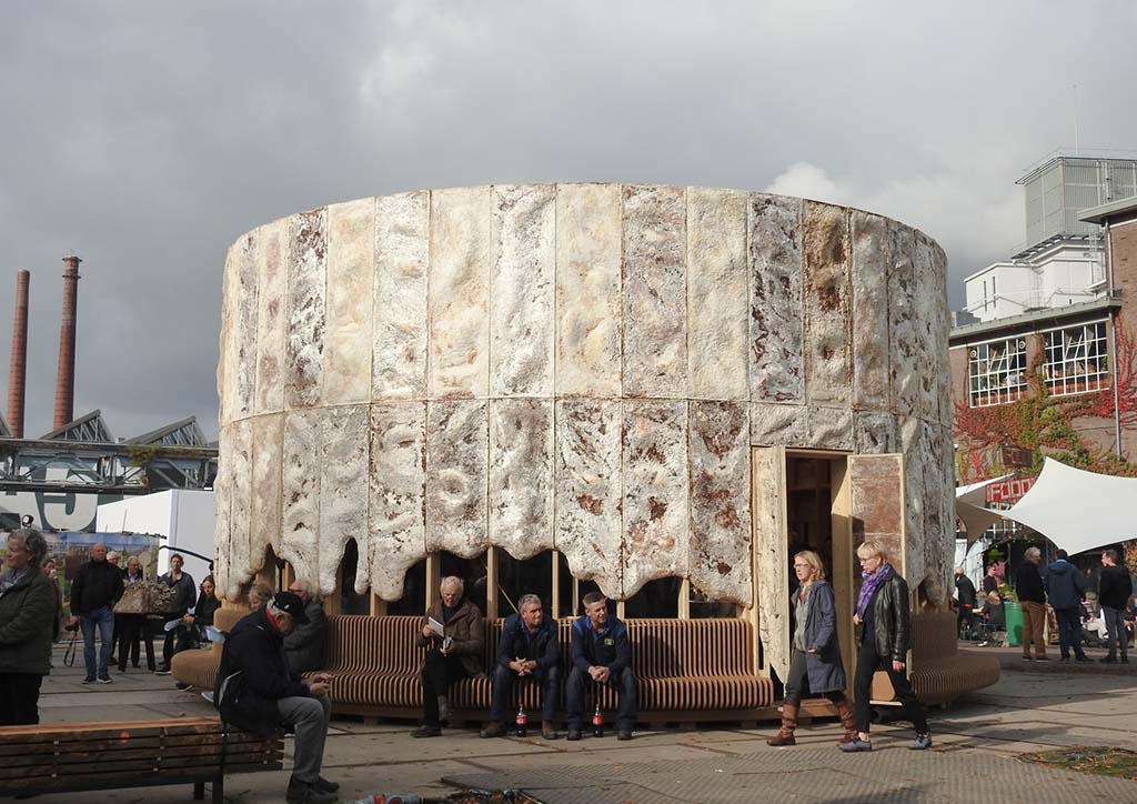 The Growing Pavilion was a performance set collaboration by Pascal Leboucq, Lucas De Man & Eric Klarenbeek built entirely from a collective of natural materials; a circular plan in a timber frame fitted with a mycelium envelope called ‘Living Skin’ that grew harvestable fungi. Also bound by mycelium, Wasteware by Barbara Gollackner is a collection of homeware made of assorted food scraps.