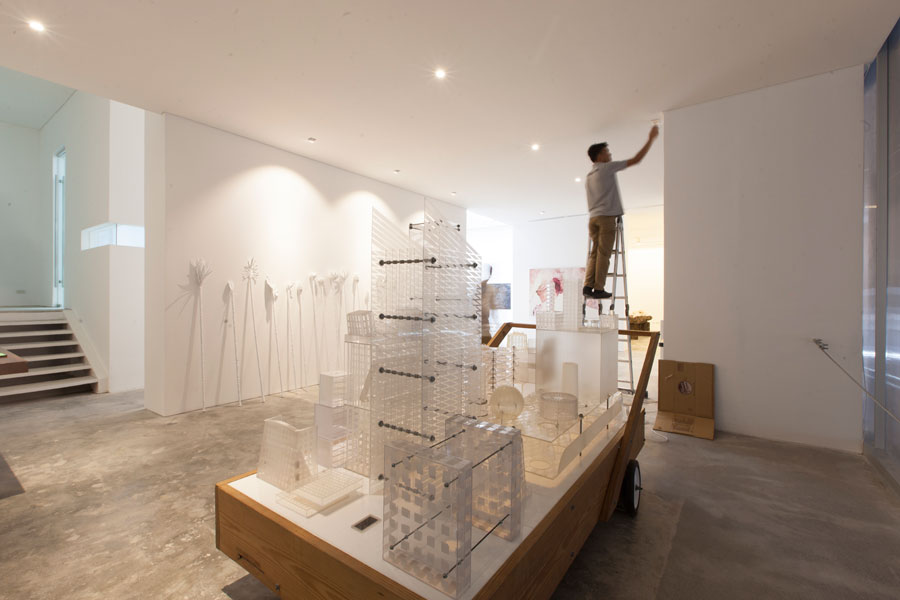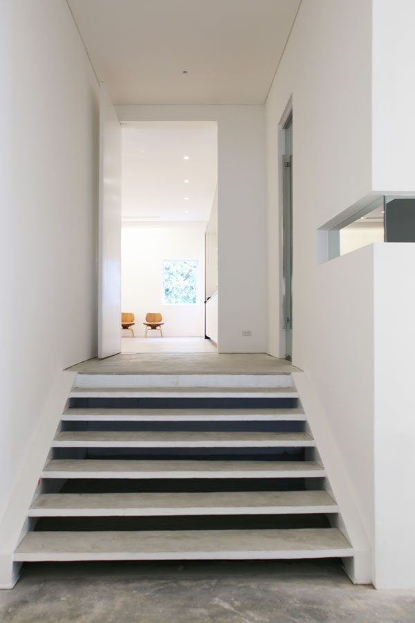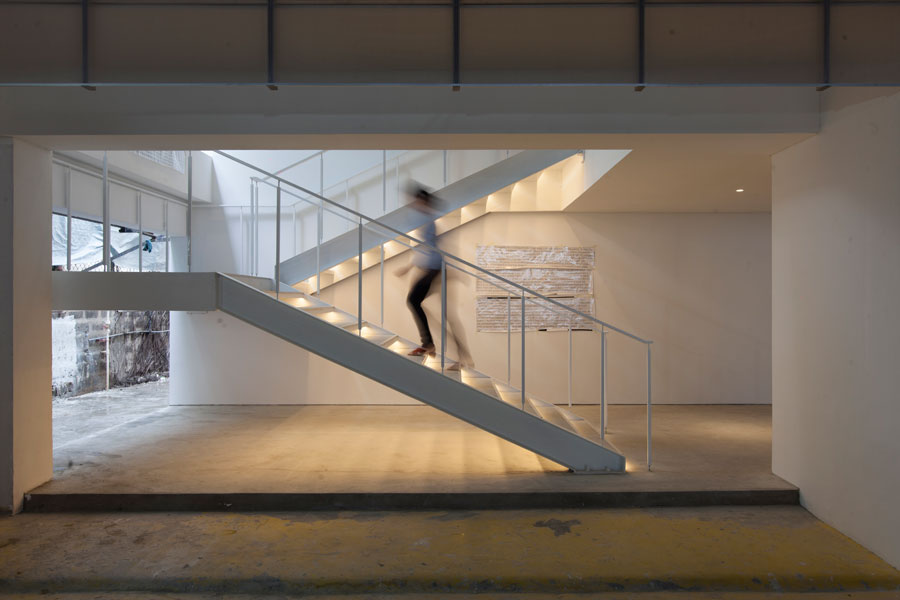 Standing deep in the warehouse is a white vestibule; its immaculateness emphasized by an austere parking lot and iridescence heightened by night. The 20-meter facade is composed of a span of translucent window panels on the second floor and a stairwell leading up that looks cantilevered from the wall. “When the interior lights are on, silhouettes of visitors as well as the artworks are discernible, heightening the dramatic impact with a silvery glow,” says Sy. “It is done with a subtlety that bespeaks Silverlens as the premier art gallery in the local art world, one that values simplicity of setting only as a means of bringing to the foreground the magnificence of the work it so proudly displays.”