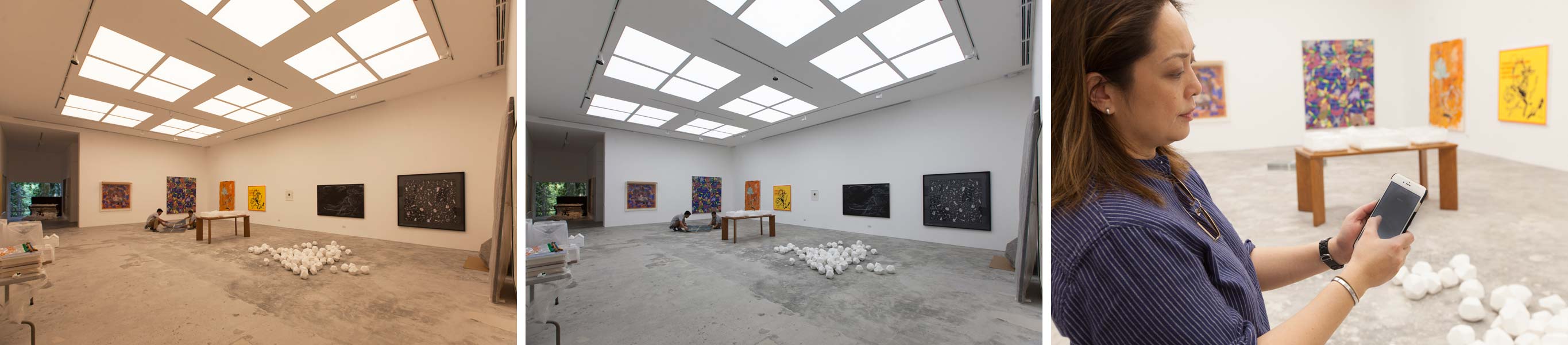 After the initial “wow,” the novelty takes a back seat—precisely what good gallery lighting should do as the art is the focus of any exhibit. What the directors are most happy about is how, with the adjustment of light, the space can look full in cases of shows composed of only a few pieces or a single installation. “The space, along with all its facets, is there but it is also not there,” says Rillo. Silverlens-represented artists had their preview one day before our visit and it, too, was a frenzy. Lights pulsed as each one had time with the mobile app remote. Patty Eustaquio sprawled on the floor to draw something while Pow Martinez set up his mini-studio in a room downstairs. Immediately, there was creative energy hinting that Philippine Art will enjoy its new stage. ![]()