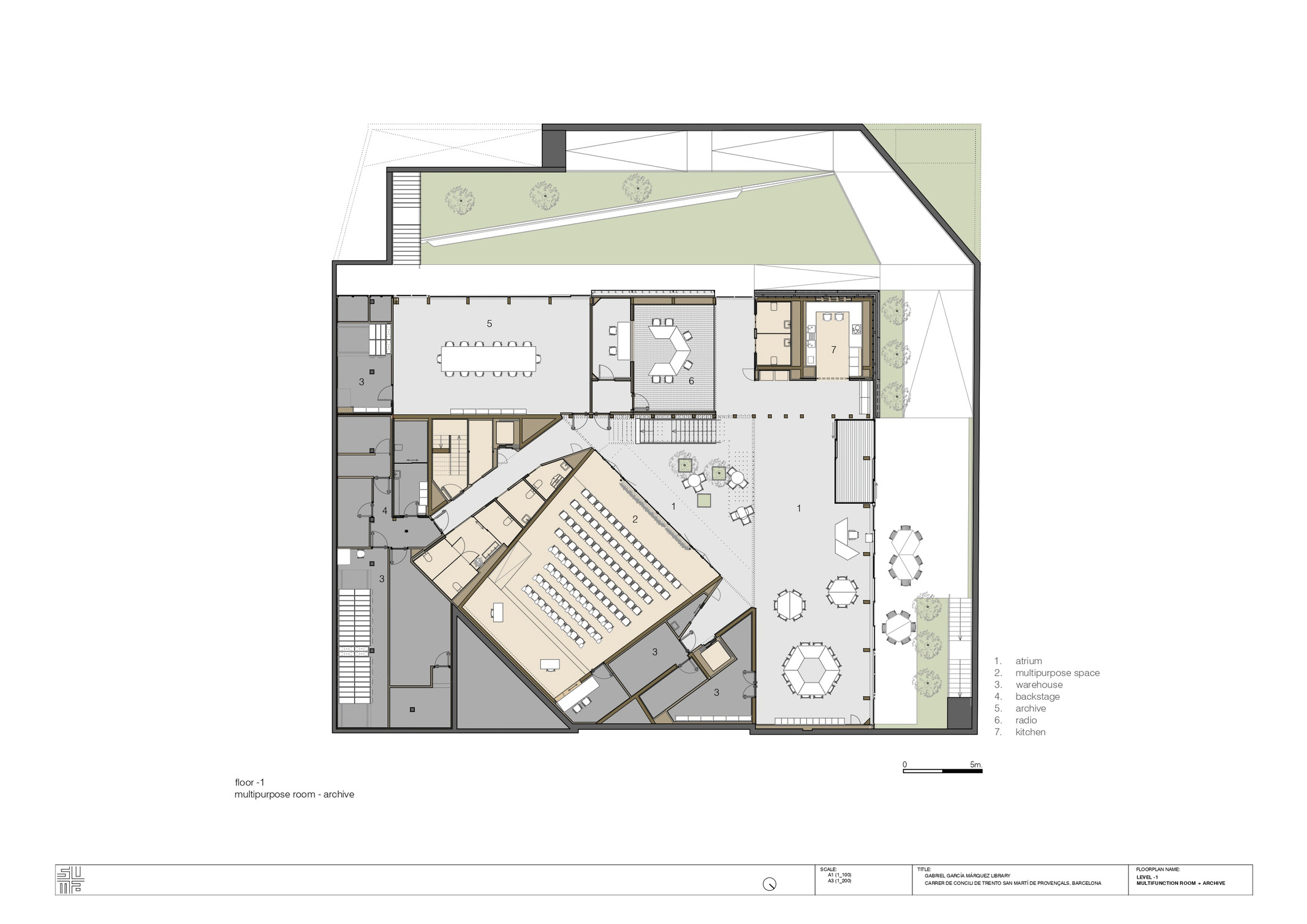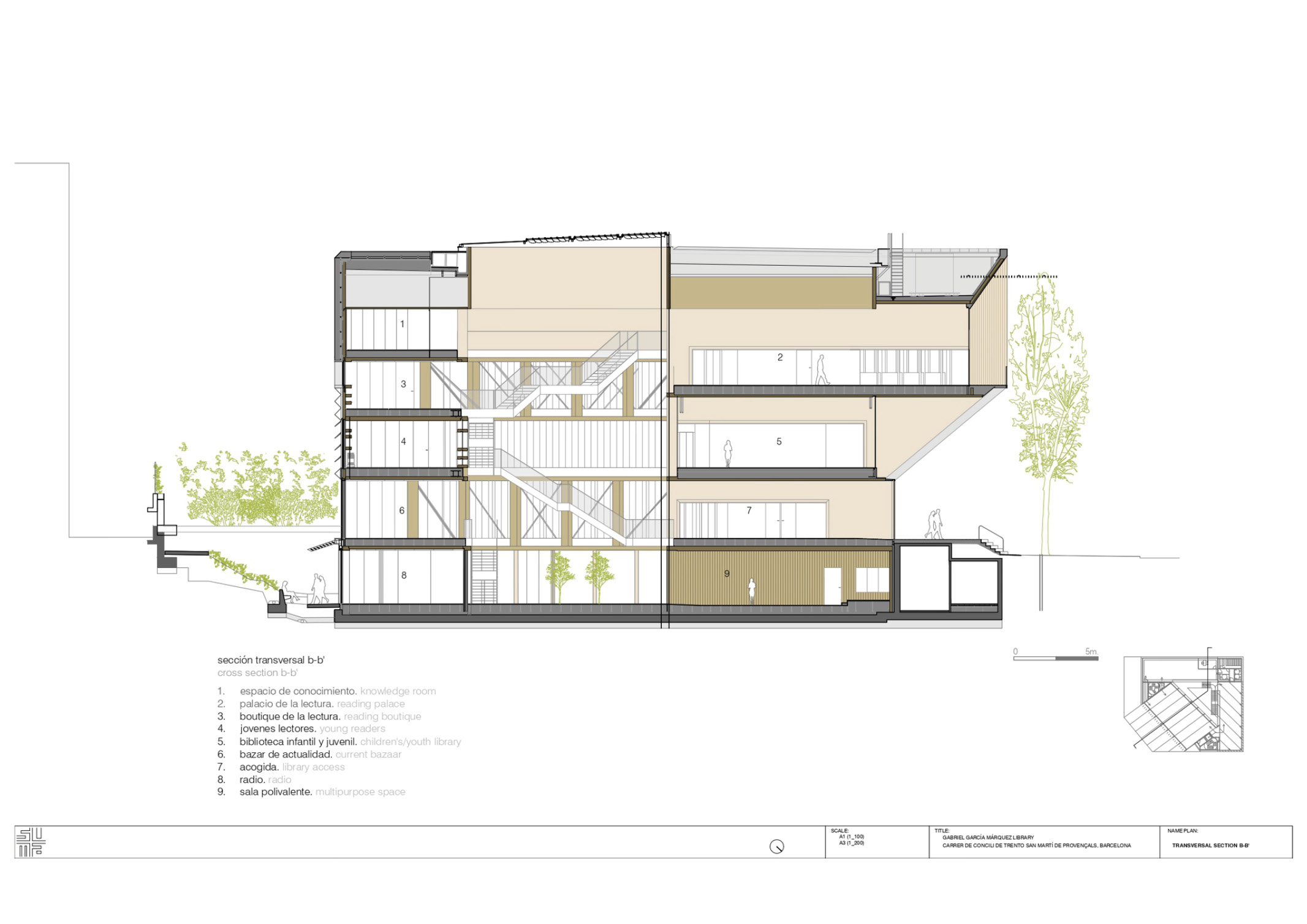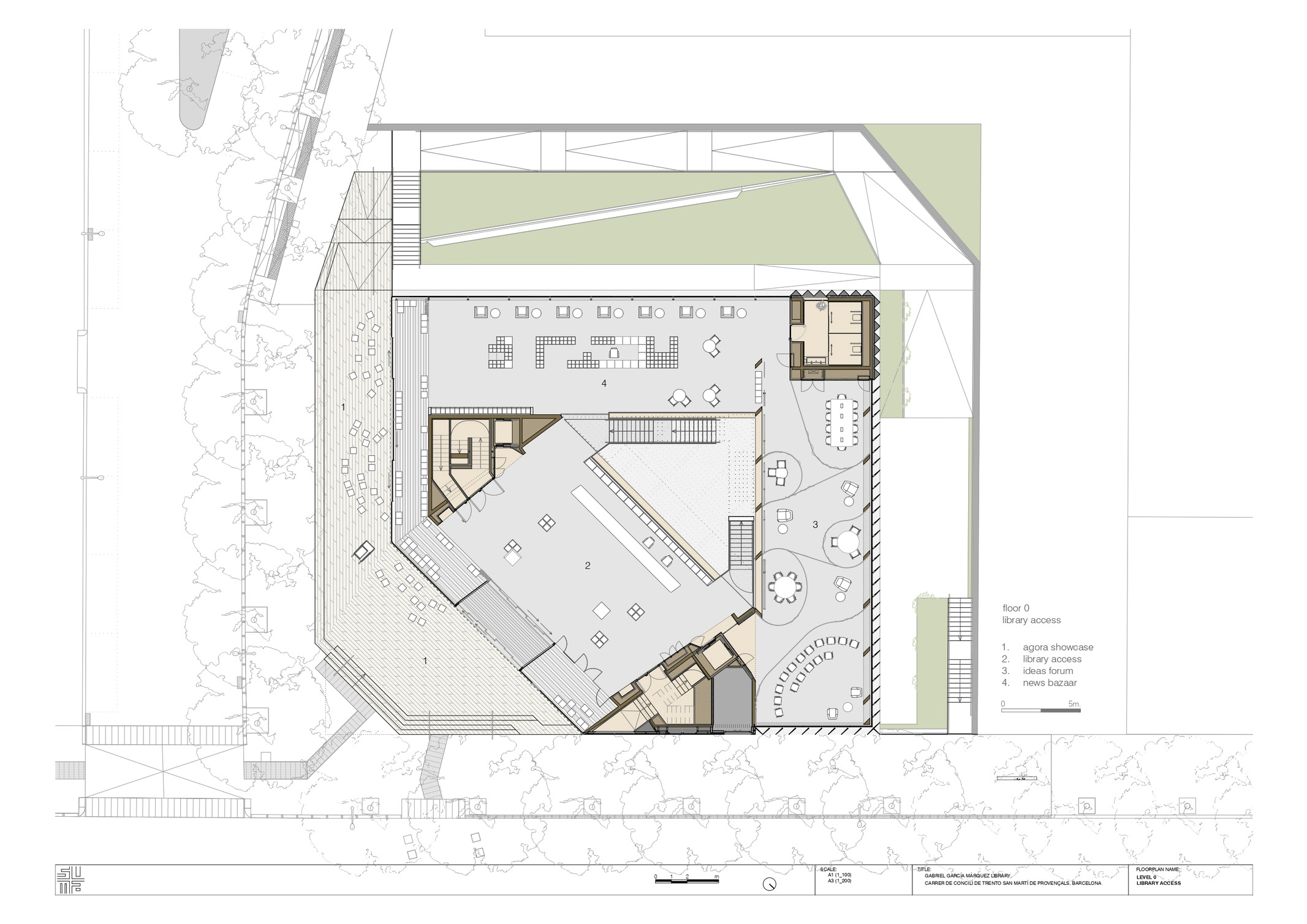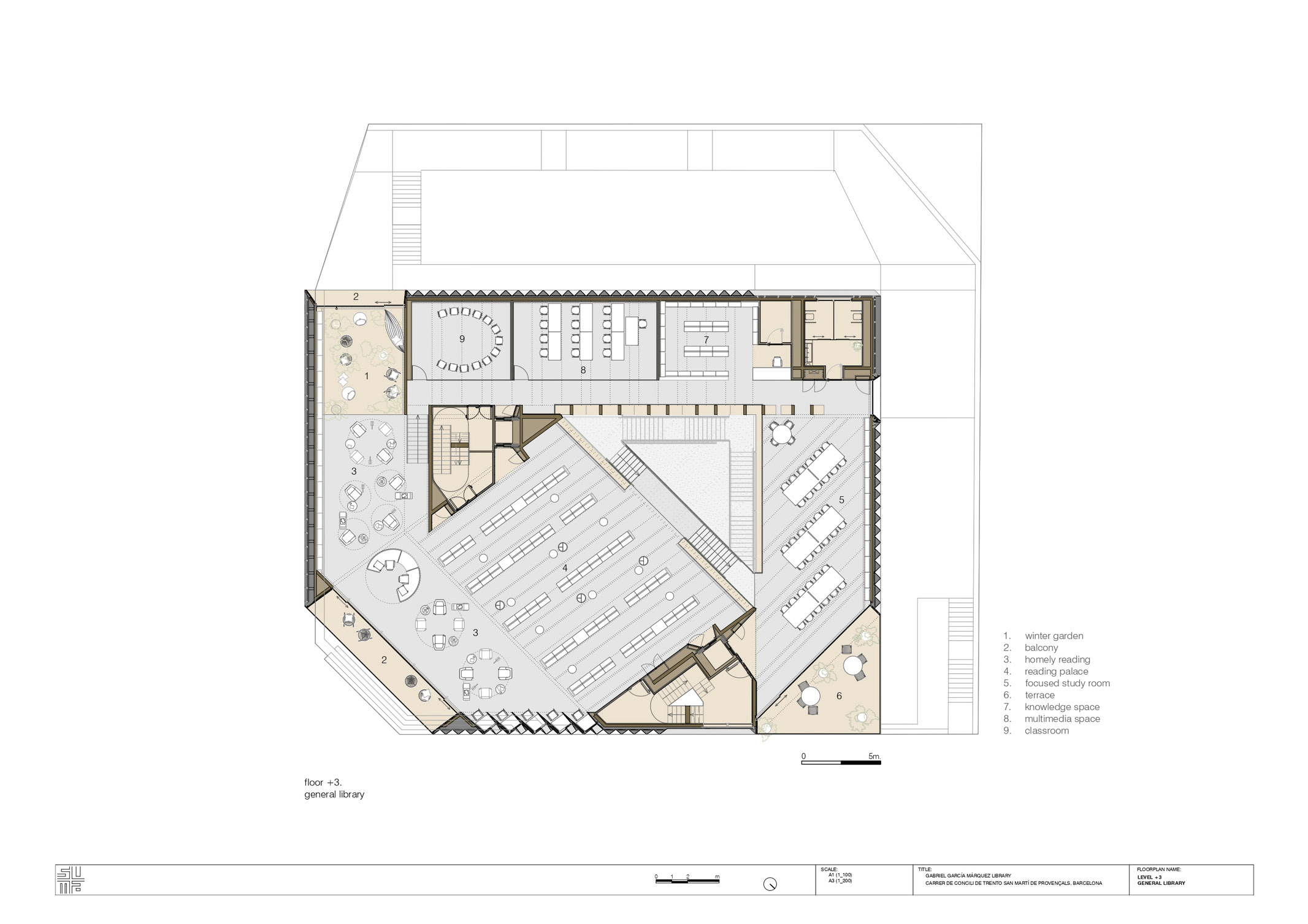 In the Garcia Marquez library, various ecosystems are offered simultaneously that reproduce the conditions of taking the fresh air (in the elevated square agora-showcase), of a gathering (in the space of the ground floor idea forum), of a television set or a theatricalized ceremony (in the extendable multipurpose room on the lower floor), of reading at home, of a spiral of encounters (from the central staircase of the patio), etc. In this way, through the accumulation of the various ecosystems, the public library is configured as a welcoming space where everyone can find their place, their corner. The library is everyone’s home.