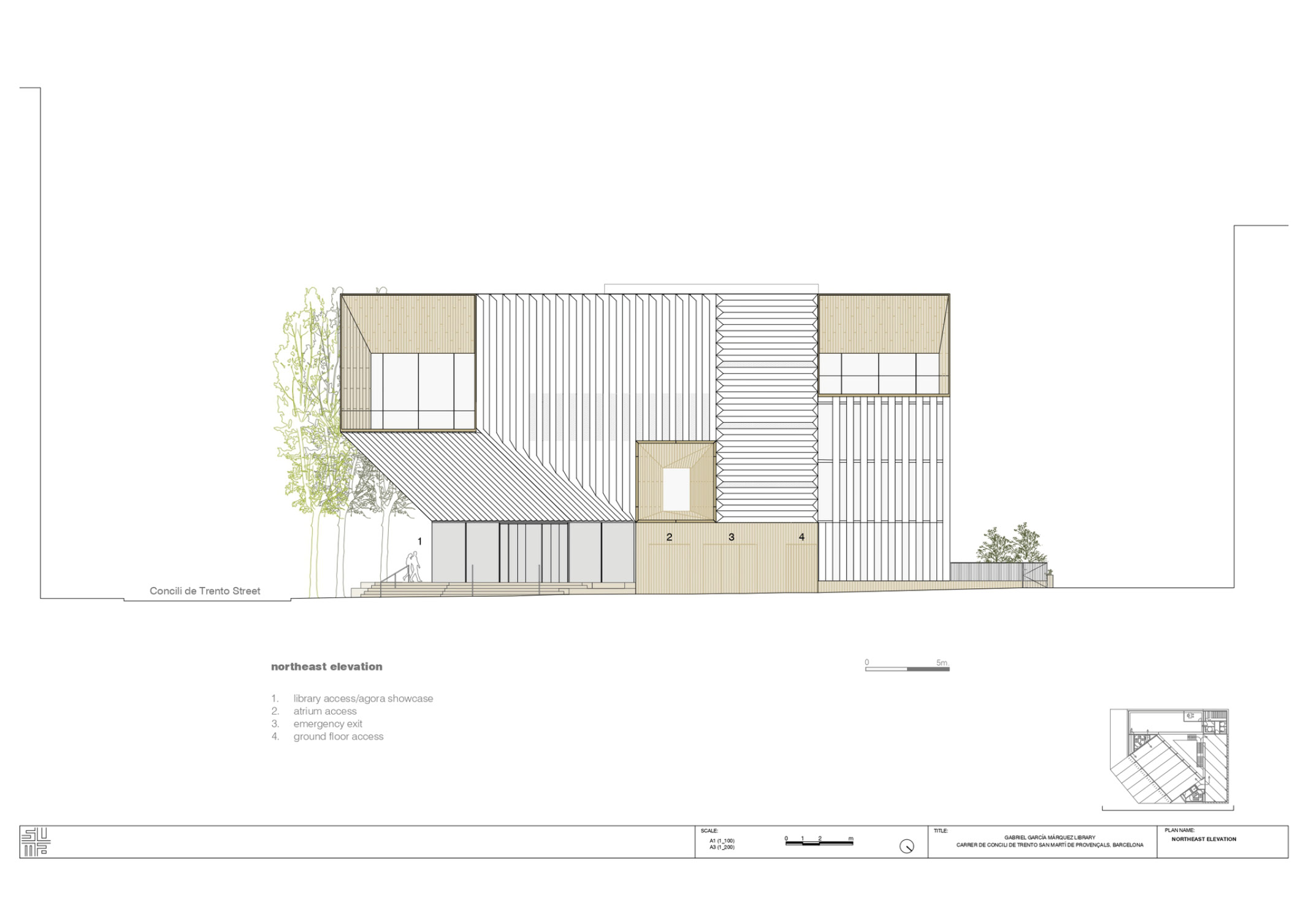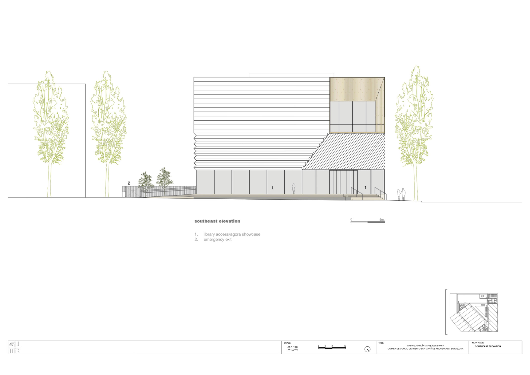 Designed by SUMA Arquitectura, the location of The Gabriel Garcia Marquez Library is precisely this context that causes the geometry of the construction to adapt to the conditions of the environment, replicating the chamfer, a typical urban resource of Barcelona that is consistently found in the surroundings of this metropolis.