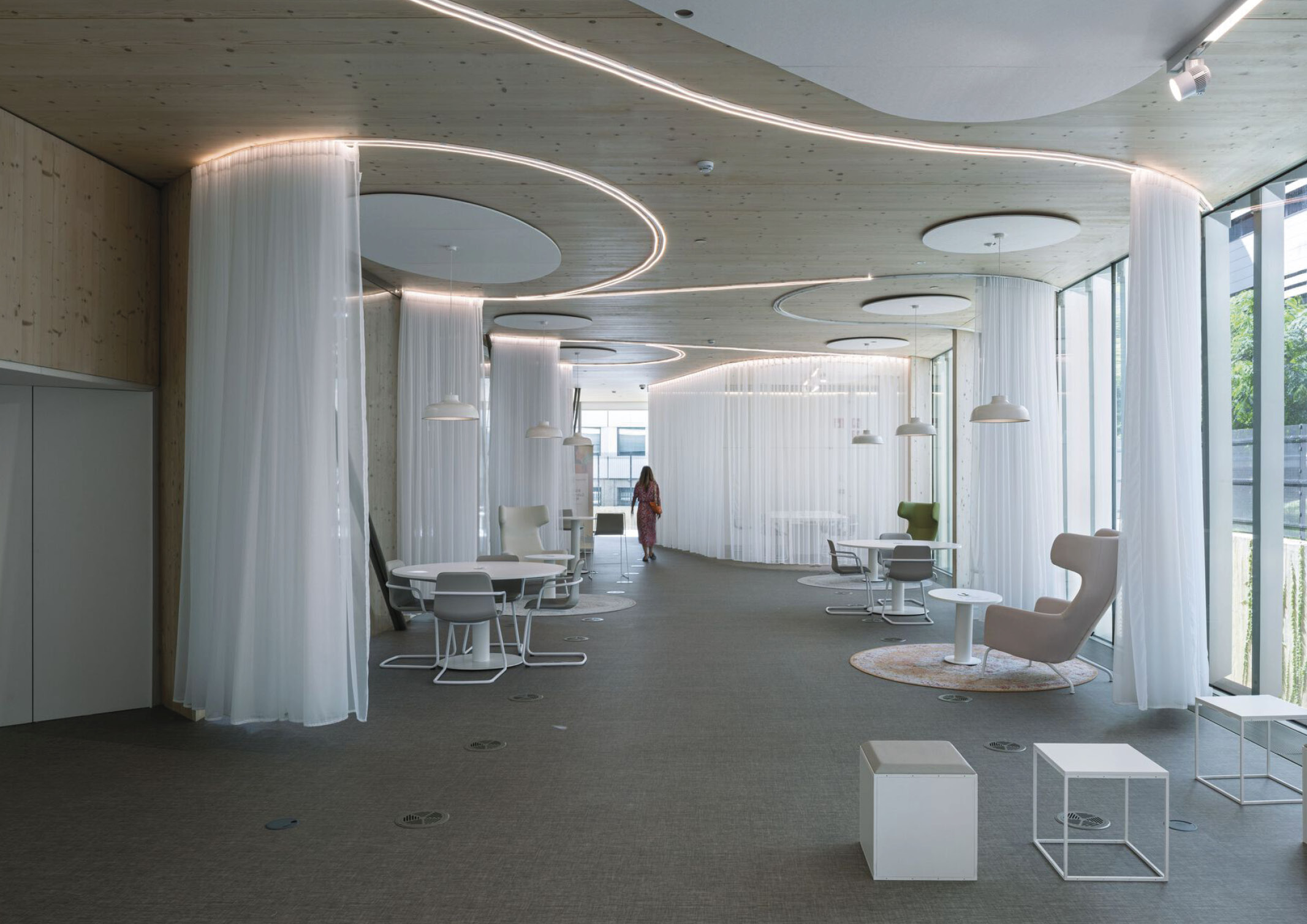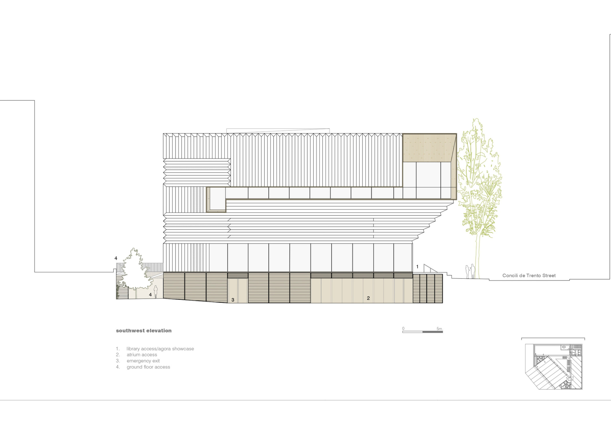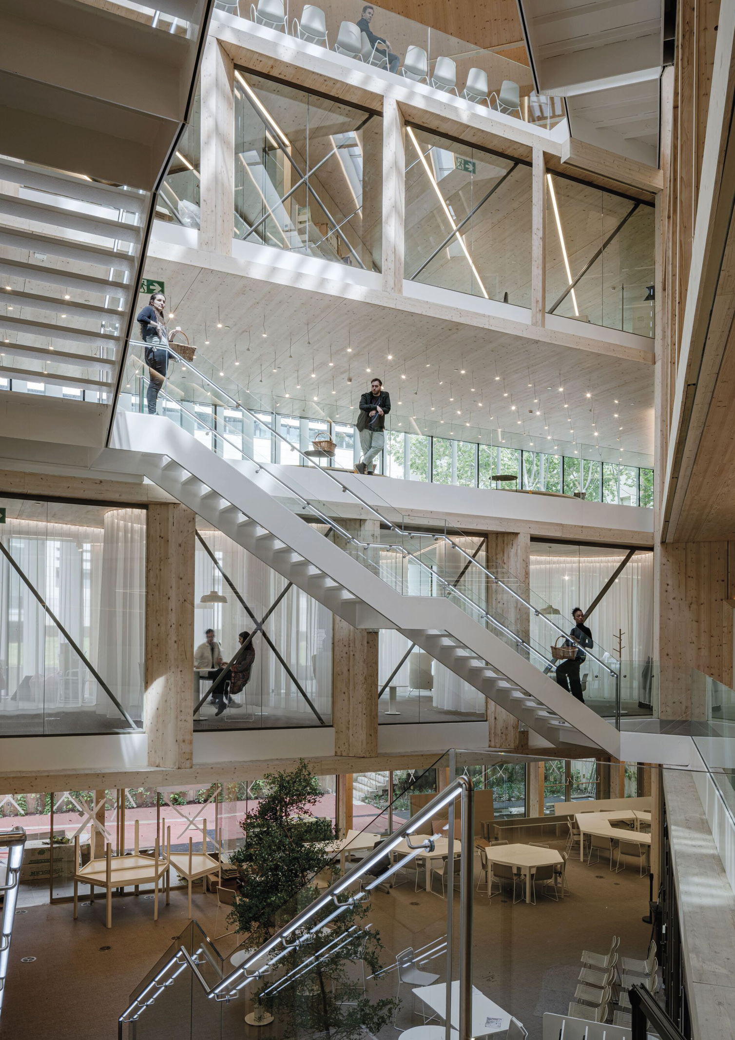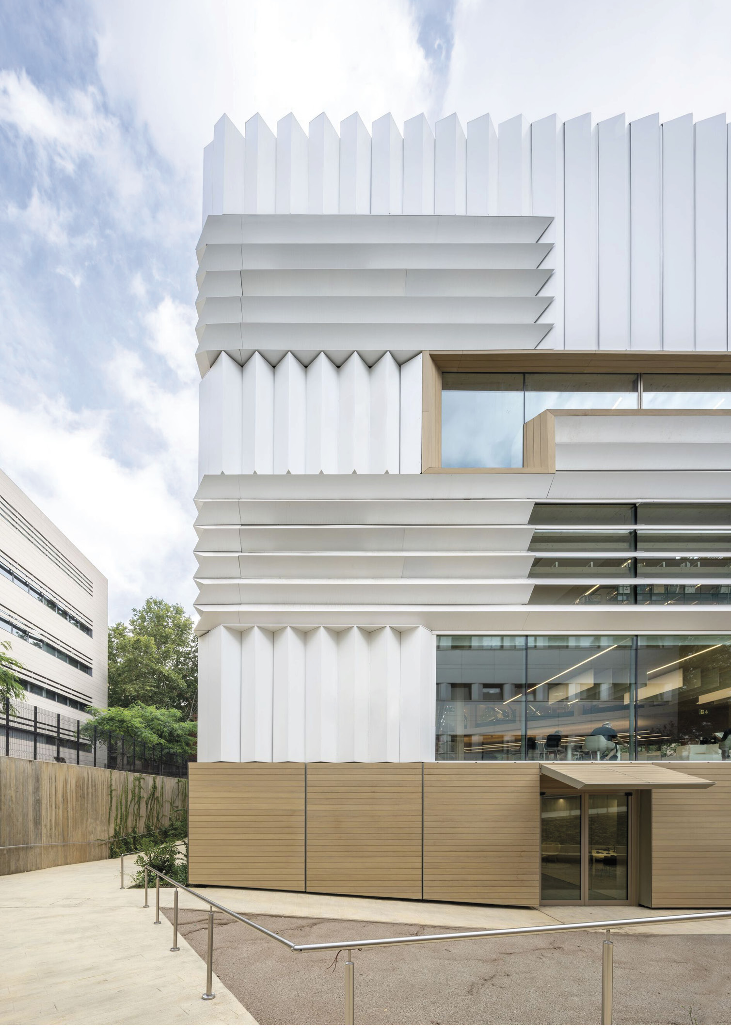 The building resembles a stack of open books with folded and perforated pages. Each “book” is created by a dense structure of wood panels oriented in different directions. Not only do structural requirements define each direction, but also the lighting conditions of the space, its character, the functional program, and its urban connections.