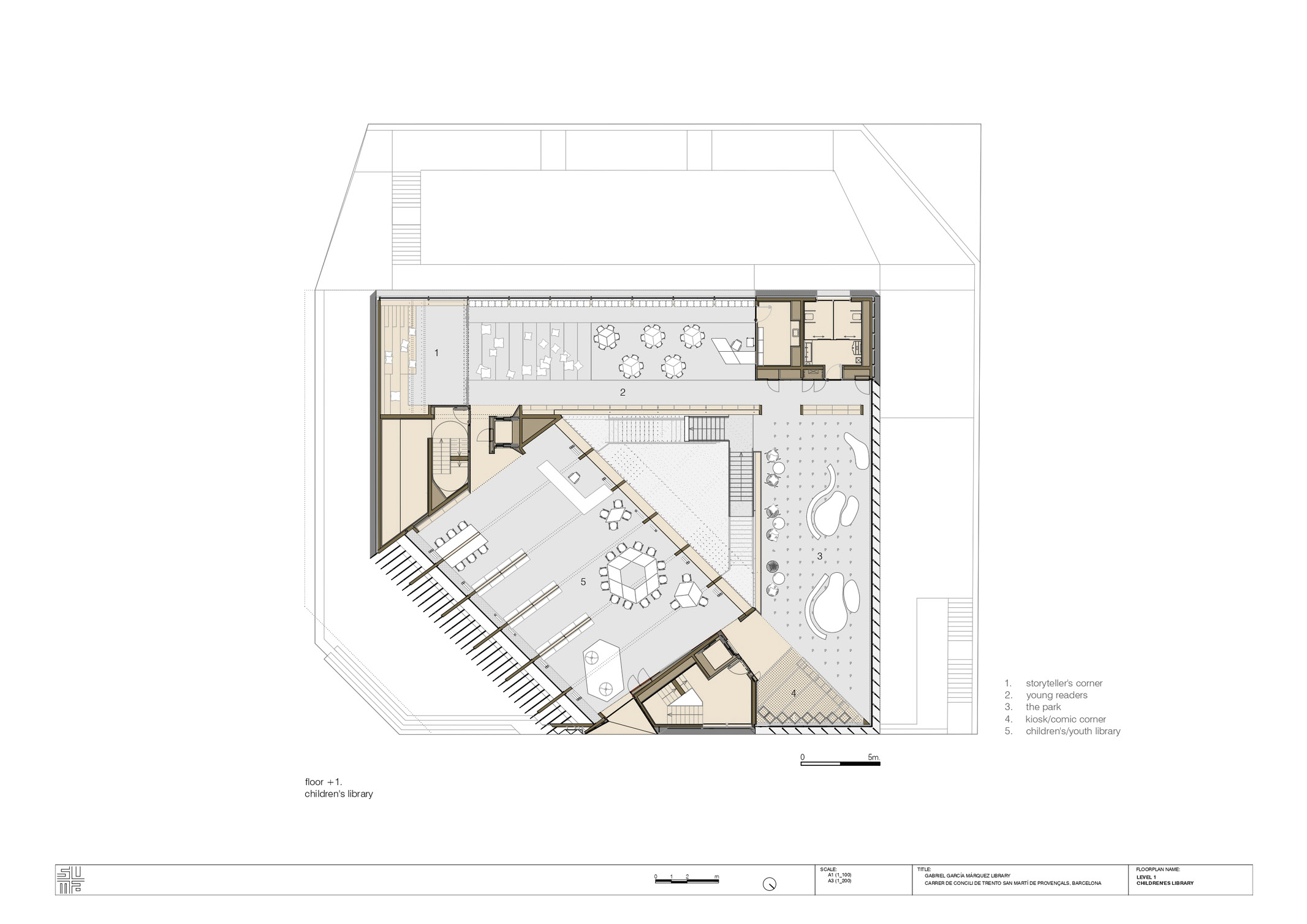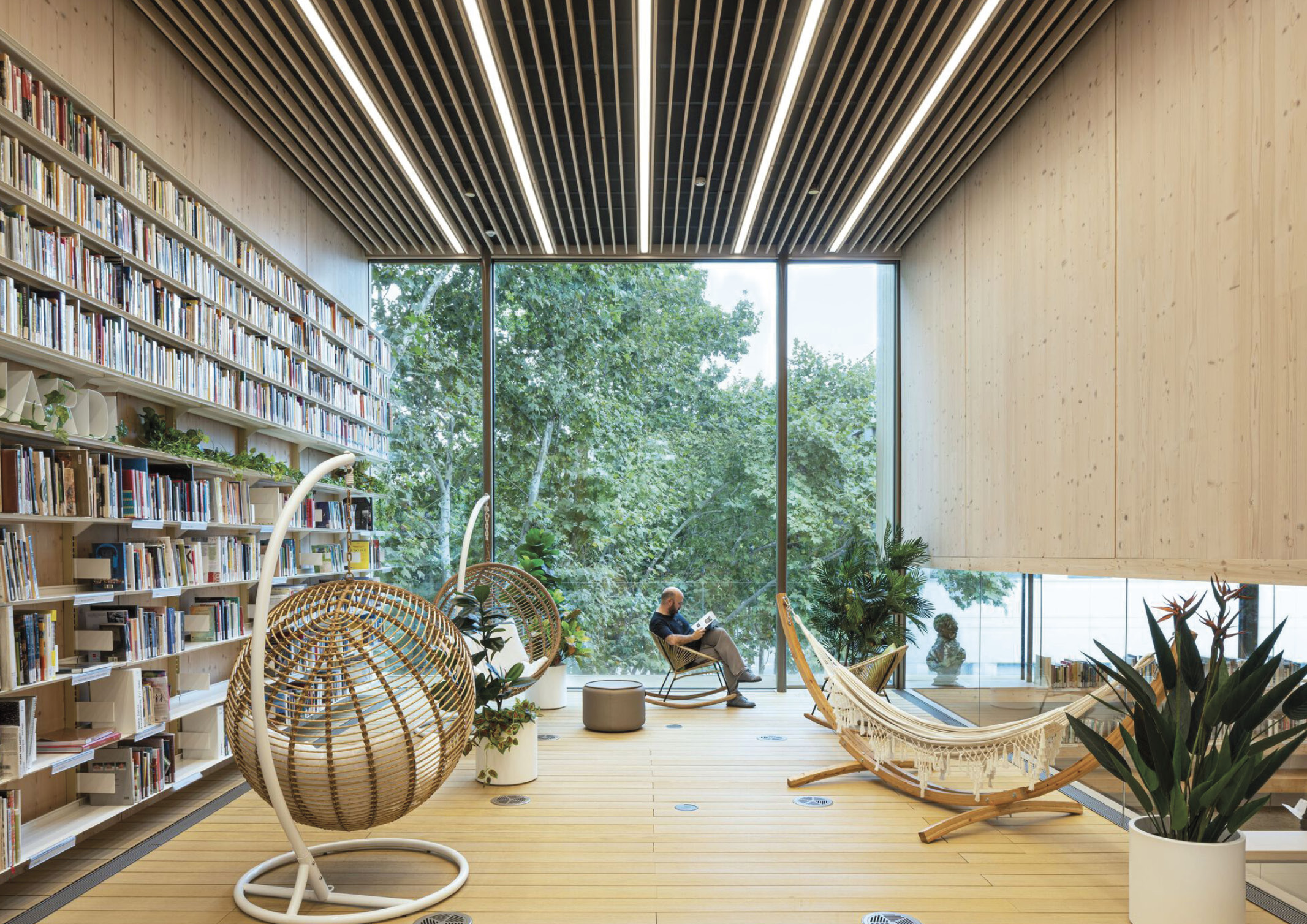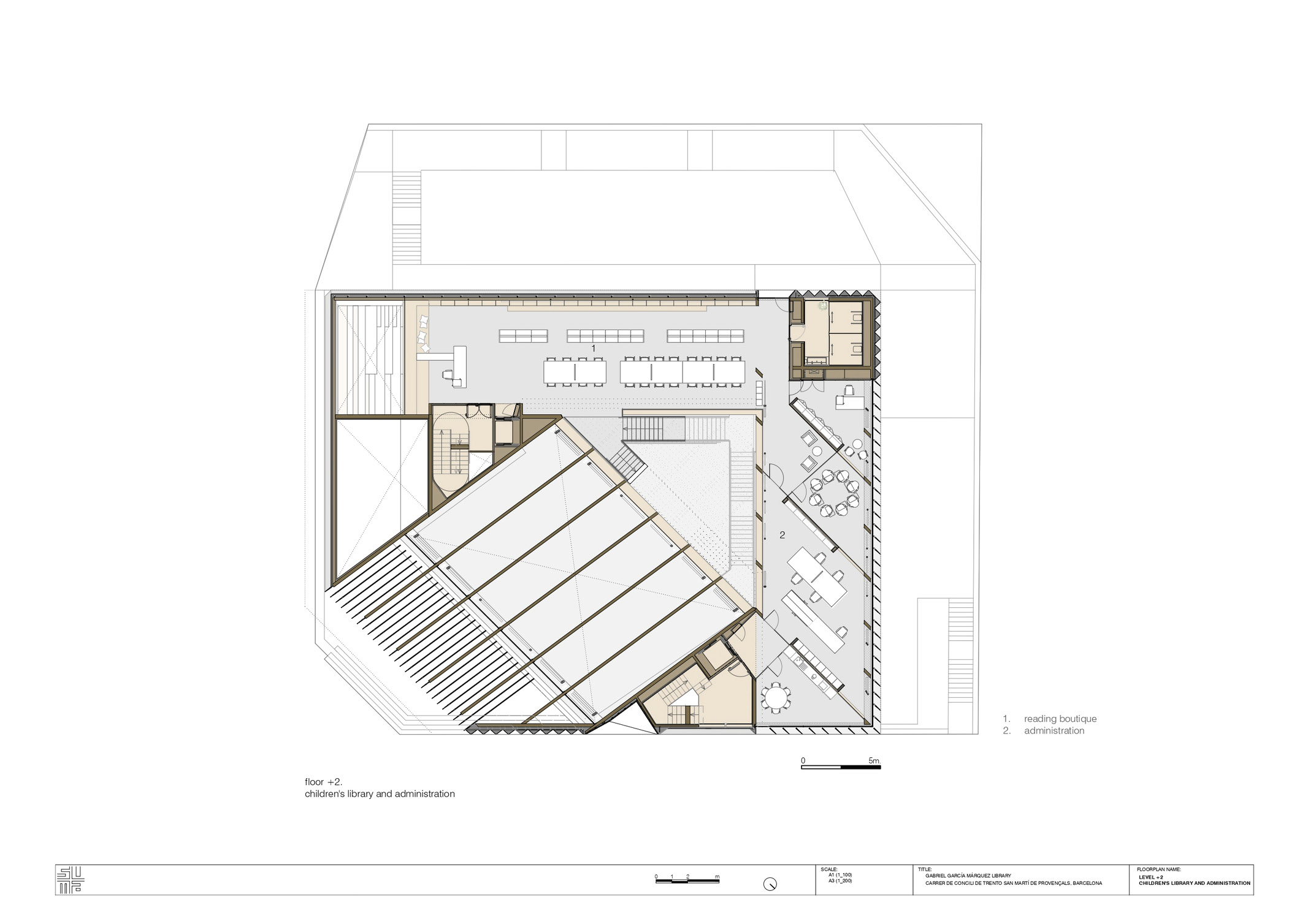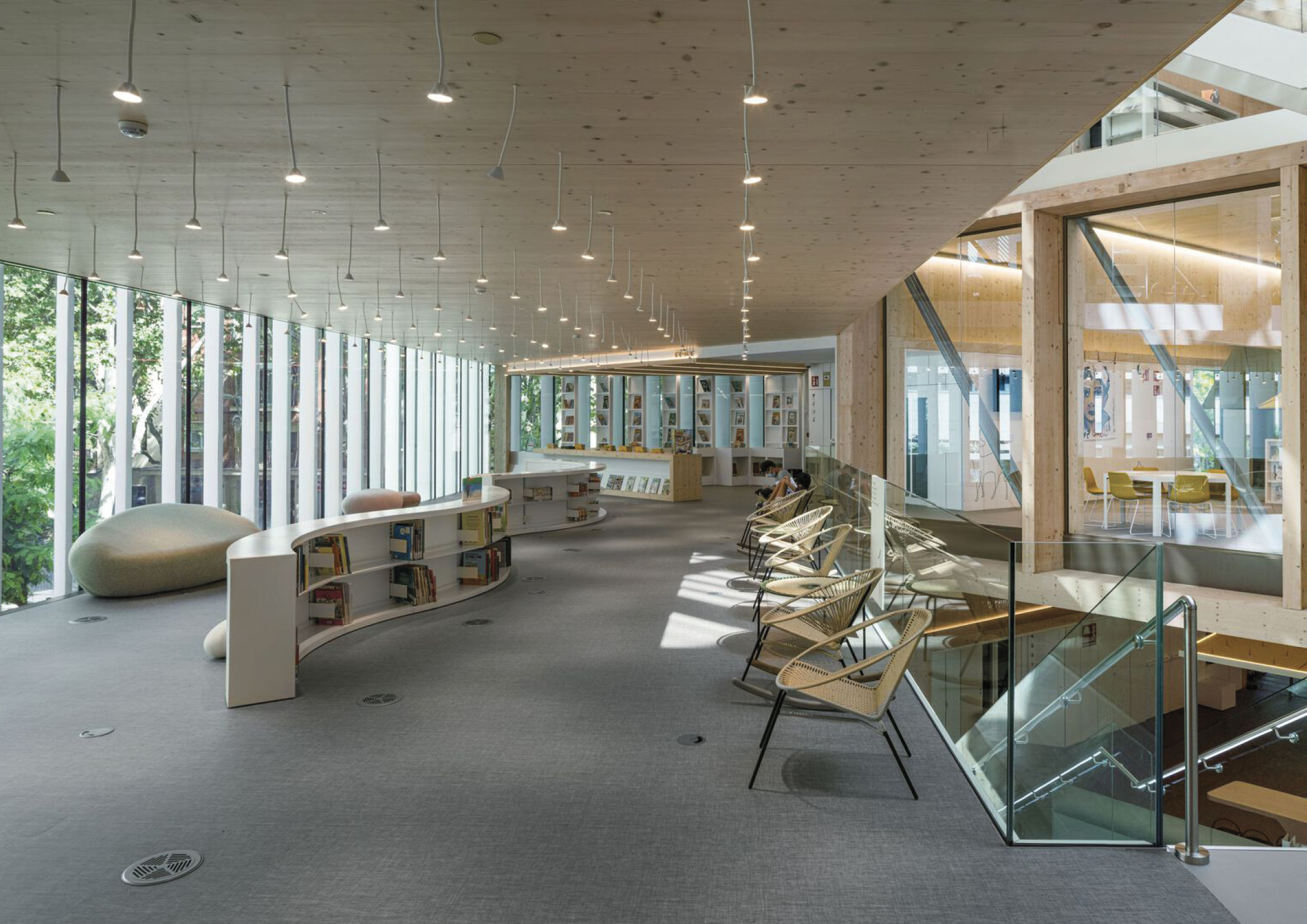 SUMA Arquitectura understands that libraries are the paradigm of public space, which has become social catalysts and condensers. From our point of view, their relevance is not based on the programs and activities that they house and could occur anywhere else, but on the unique spatial intensity of their qualities as an ecosystem. Thus, the team assumes that the architecture in general of the library is directly related to the furniture, the program, the collection, and the users.