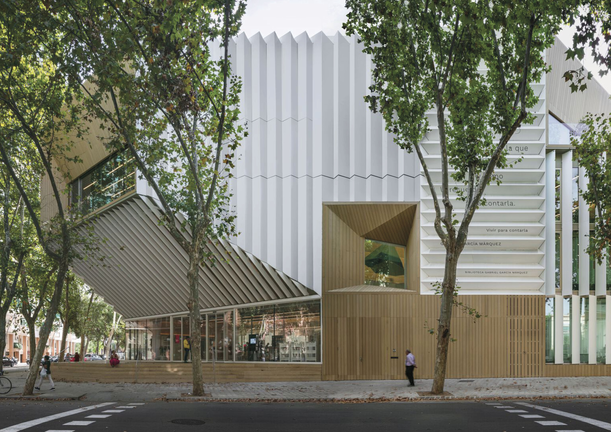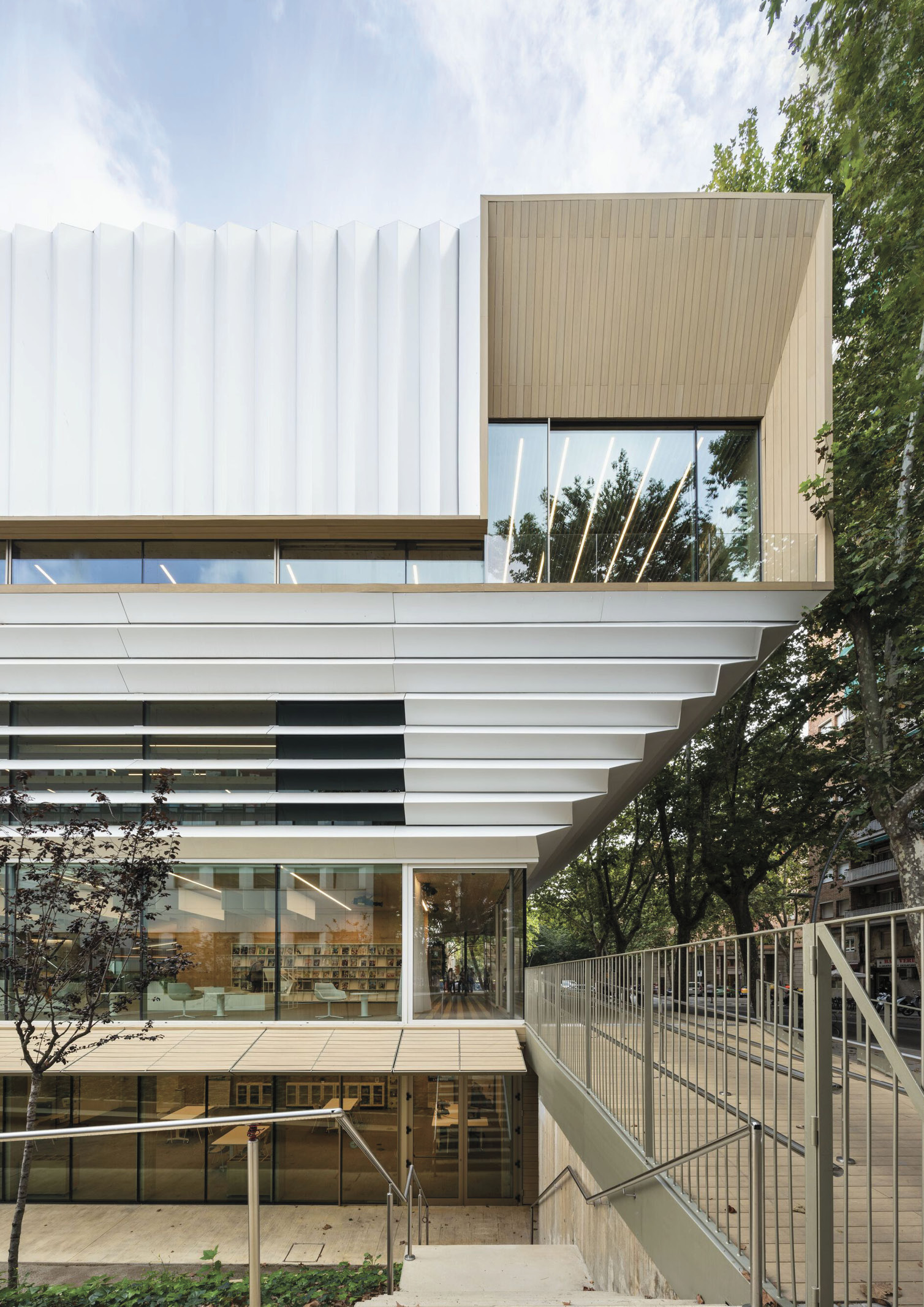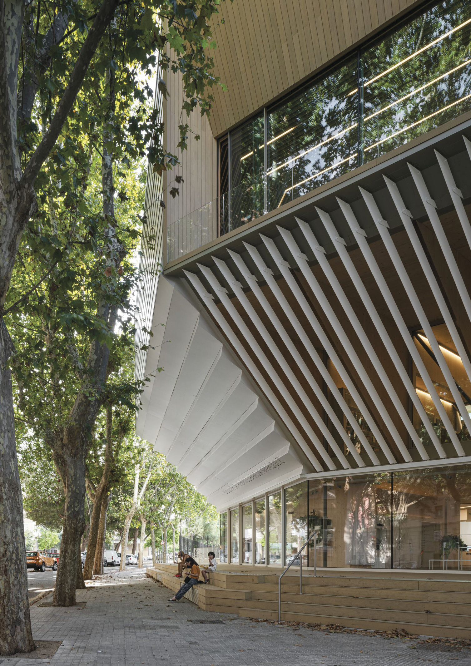 The architect explains that the building appears as a sculptural solid, settled on a raised square that allows fluid pedestrian circulation through the cultural axis of the neighborhood. The library rises cantilevered over the open area, creating a porticoed square delimited on the other side by the existing magnificent trees. Along the white solid, four viewpoints open that focus the views and direct the gaze toward the great attractors of the environment. These cuts allow the comfort and cozy atmosphere that develops inside the library, thanks to the wood that provides its warmth to the whole with great aesthetic appeal, to be expressed towards the exterior, integrating with the urbanism of Barcelona.