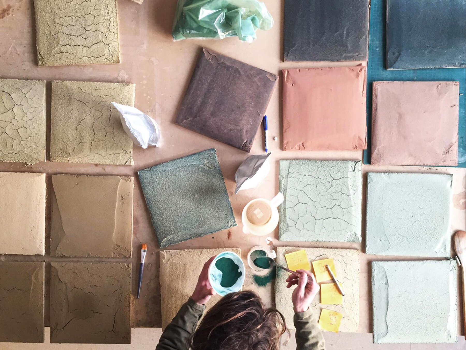 These algae-stained plaster prototypes line the bathroom walls of Le Magasin Électrique. Image by Laurens Bekemans.