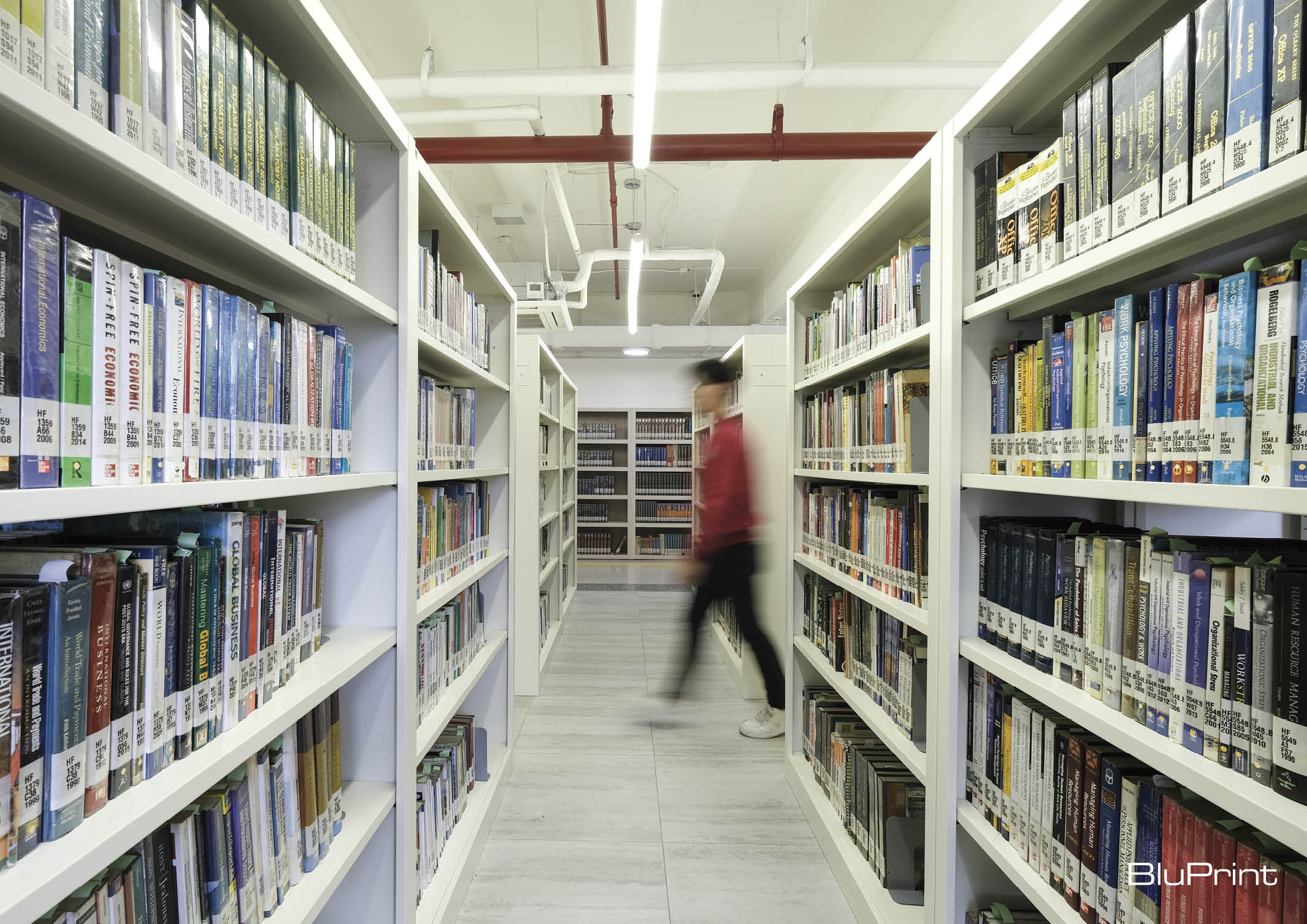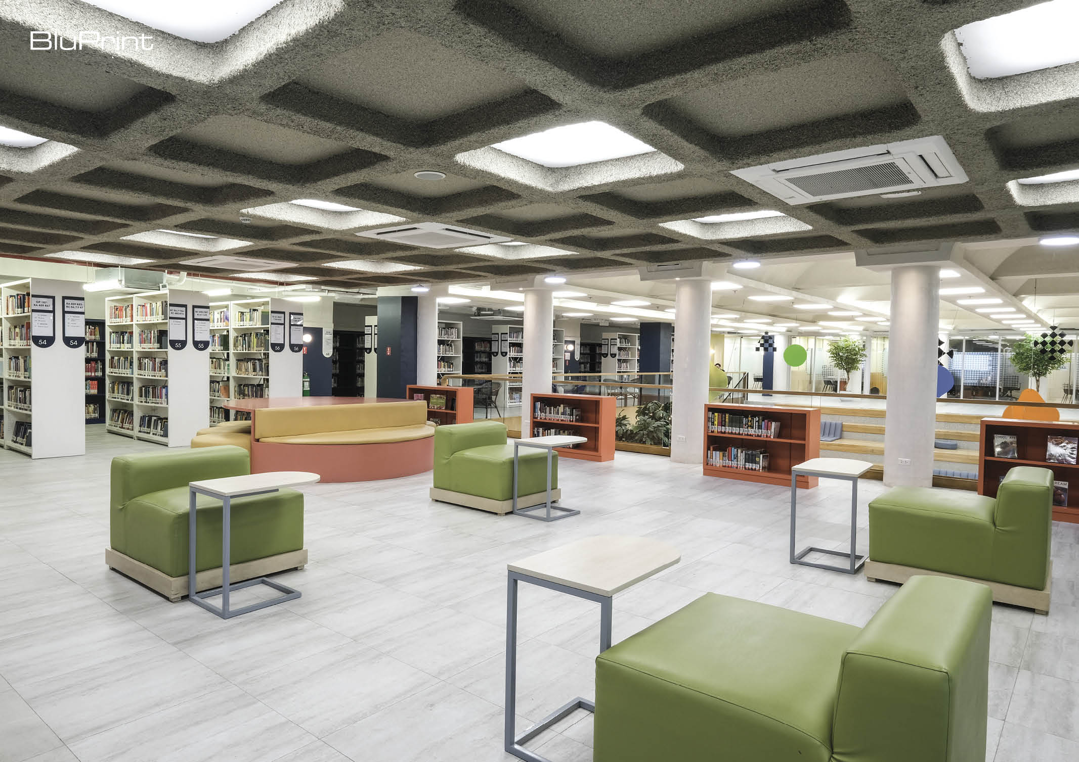 When you enter the library, the first thing you will notice are the colored corridors which vary each floor. The first floor is an open space where the university can host small events or academic activities. One side of the room is a lounge area which soon will be converted into a cafe where students can hangout over a cup of coffee.