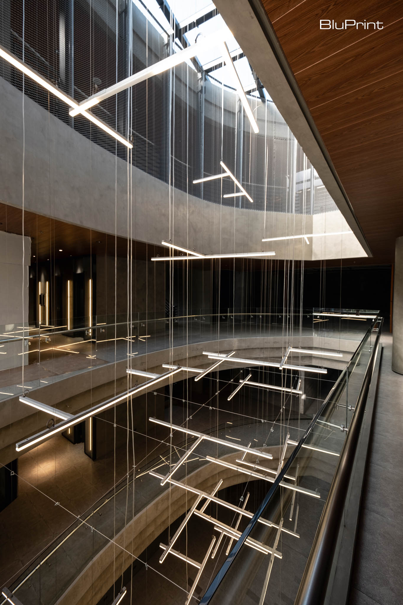 The lighting fixture at the atrium—which Hernandez’s team calls “light shards”—filters natural