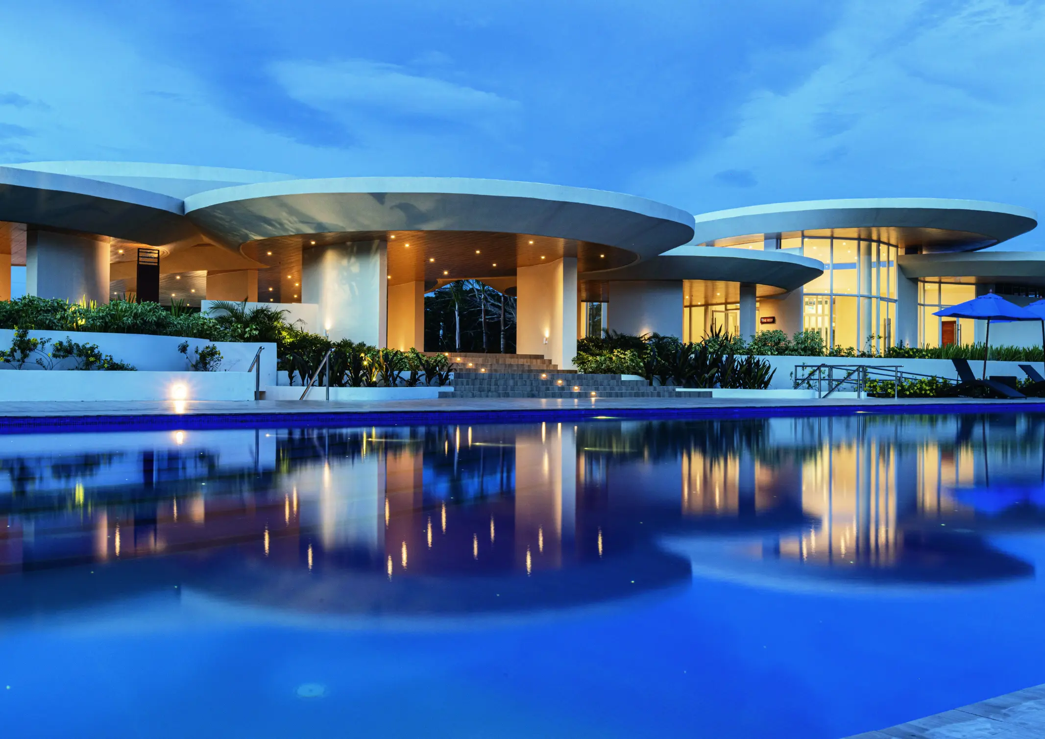 As dusk settles, the clubhouse undergoes a dramatic inversion. The roof forms, once silhouetted against the sun, absorb the deep blue of the twilight sky. The same transom gaps that drew in daylight now radiate a warm, internal glow, transforming the structure into a luminous beacon on the coastline. Below, the developer’s signature pool lights stud the water’s surface, creating a terrestrial constellation against the dark sea.
