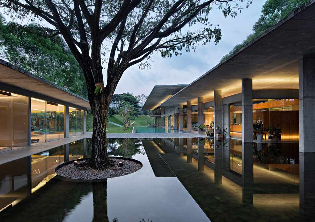 Andra Matin was able to create different degrees of openness because of this feature but there are also cons to using glass as much as he did for the IH Residence. The fragility of glass is the biggest con in using it as a partition or an enclosure to large areas. The bigger the glass, the easier it is to break. Given that there are tempered glass types that are exponentially sturdier than normal glass, it does not take away the chances of it breaking with a massive force. Architect Matin was well aware of this so he protected the sides of the house with a large concrete perimeter wall and sloping gardens. If you notice, the house is lower than the edges of the garden and this doesn’t not only serve as a design aspect but also a safety one. Because of the lowered elevation of the house, strong winds or flying debris in a natural calamity is less likely to strike the house because the winds would be redirected by the slopes and blocked by the concrete wall.