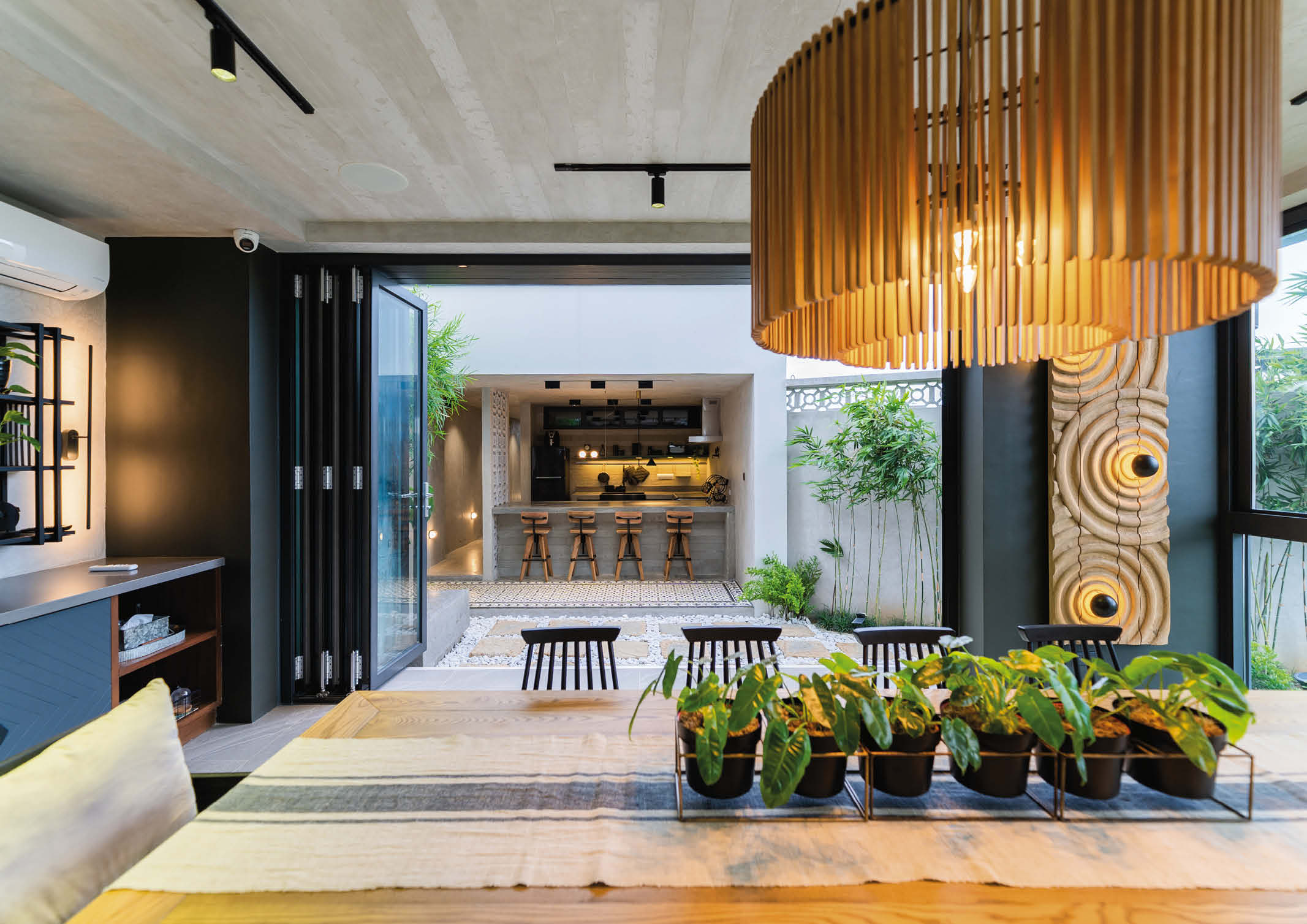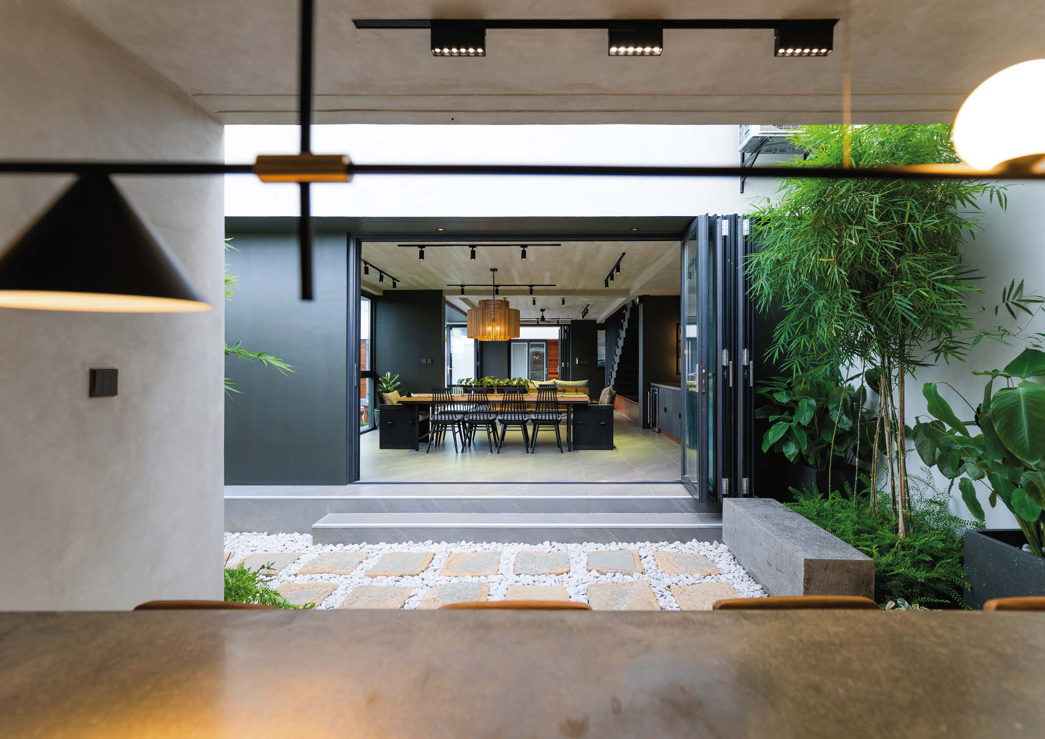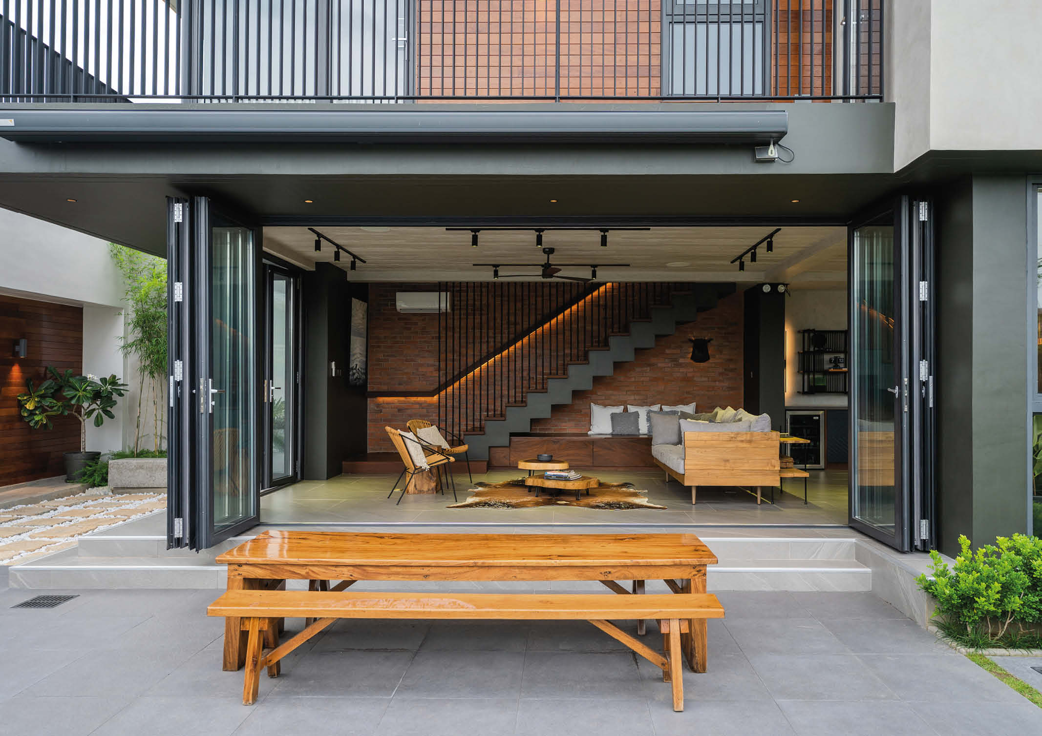 “We used full length bi-fold doors on three sides to really open up the space. Complementing grey tiles were used to visually connect the indoor with the outdoors. And while being visually connected to the outdoors is important, we chose double pane windows and doors for sound isolation. Aside from having better thermal insulation critical for a south south-east facing structure, we also considered its good sound insulation qualities for different situations that the space maybe used.”