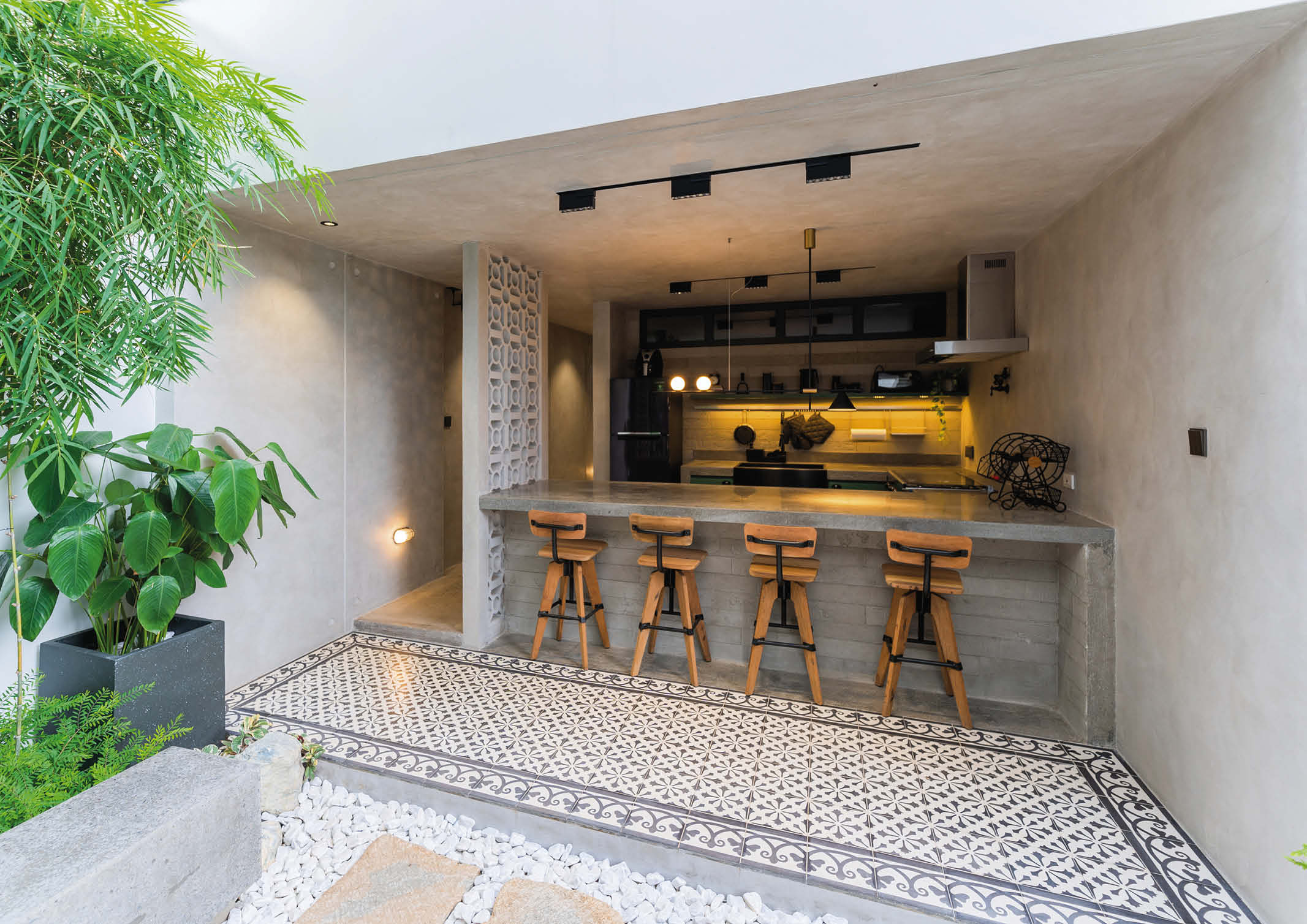 Casa Peñafrancia is furnished with a full outdoor kitchen and bar finished in polished concrete for easy maintenance and longevity. Machuca cement tiles in the bar area complement the concrete floor and create a visual variety. Additionally, portions of the wall were constructed with ceramic blocks to improve airflow and reduce humidity in these areas. A corridor parallel to the outdoor kitchen and powder rooms leads to the second casita’s entry courtyard. The second casita was originally intended to be a storage space, but was converted into the property’s largest ensuite, which can accommodate eight to ten guests. The entry courtyard and minimal window placement on the south-southwest side of the area help reduce heat gain from the afternoon sun.