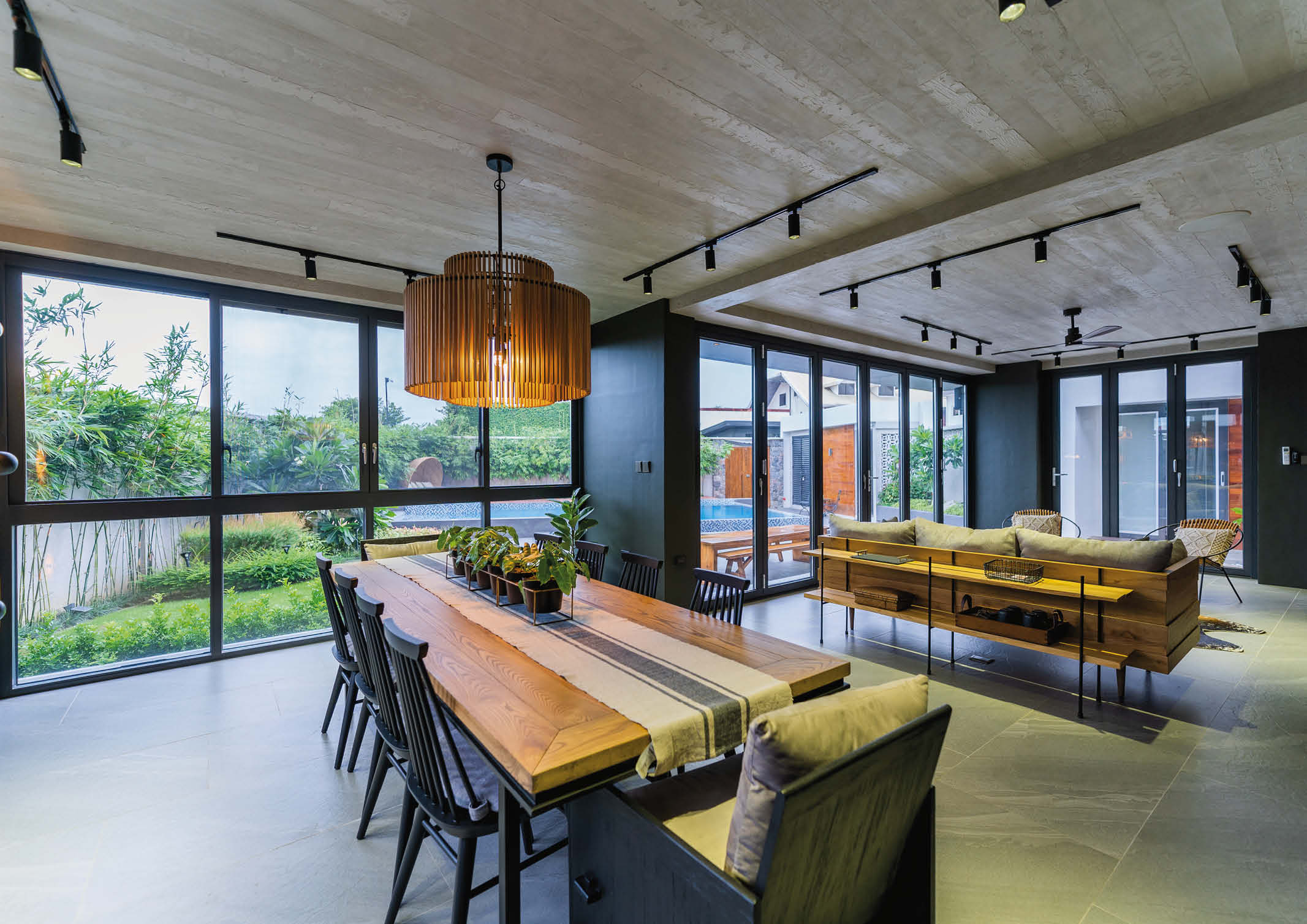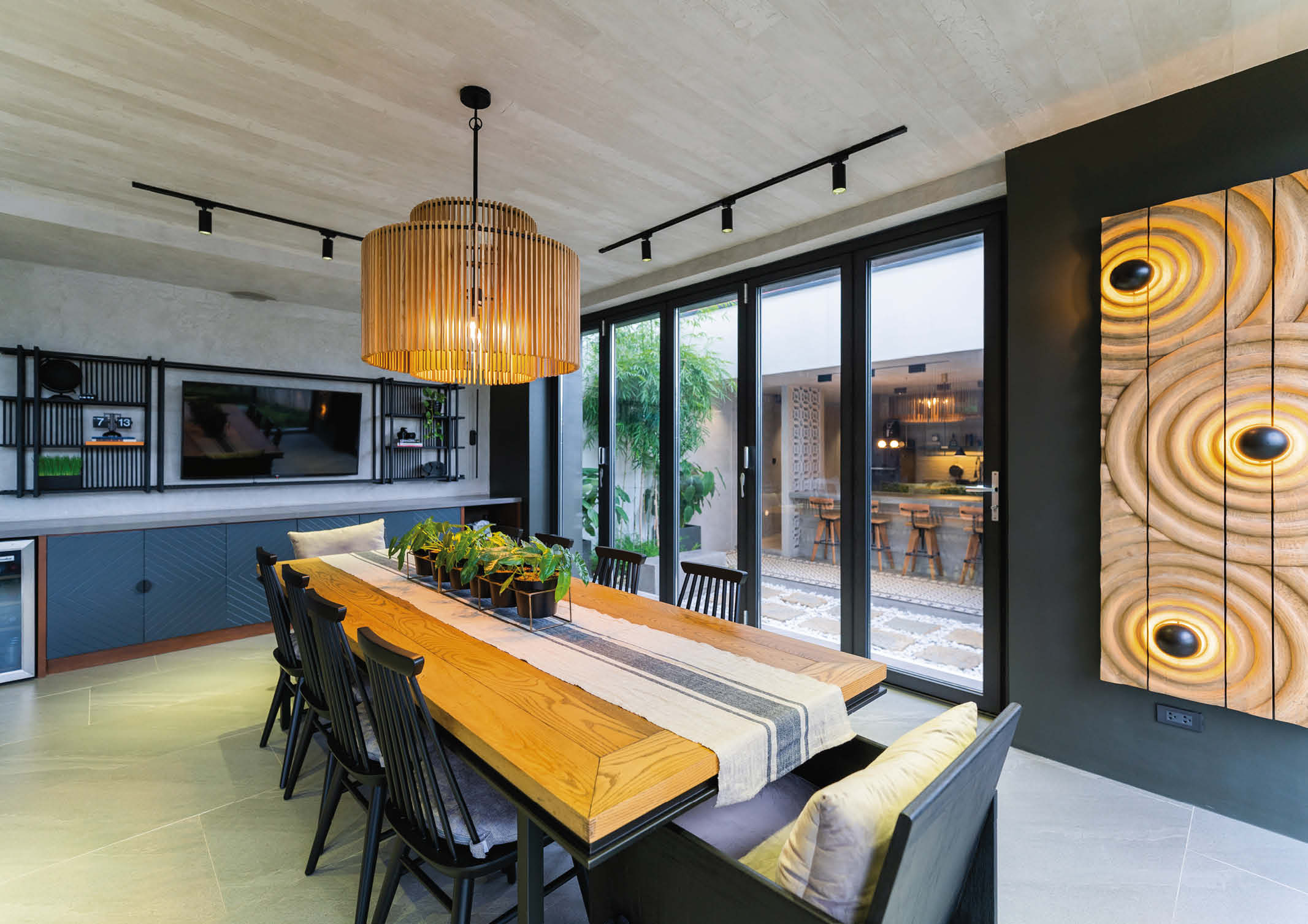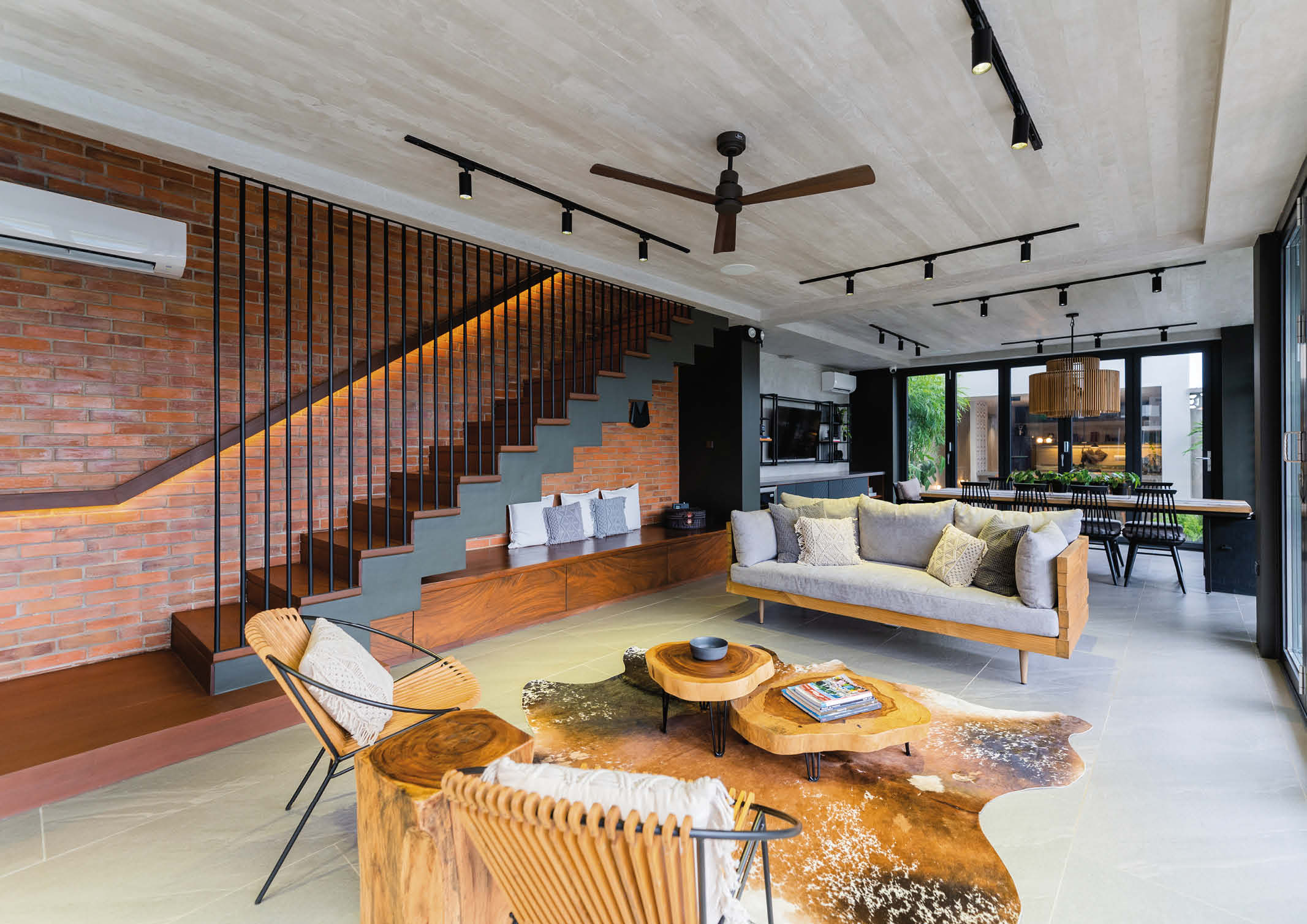 The ground floor features an open floor plan with a commanding view of the pool and gardens. The focal point upon entry would be the stepped soffit stairs against the double-height brick wall. This side of the wall is elevated by a custom built buffet table with quartz countertop and a built-in wine chiller. It conceals the entertainment system, internet modem, and electrical panel board. Furthermore, a modern ten-seater farmhouse dining table with a pair of “kabisera,” reminiscent of old movie theater seats, adds character to the space.